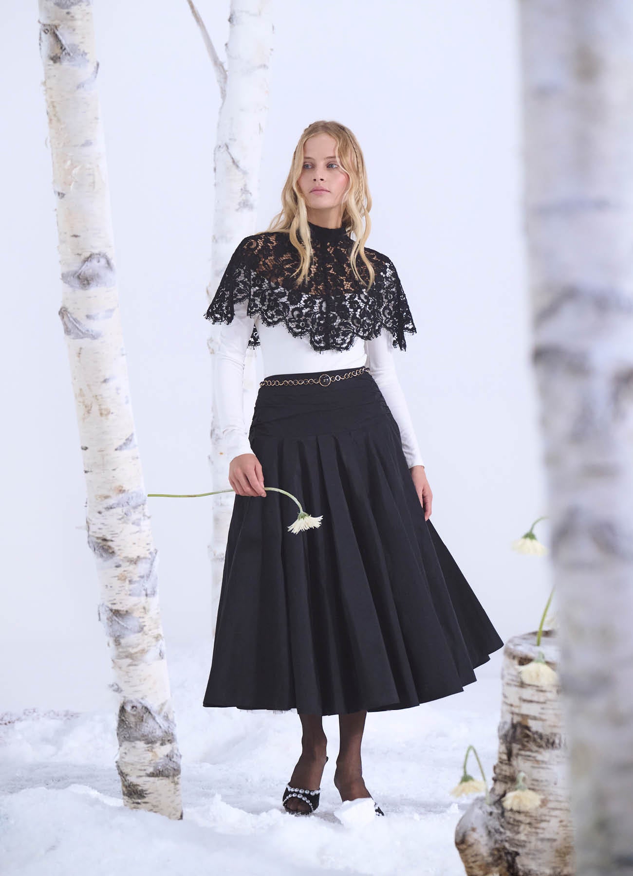 Жакет со съемной отделкой из натурального меха норки и юбка-трапеция из премиальной креповой шерсти. Сочетание красного и белого цвета – одна из основ эстетики a la russe.