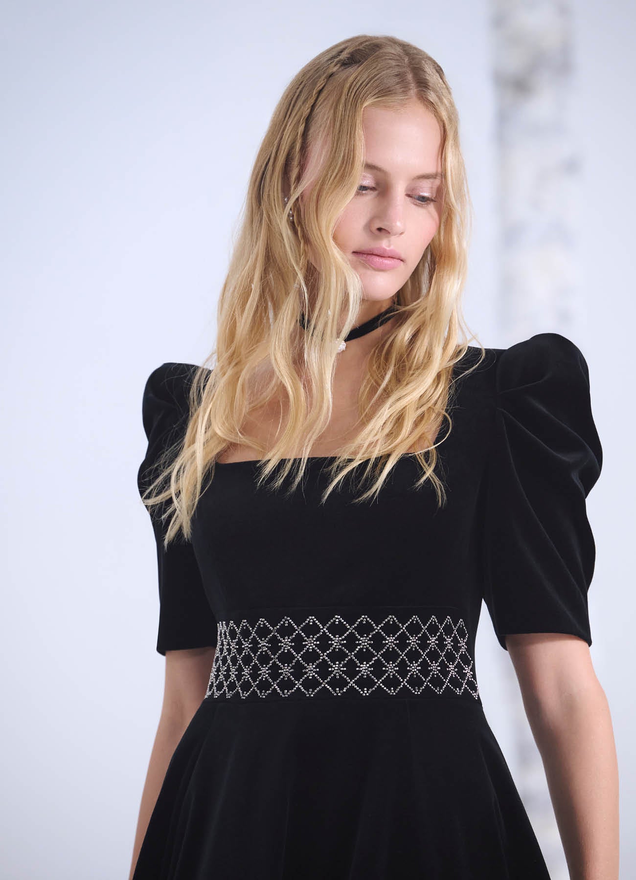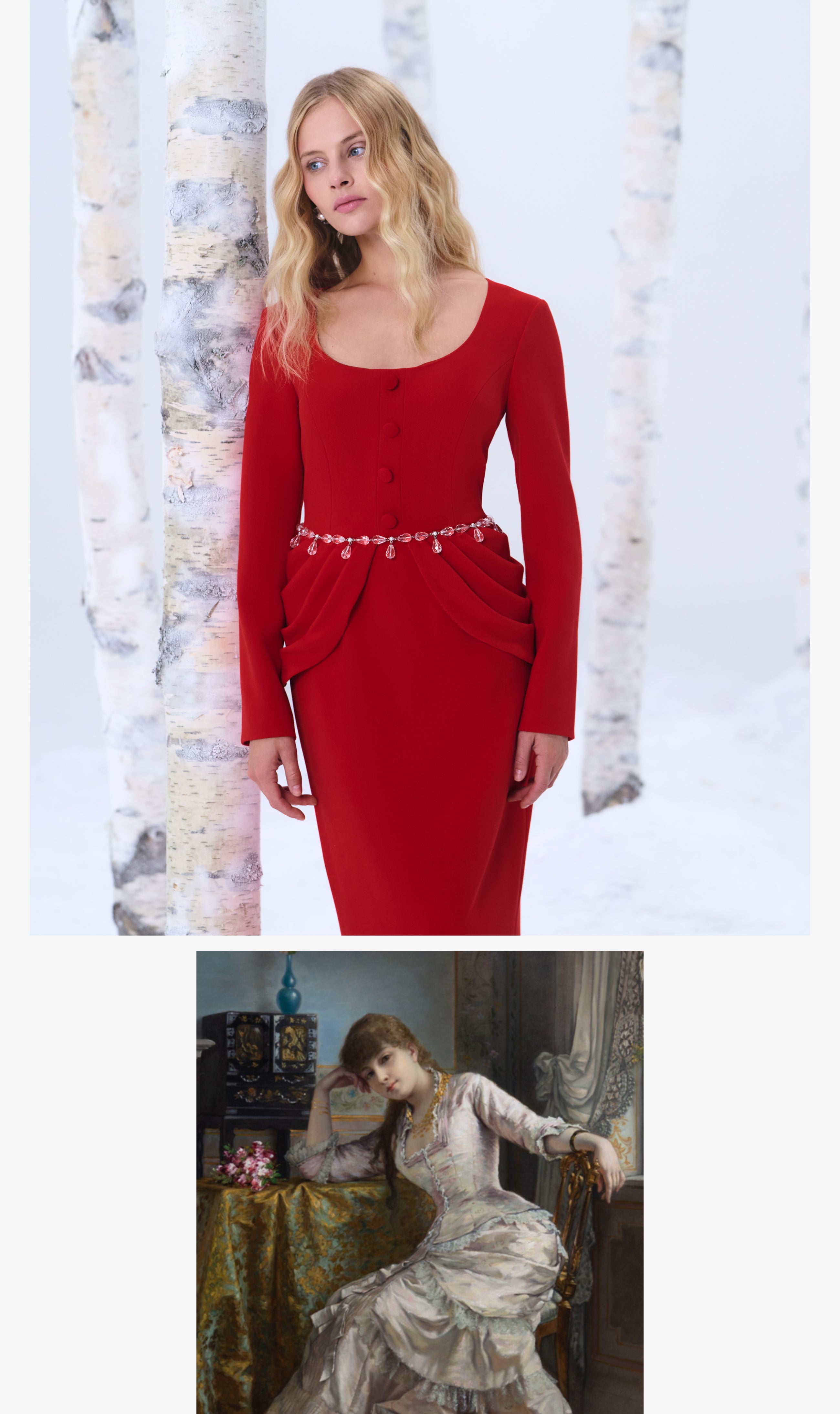 Платья из костюмной ткани с декоративной баской-драпировкой, аккуратно собранной на бедрах. Отсылка к дворянским силуэтам 19 века и элегантный округлый вырез, демонстрирующий зону декольте.