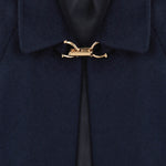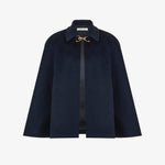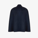 Элегантный кейп глубокого темно-синего цвета из шерсти и кашемира. Мягкий и тёплый материал обеспечивает комфорт в прохладную погоду. Модель с отложным воротником и акцентной застёжкой золотистого оттенка. Свободный крой позволяет носить кейп поверх рубашки или тонкого свитера, сохраняя свободу движений. Универсальная деталь гардероба в классическом стиле. На подкладке.