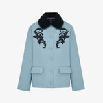 Воротник дополнен отстегивающимся элементом из натурального меха норки. Объёмная вышивка, вдохновлённая морозными узорами, подчёркивает эстетику коллекции. Куртка застёгивается на кнопки, дополнена клапанами и функциональными карманами.