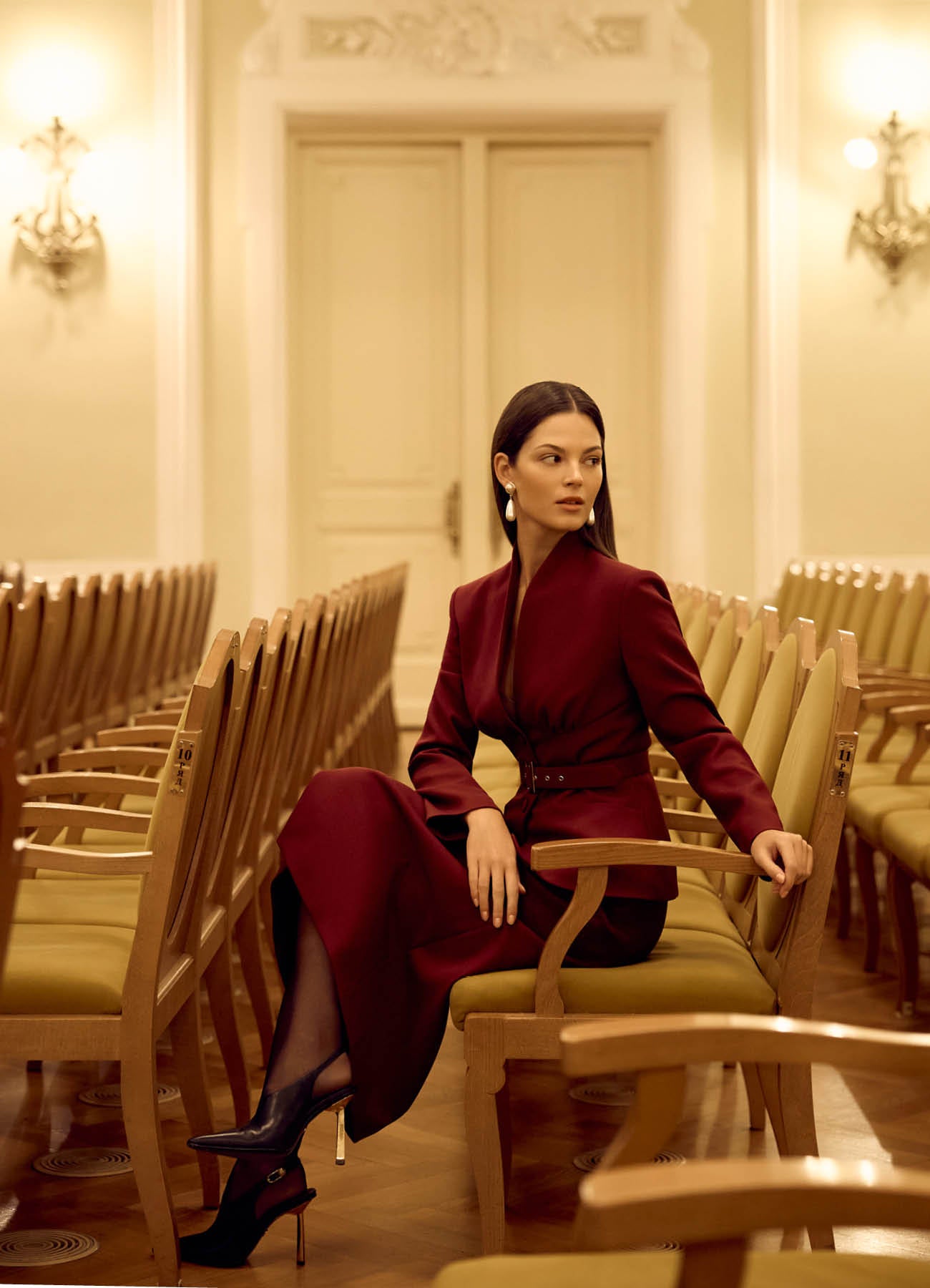Приталенный жакет из мягкой костюмной ткани с поясом, подчёркивающим талию. Обтяжные пуговицы в тон, аккуратный вырез без воротника. Носите с юбкой из комплекта для эффектного total-look или c базовыми брюками и джинсами. На подкладке.