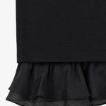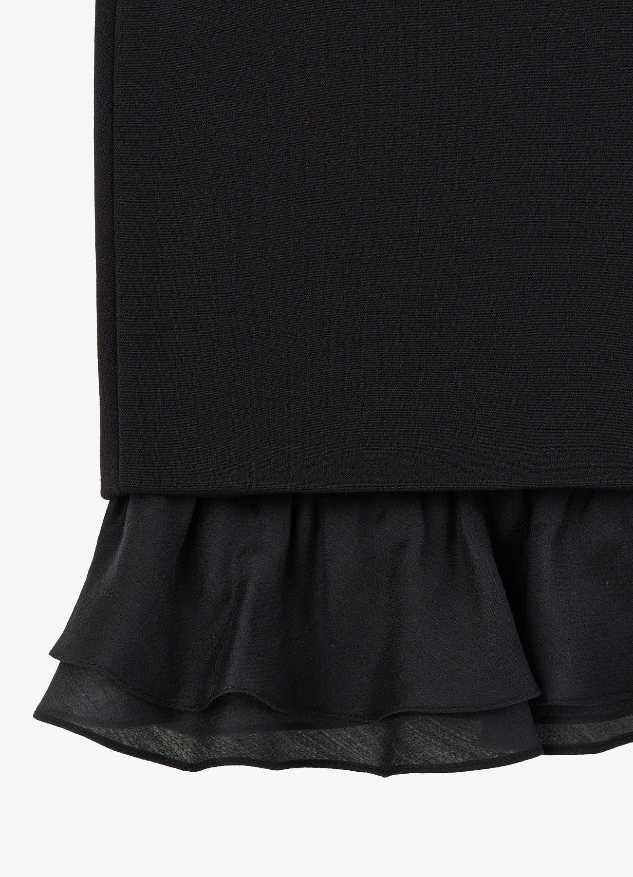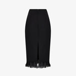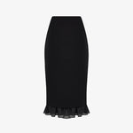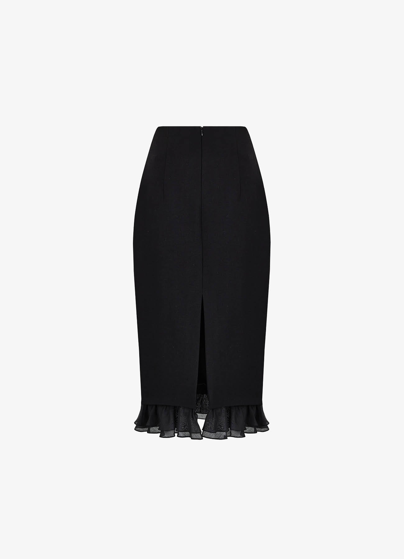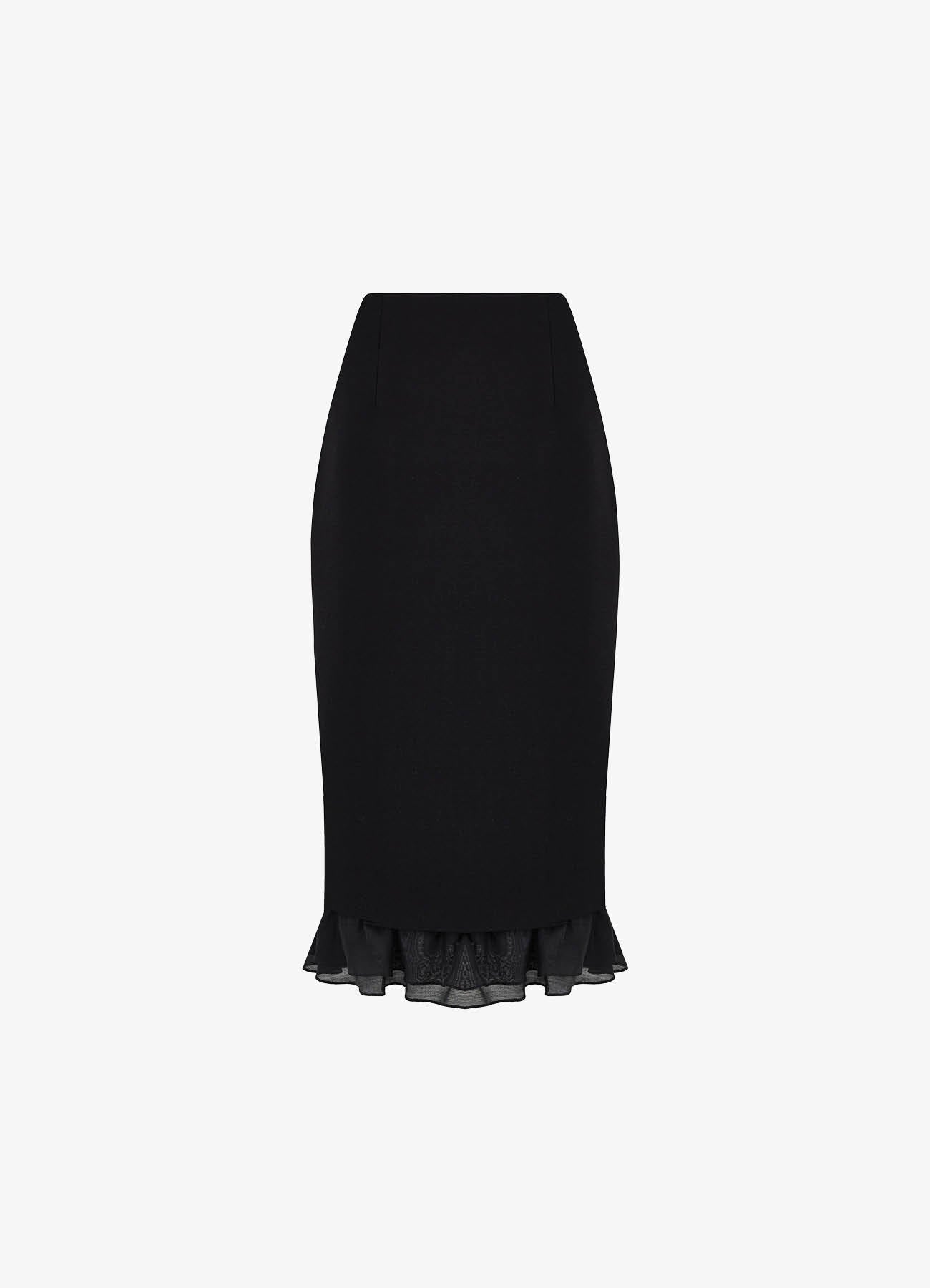 Юбка-футляр из костюмной ткани черного цвета. Лаконичный крой подчёркивает силуэт, рюши из легкого батиста по низу изделия придают образу легкость и воздушность. Сочетайте с жакетом из комплекта или с трикотажем контрастного цвета. На подкладке.