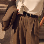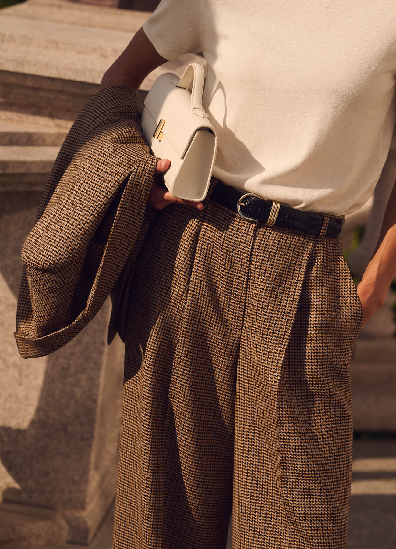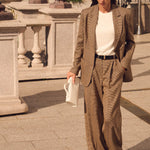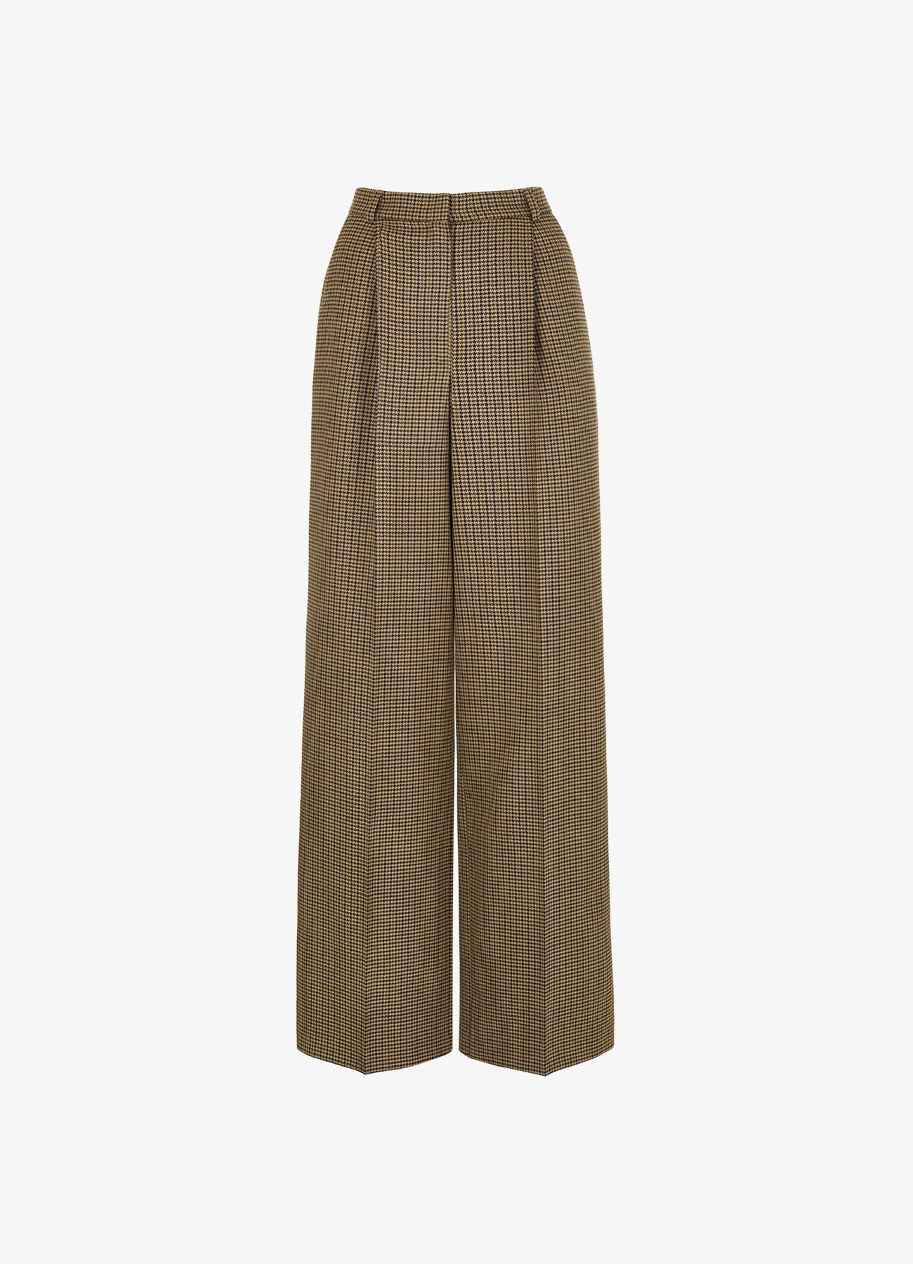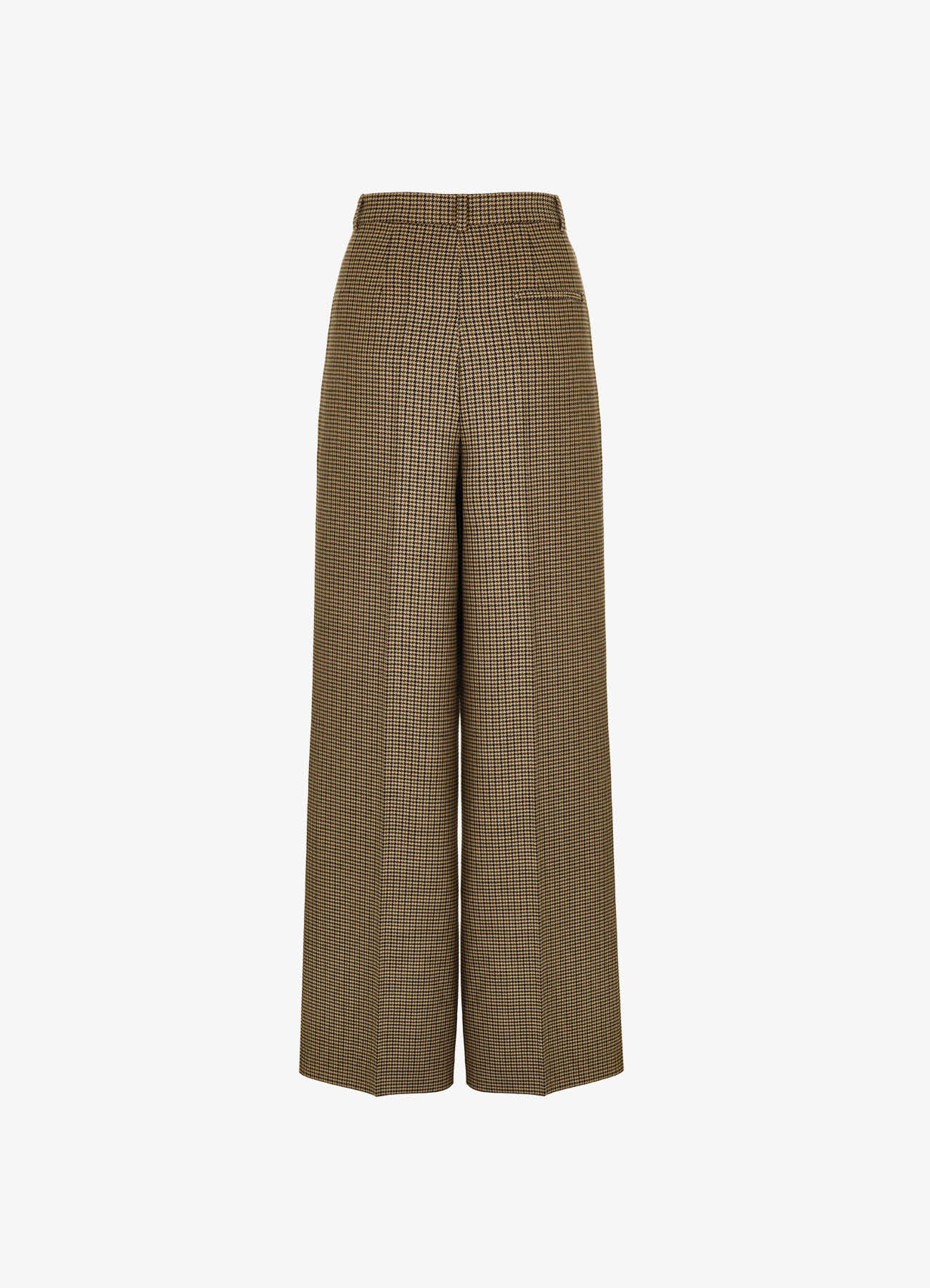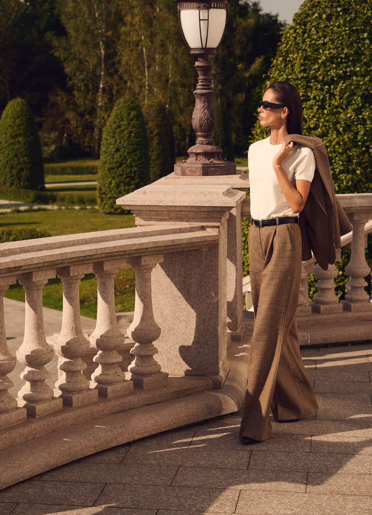 Прямые брюки из мягкой шерсти в бежевую клетку. Лаконичный крой визуально вытягивает силуэт, а плотная фактура ткани обеспечивает идеальную посадку. Создайте деловой total-look с жакетом из комплекта. На подкладке.