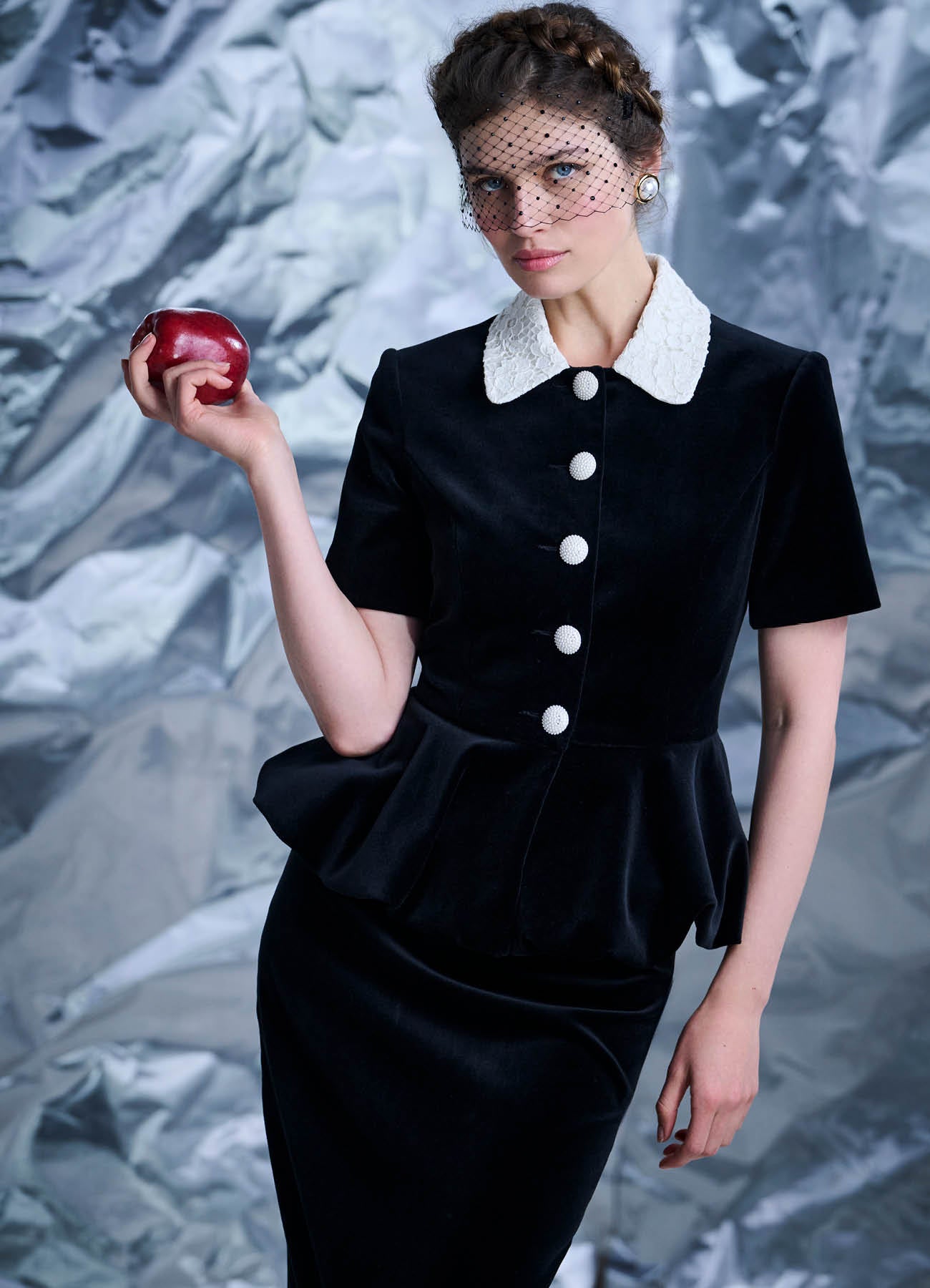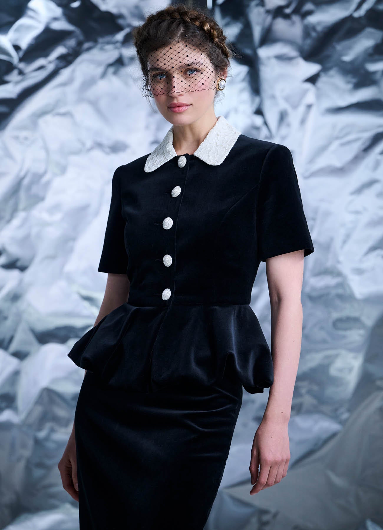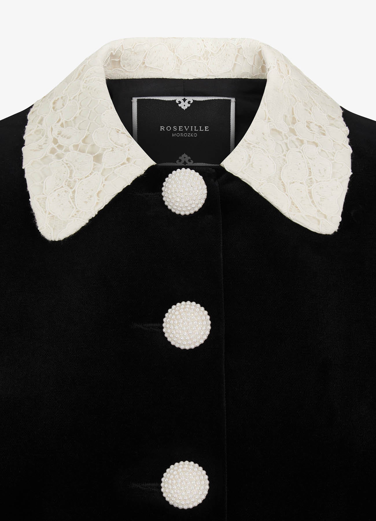 Жакет "Голубка" из бархата. Модель длиной до бедер с акцентом на талии в виде пышной баски. Горловина украшена акцентным отложным воротником из молочного кружева на подкладке в тон. Жакет застегивается на металлические пуговицы, украшенные россыпью мелких жемчужных бусин. Дополните комплектной юбкой из бархата "Голубка" для завершения праздничного  образа. На подкладке.