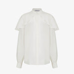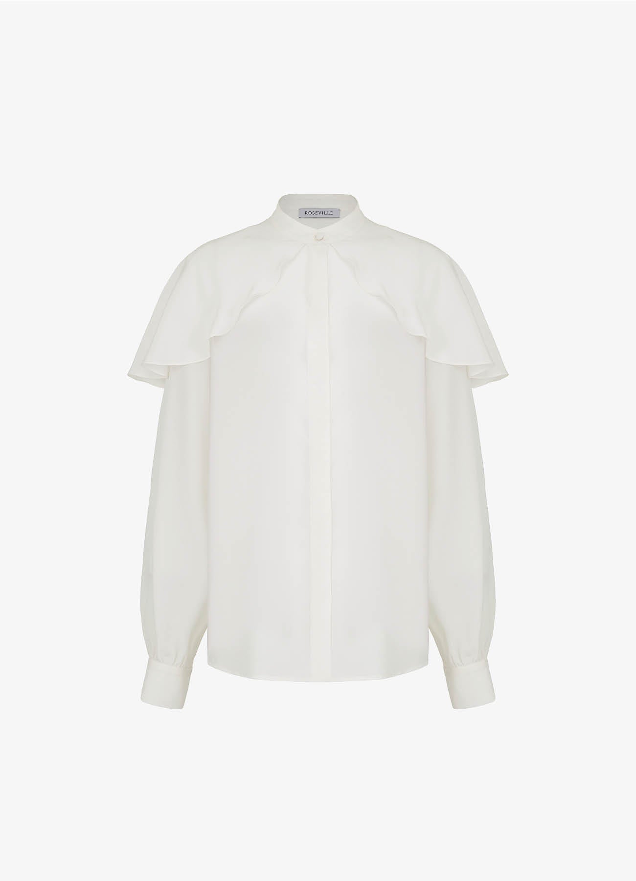 Блуза из шёлка "Лебедушка" молочного цвета. Воздушная пелерина, ниспадающая на плечи, имитирует платок и создаёт ощущение лёгкости. Воротник-стойка и рукава украшены обтяжными пуговицами из ткани в тон. Дополните брюками из коллекции "Власта" черного цвета для эффектного образа вне времени.