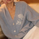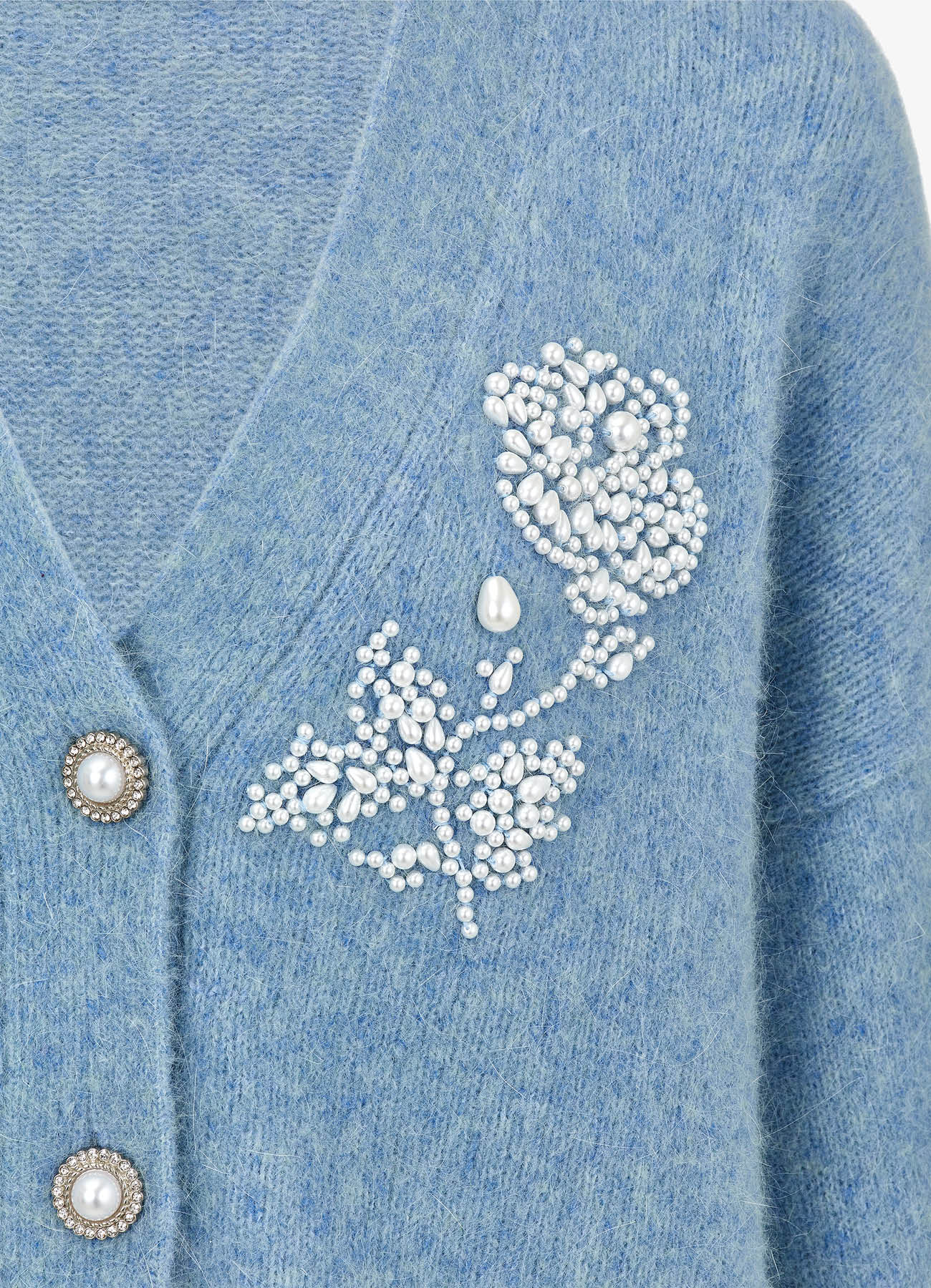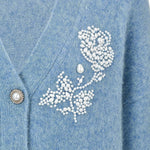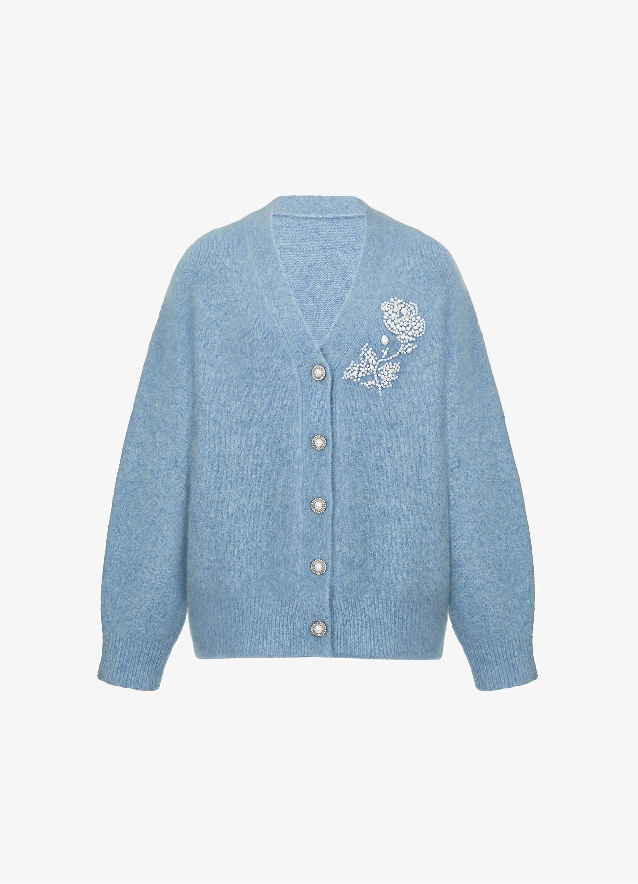 Кардиган из мягкой воздушной ангоры небесно-голубого оттенка. Объёмный силуэт с заниженной линией плеча создаёт ощущение уюта и лёгкости. Акцентная вышивка из жемчужных бусин в форме цветка и пуговицы гармонично завершают образ. Носите с юбками, платьями и брюками — кардиган легко адаптируется и к базовым, и к вечерним сочетаниям.