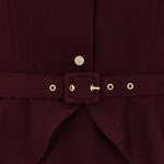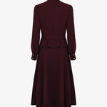 Элегантное бордовое платье миди. Верх украшен аккуратными декоративными пуговицами, талия подчернута поясом с небольшой пряжкой и аккуратной баской. Юбка расширяется к низу, формируя А-образный силуэт, который красиво струится по фигуре. На подкладке.