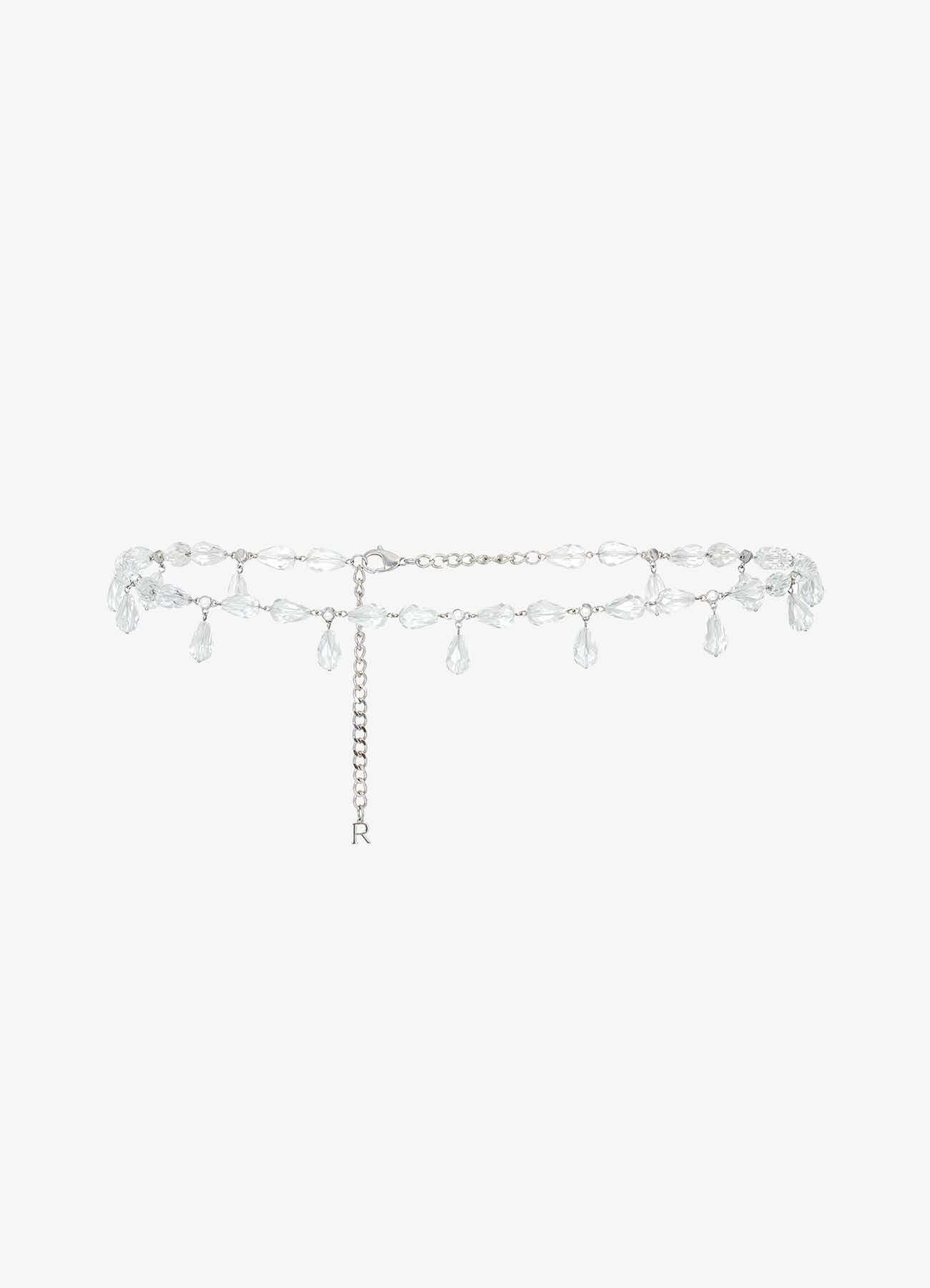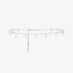 Пояс-цепочка из нержавеющей стали с имитацией родиевого покрытия. Декорирован прозрачными стеклянными "каплями". Добавит выразительный акцент к нарядным образам и завершит лаконичные сочетания.