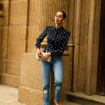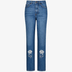 Зауженные джинсы из голубого денима с высокой посадкой. Модель украшена вышивкой в виде роз, добавляющей образу выразительный и узнаваемый акцент. Чистый и лаконичный крой позволяет легко сочетать джинсы как с базовыми вещами, так и с более нарядными элементами гардероба.