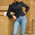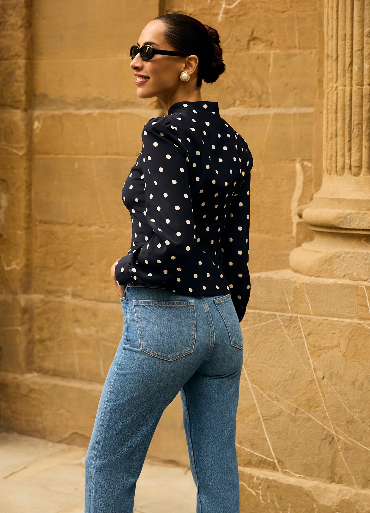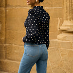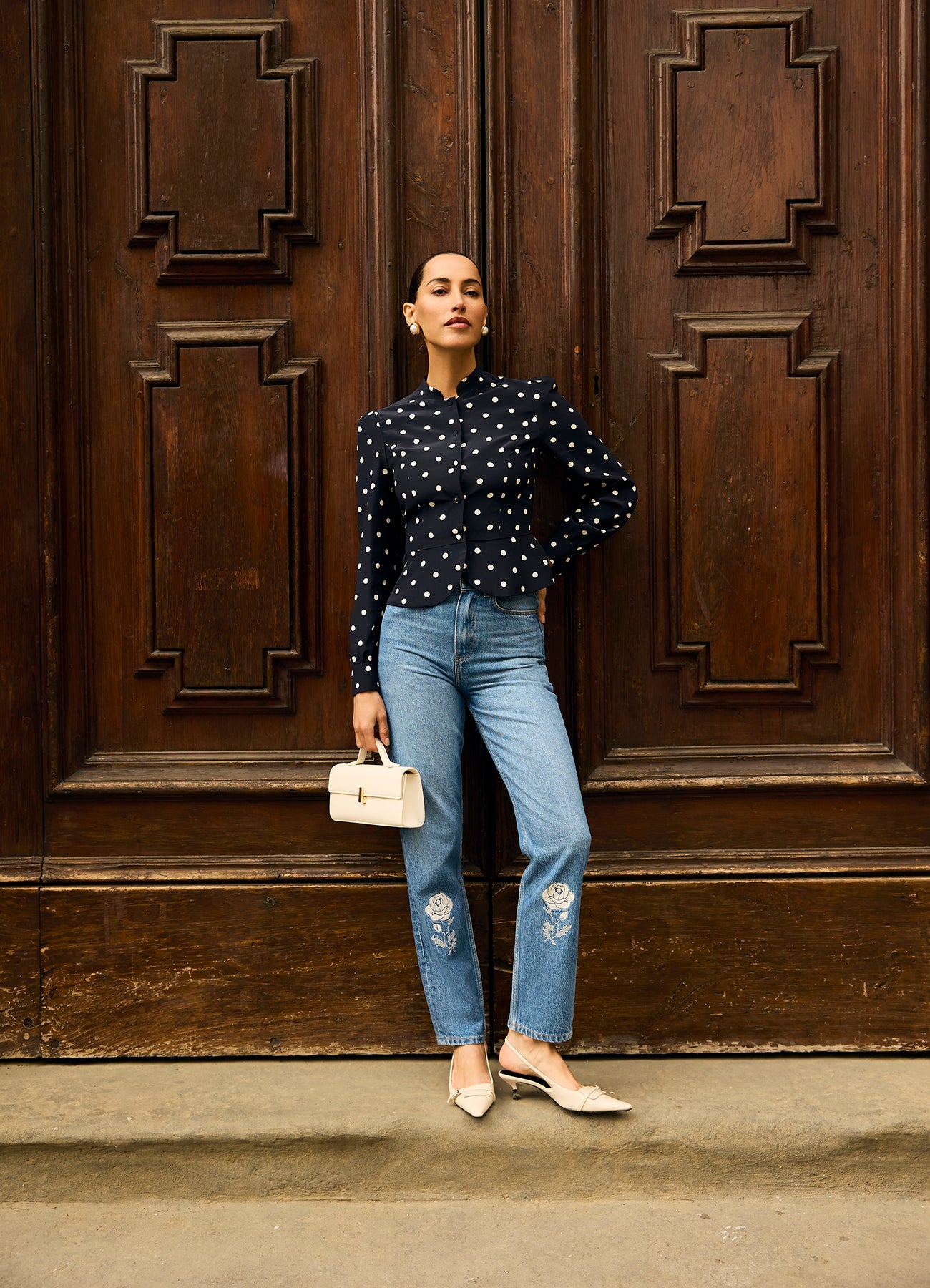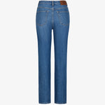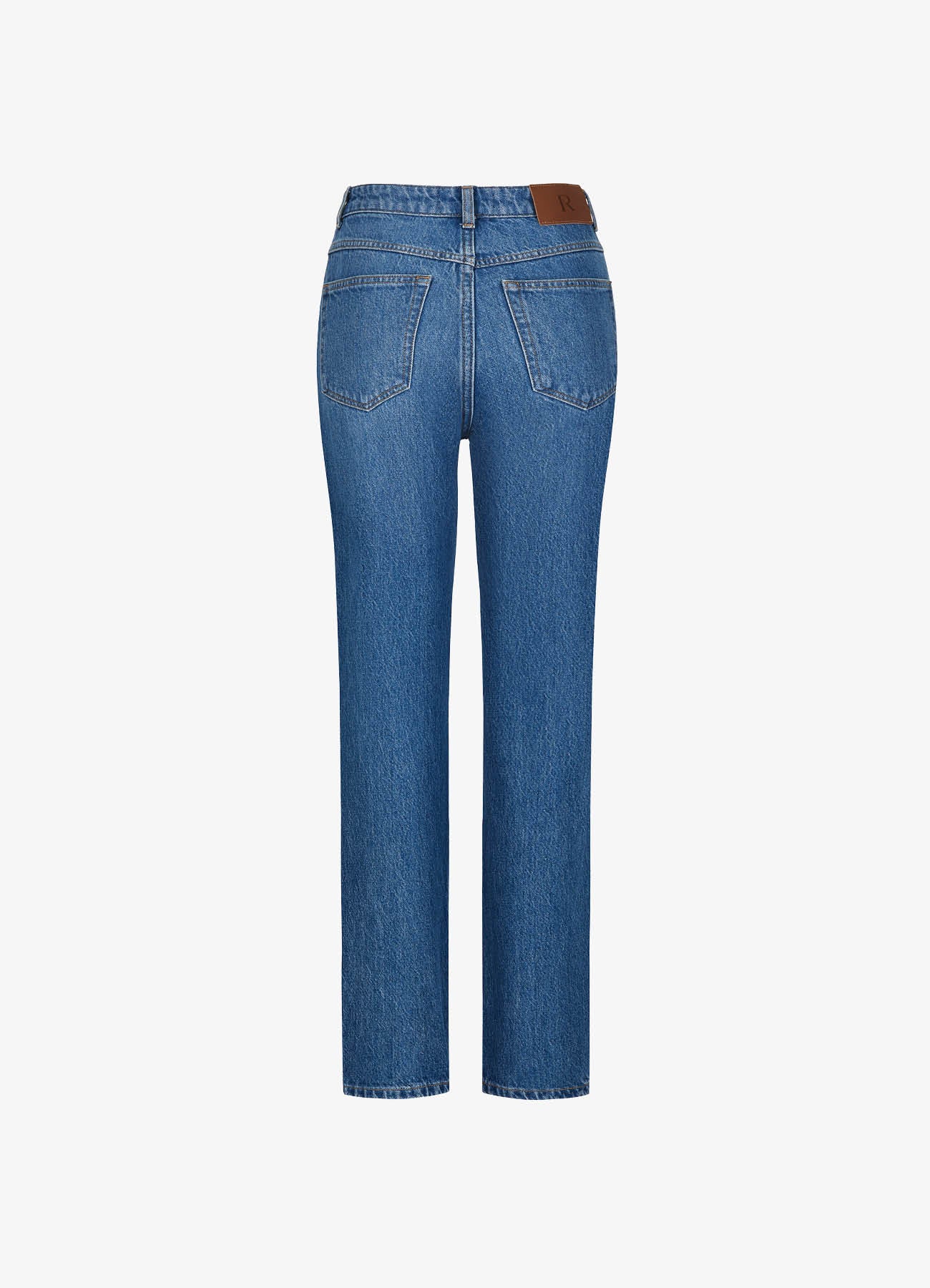 Джинсы дополнены фирменной фурнитурой Roseville и кожаным патчем с монограммой R на поясе.