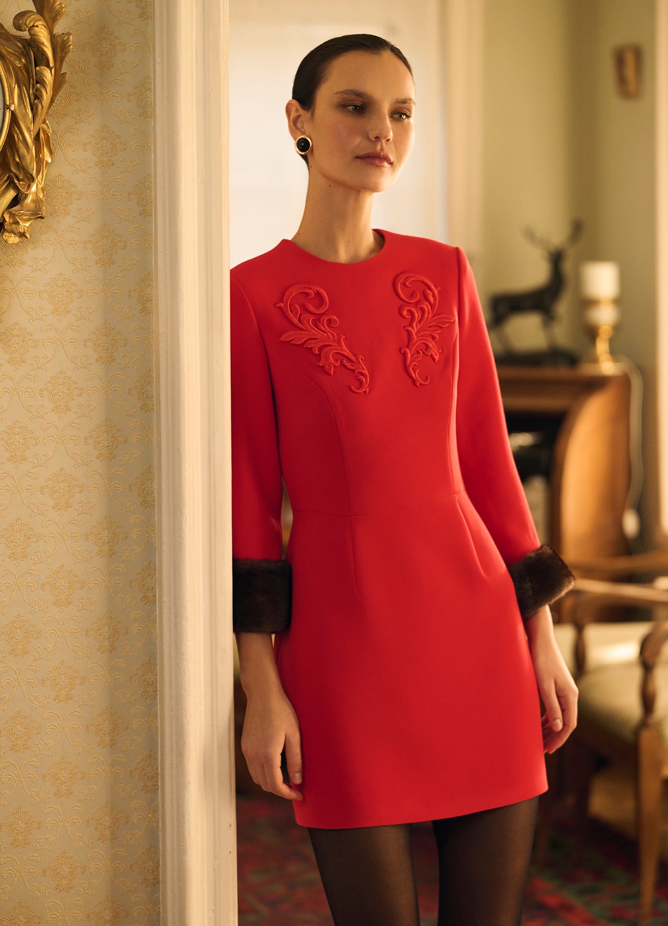 Платье Жар-птица мини с меховыми манжетами