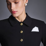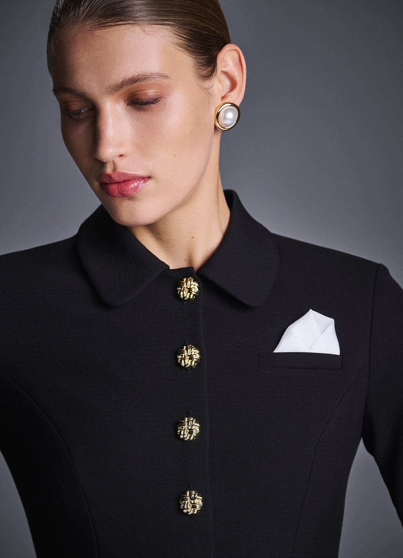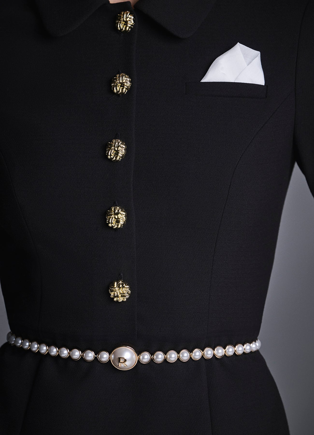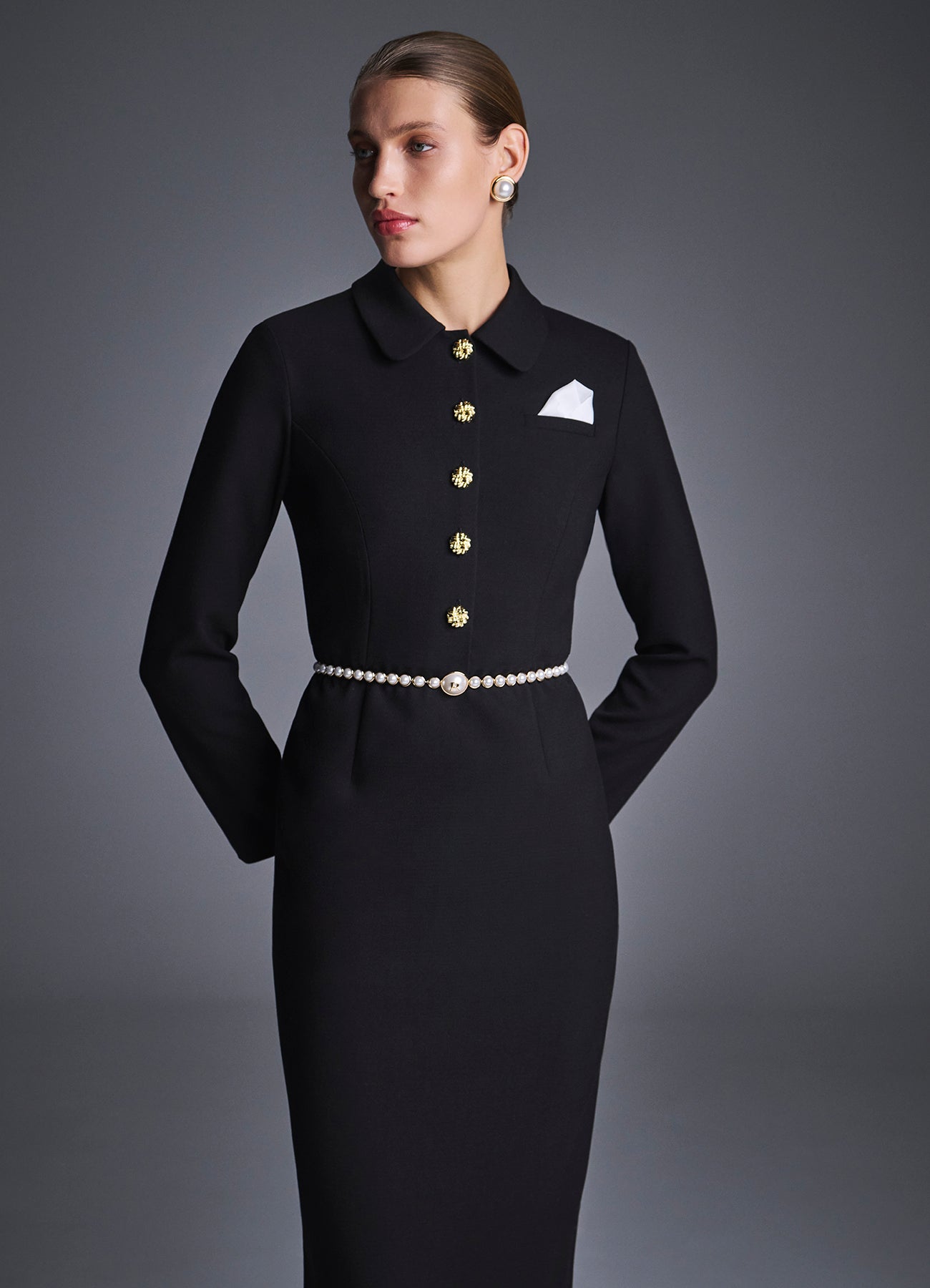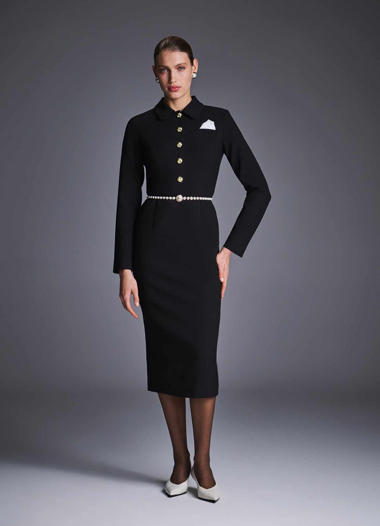 Платье-футляр из плотной костюмной ткани, которая хорошо держит форму и не мнется. Модель украшена декоративным платком белого цвета и рядом акцентных золотых пуговиц. Платье подходит для офиса, деловых встреч и особых случаев. На подкладке.