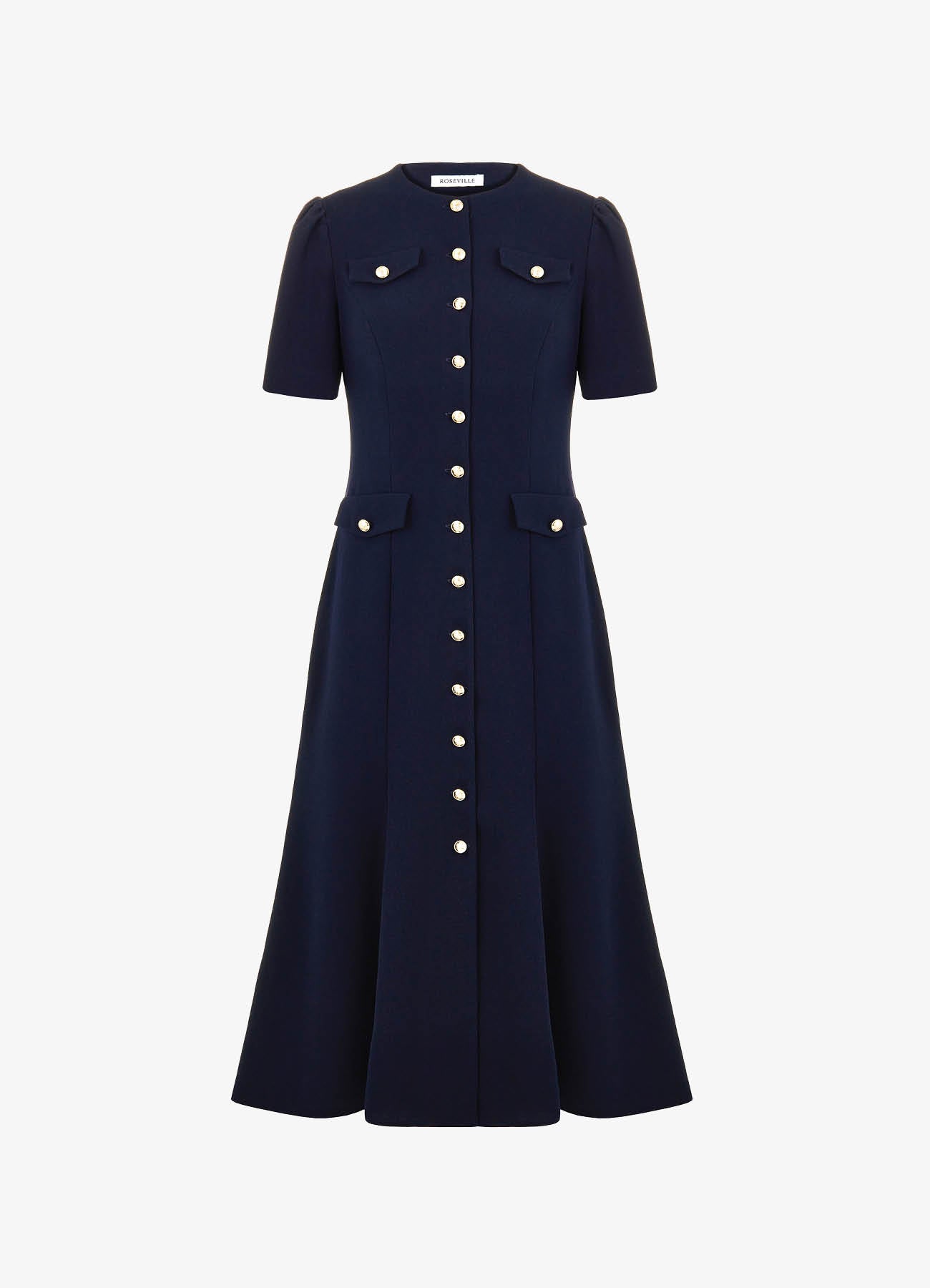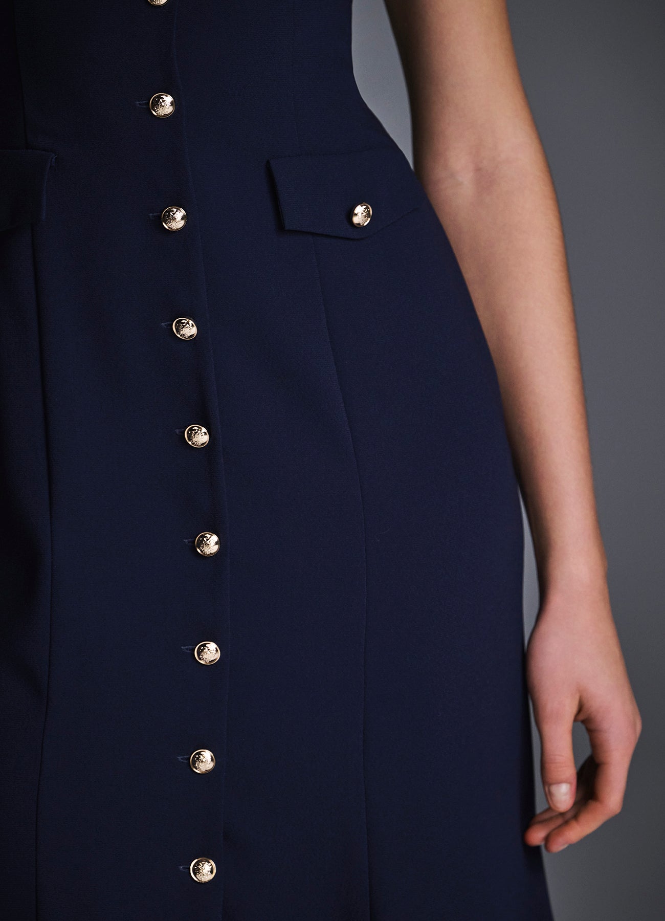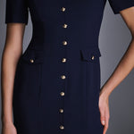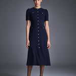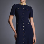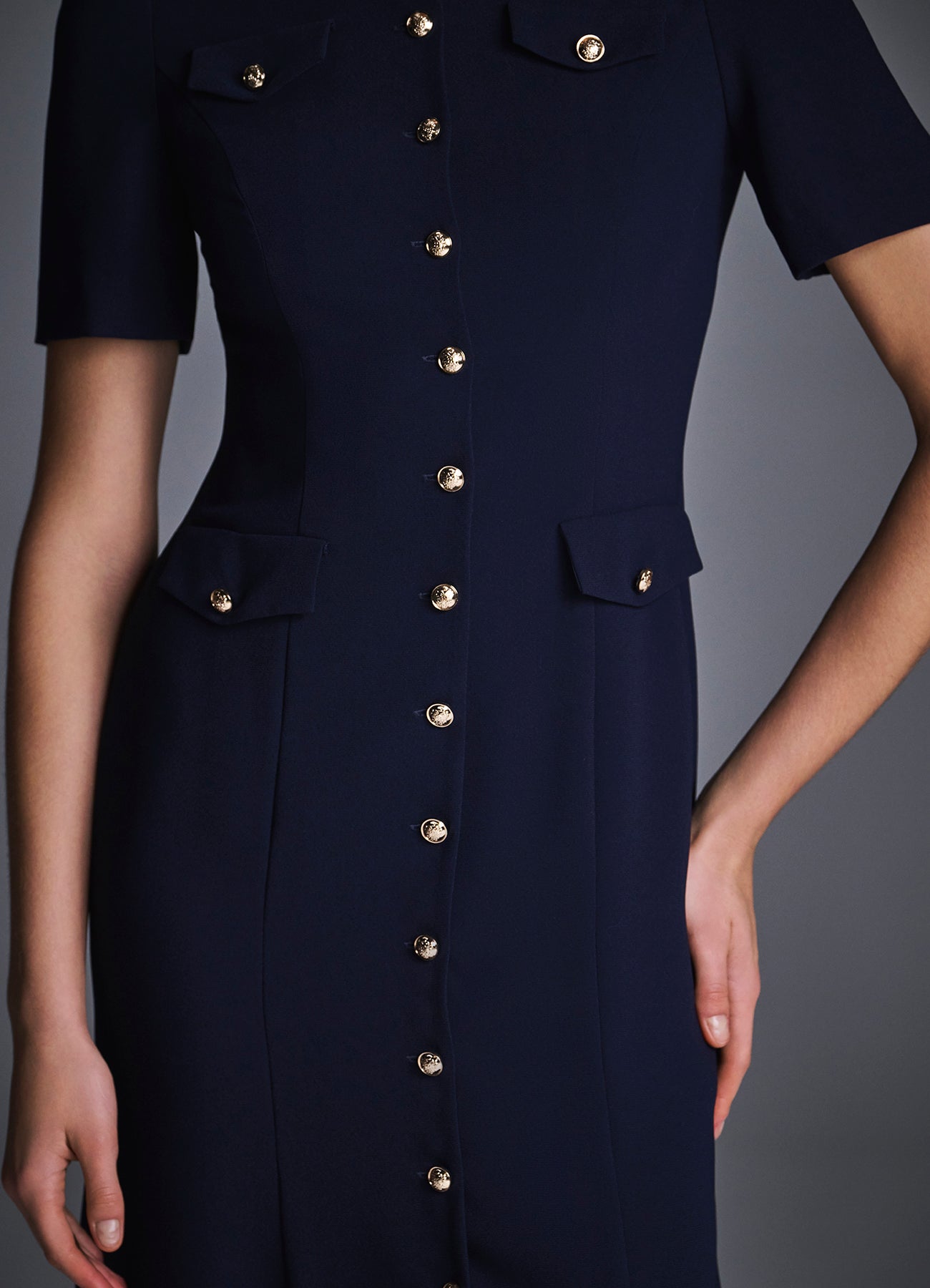 Платье из мягкой ткани на основе вискозы с легким расклёшенным силуэтом. Модель с короткими рукавами и четырьмя накладными карманами, украшенными золотистыми пуговицами. Вертикальный ряд пуговиц визуально вытягивает силуэт, создавая женственный и утончённый образ. Идеально для офиса, прогулок и повседневных выходов. На подкладке.