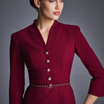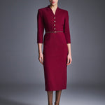 Платье-футляр миди из костюмной ткани с поясом. Материал хорошо держит форму и не мнется, съемный пояс в тон подчеркивает талию, аккуратный V-образный вырез и декоративные пуговицы визуально вытягивают силуэт. На подкладке, рукава 3/4.