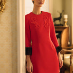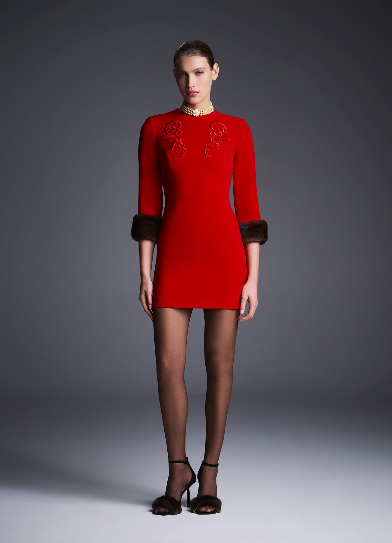 Платье мини "Жар-птица". На груди платья - монохромная объемная вышивка в виде морозных узоров. Рукава длиной 7/8 дополнены съёмными манжетами из меха натуральной норки шоколадного цвета, которые крепятся на пуговицы. Приталенный силуэт, отрезная линия талии и потайная молния обеспечивают идеальную посадку по фигуре. На подкладке.