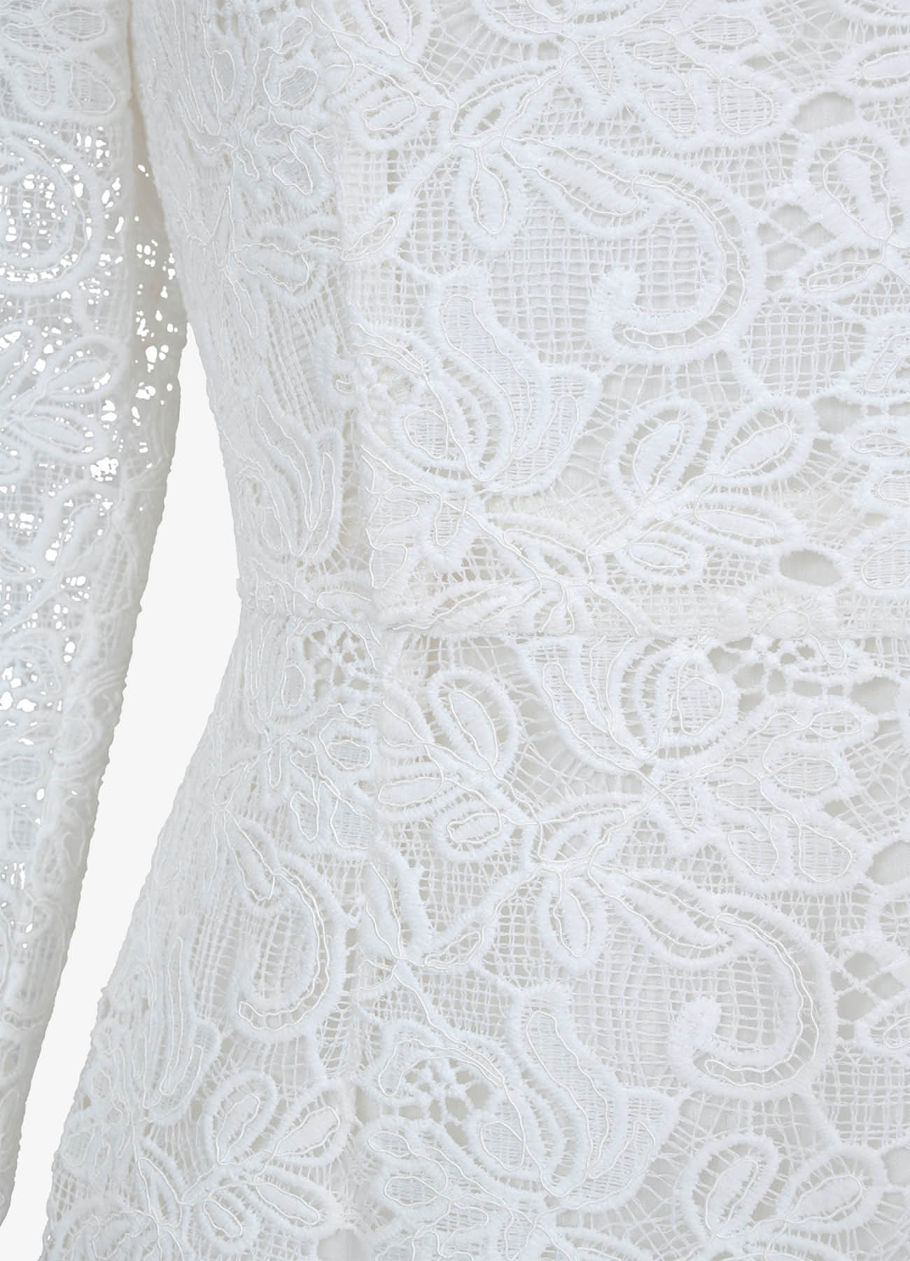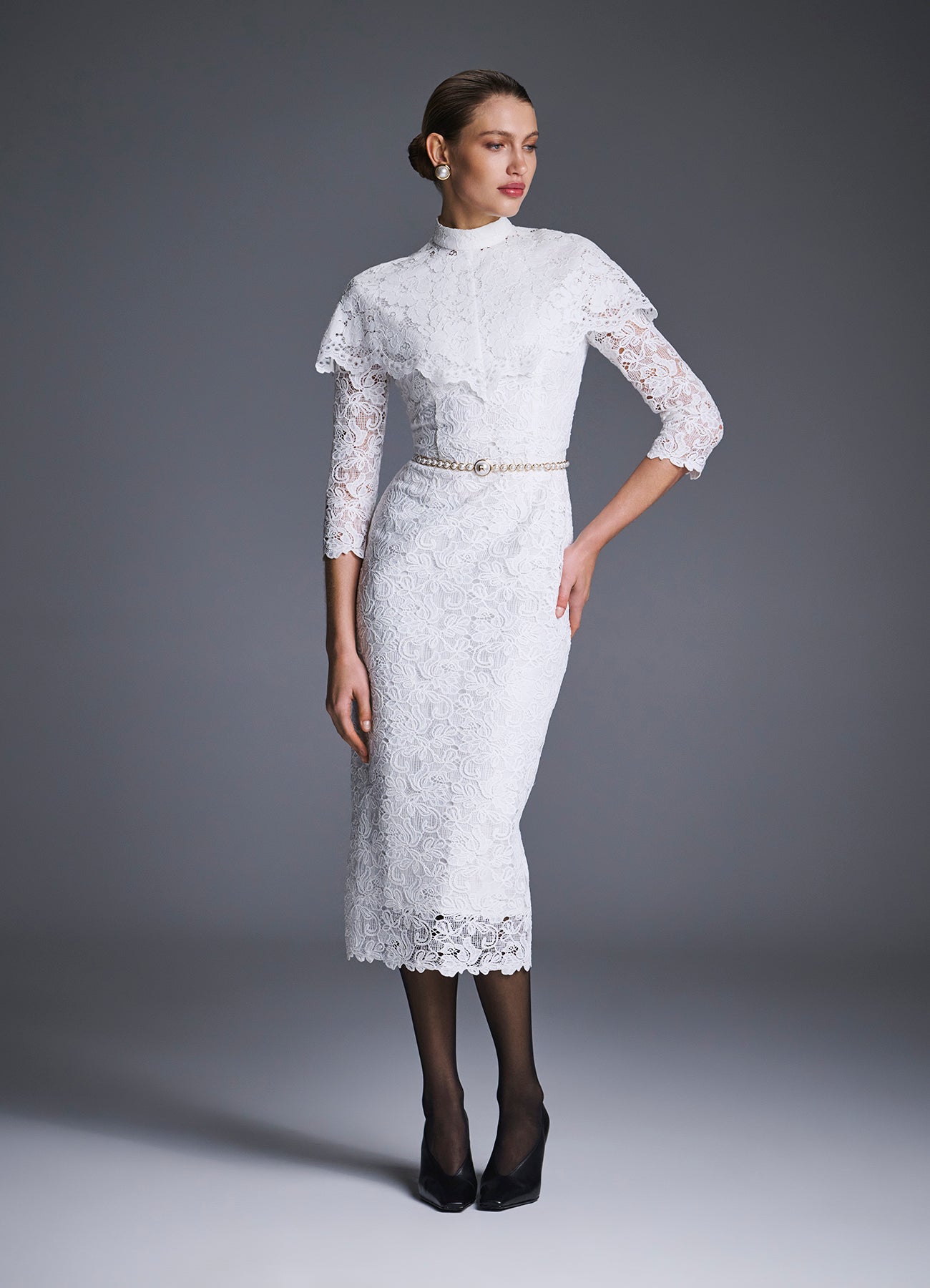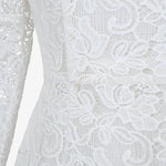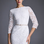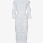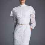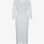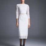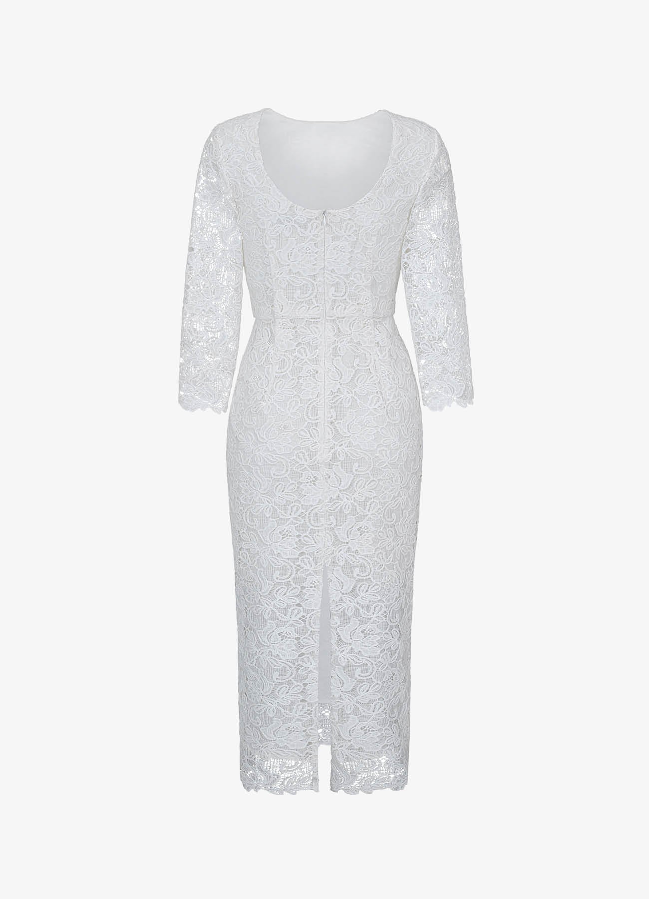 Платье-футляр "Морозко" из изящного молочного кружева длины миди, напоминающего морозные узоры. Спереди — лаконичный вырез горловины в форме лодочки, на спинке — изысканный углублённый вырез. Рукава длиной 3/4 и низ юбки оформлены фестончатым краем, который подчёркивает фактуру кружева. Дополните платье украшениями из коллекции. На подкладке.