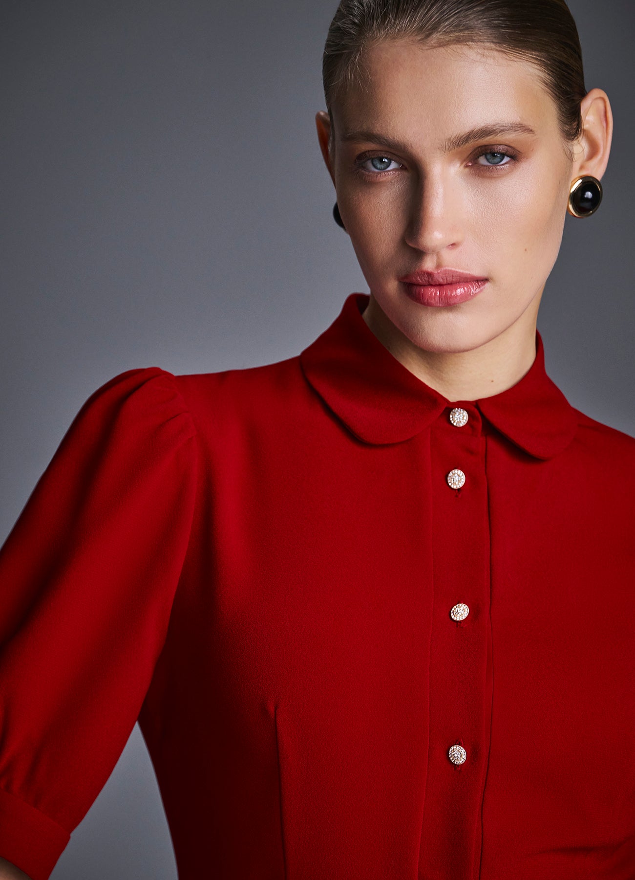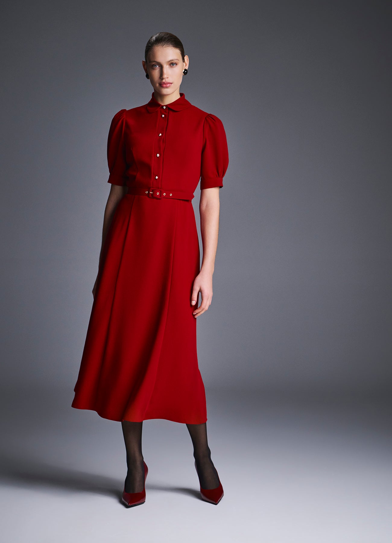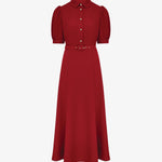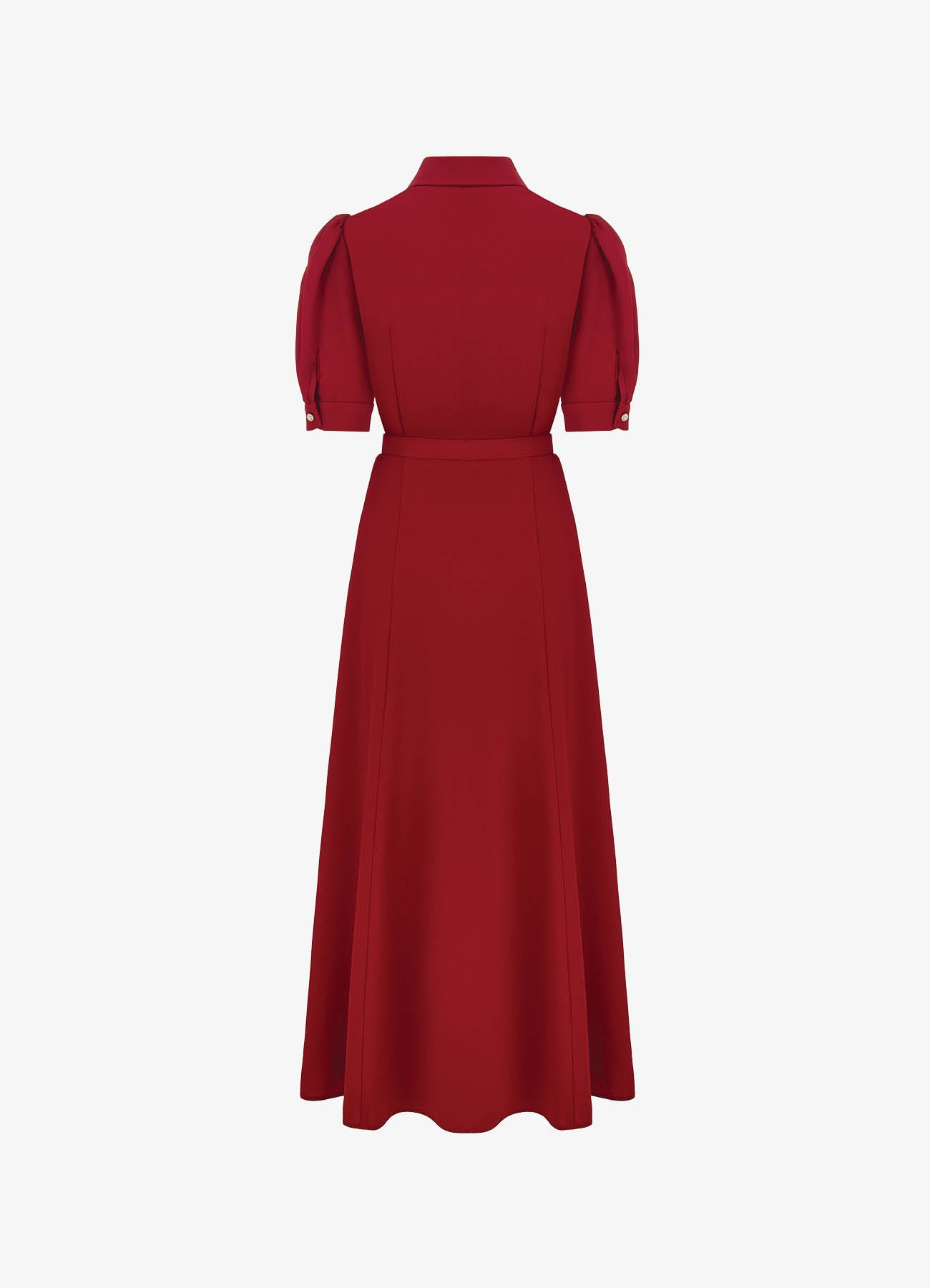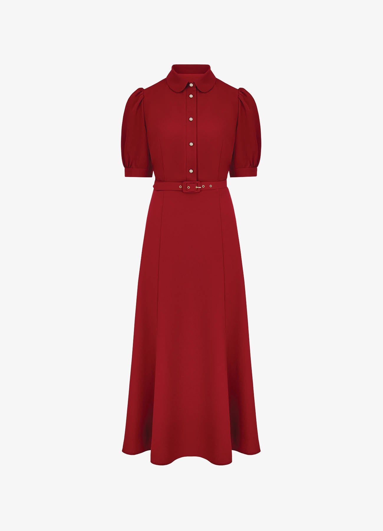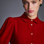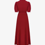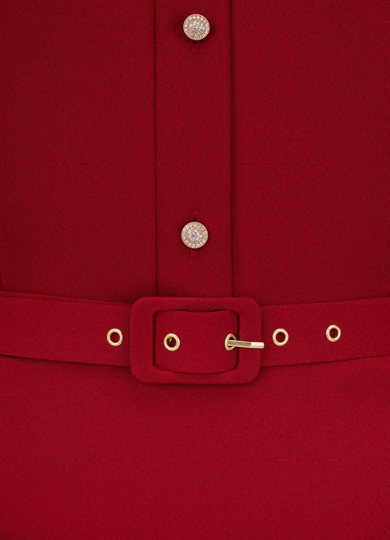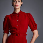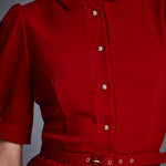 Платье миди из матового крепа, выполненное в насыщенном красном оттенке. Дополнено рядом декоративных пуговиц и тонким поясом в тон, который акцентирует талию и делает силуэт более выразительным. Чистые линии, продуманная посадка и благородная фактура ткани создают универсальный и в то же время утончённый образ — идеальный для мероприятий, деловых встреч или вечерних выходов.