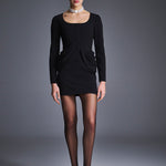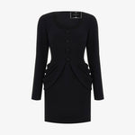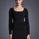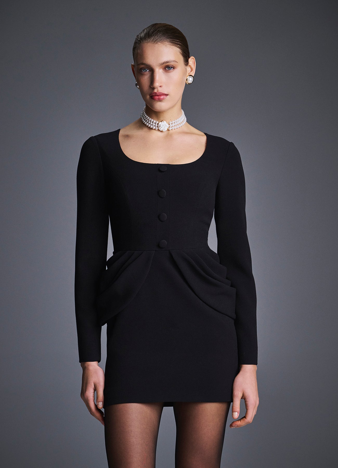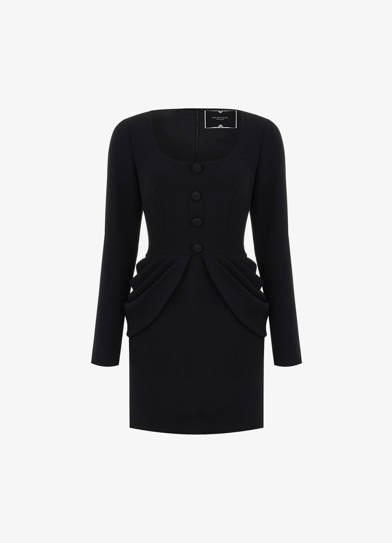 Платье-мини "Славна" из костюмной ткани черного цвета — элегантная интерпретация классического силуэта. Приталенная форма и декоративная баска подчеркивают силуэт, вырез-каре и длинные рукава создают гармоничный баланс строгости и женственности. Декоративная застёжка на обтяжные пуговицы. На подкладке.