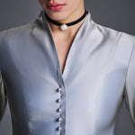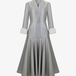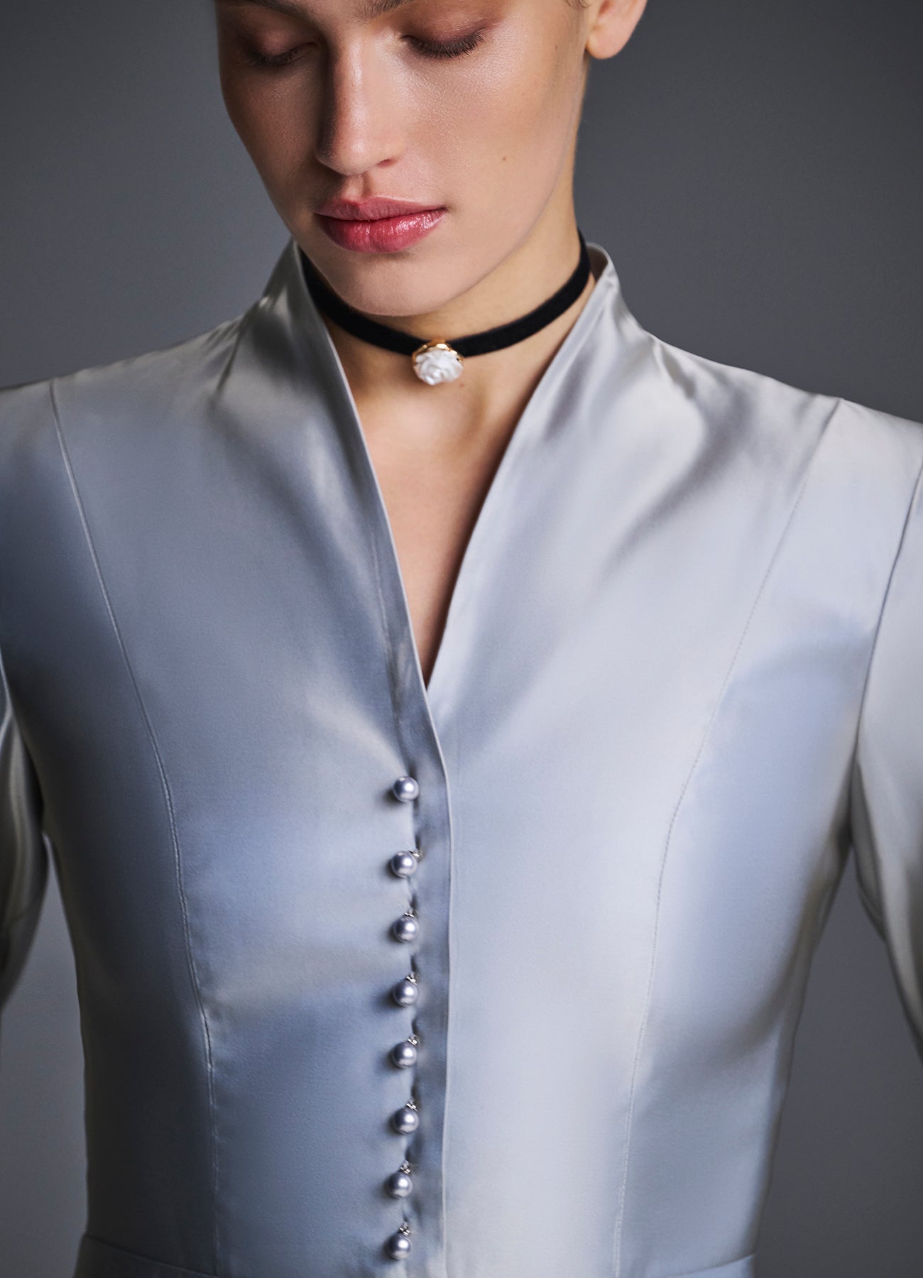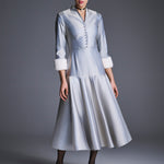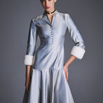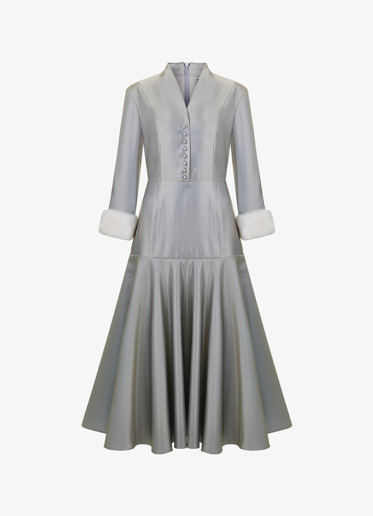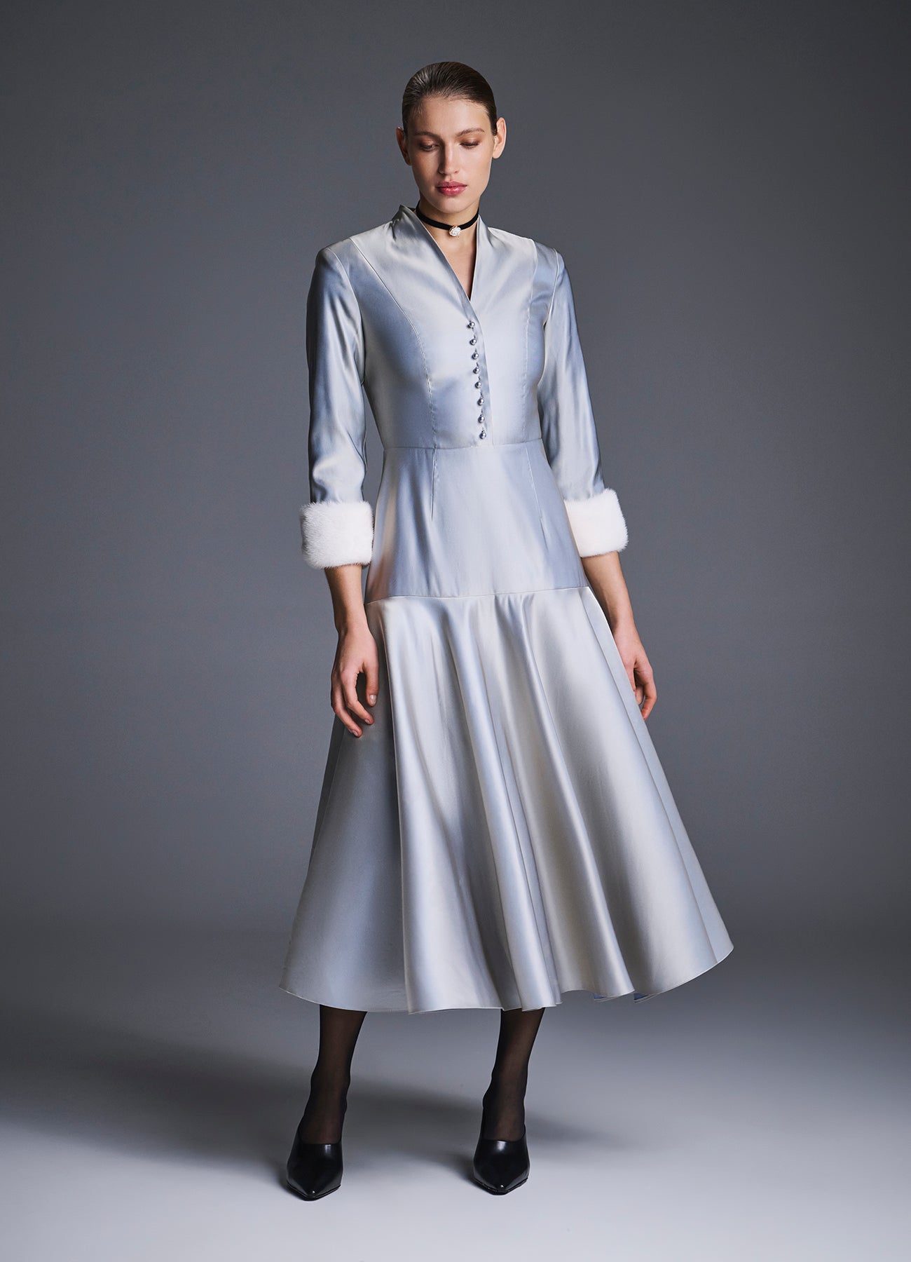 Платье миди "Княжна" из испанской тафты жемчужно-голубого цвета. Приталенный силуэт, отрезная линия талии и V-образный вырез. Рукава длиной 7/8 дополнены съёмными манжетами из норки молочного цвета, лиф - декоративной застёжкой в виде жемчужин в тон ткани. Пышная юбка с кокеткой и объёмным подолом на подъюбнике из жёсткой сетки. Потайная молния, на подкладке.
