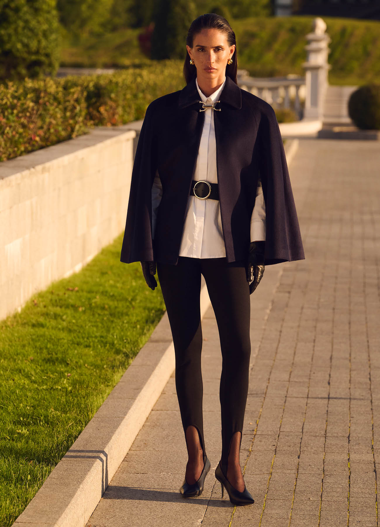 Элегантный кейп глубокого темно-синего цвета из шерсти и кашемира. Мягкий и тёплый материал обеспечивает комфорт в прохладную погоду. Модель с отложным воротником и акцентной застёжкой золотистого оттенка. Свободный крой позволяет носить кейп поверх рубашки или тонкого свитера, сохраняя свободу движений. Универсальная деталь гардероба в классическом стиле. На подкладке.