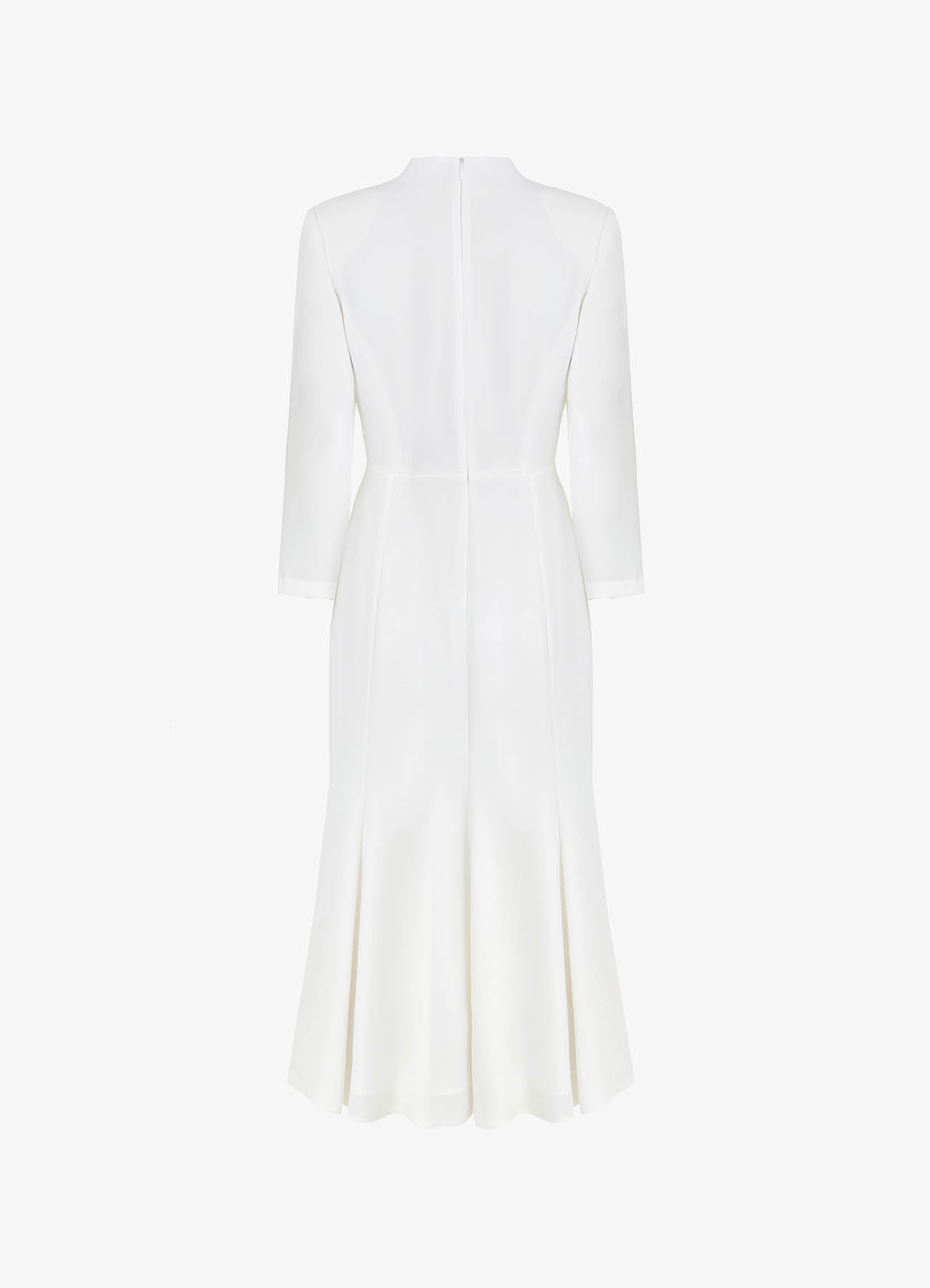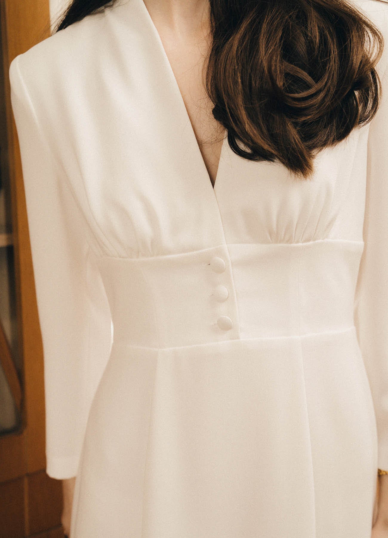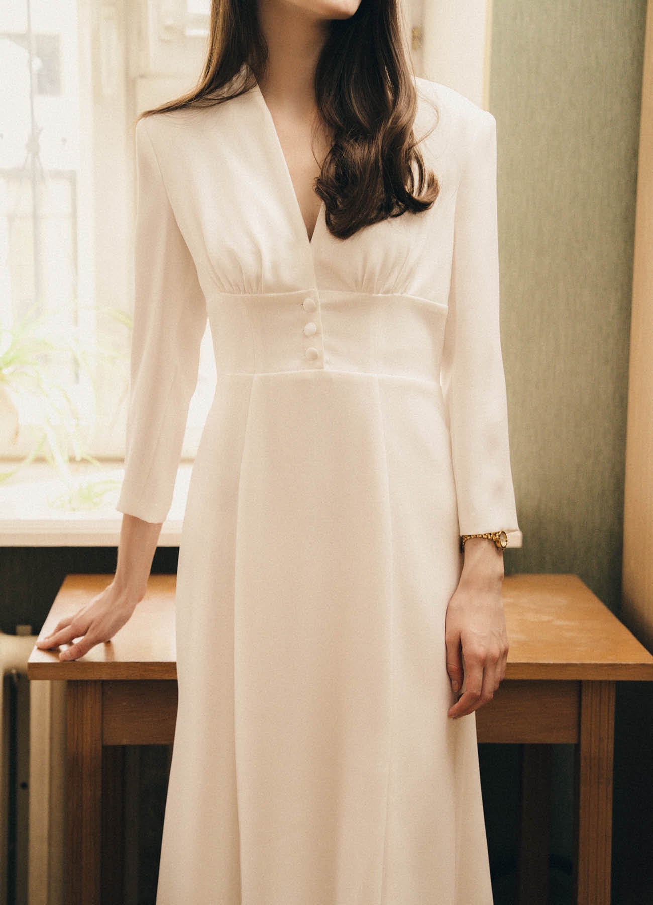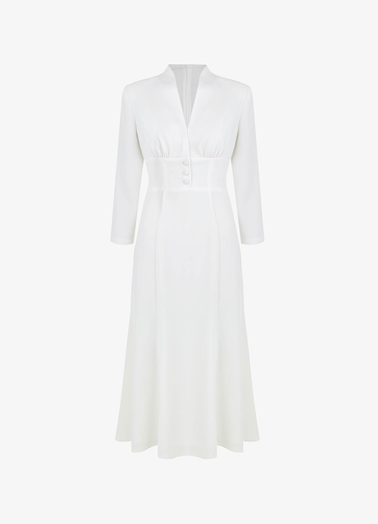 Платье из мягкого греческого крепа с юбкой-годе. Слегка завышенная талия визуально удлиняет силуэт, мягкие драпировки под грудью и обтяжные пуговицы подчеркивают фигуру. Длина рукава 3/4. На подкладке, застежка на молнию.