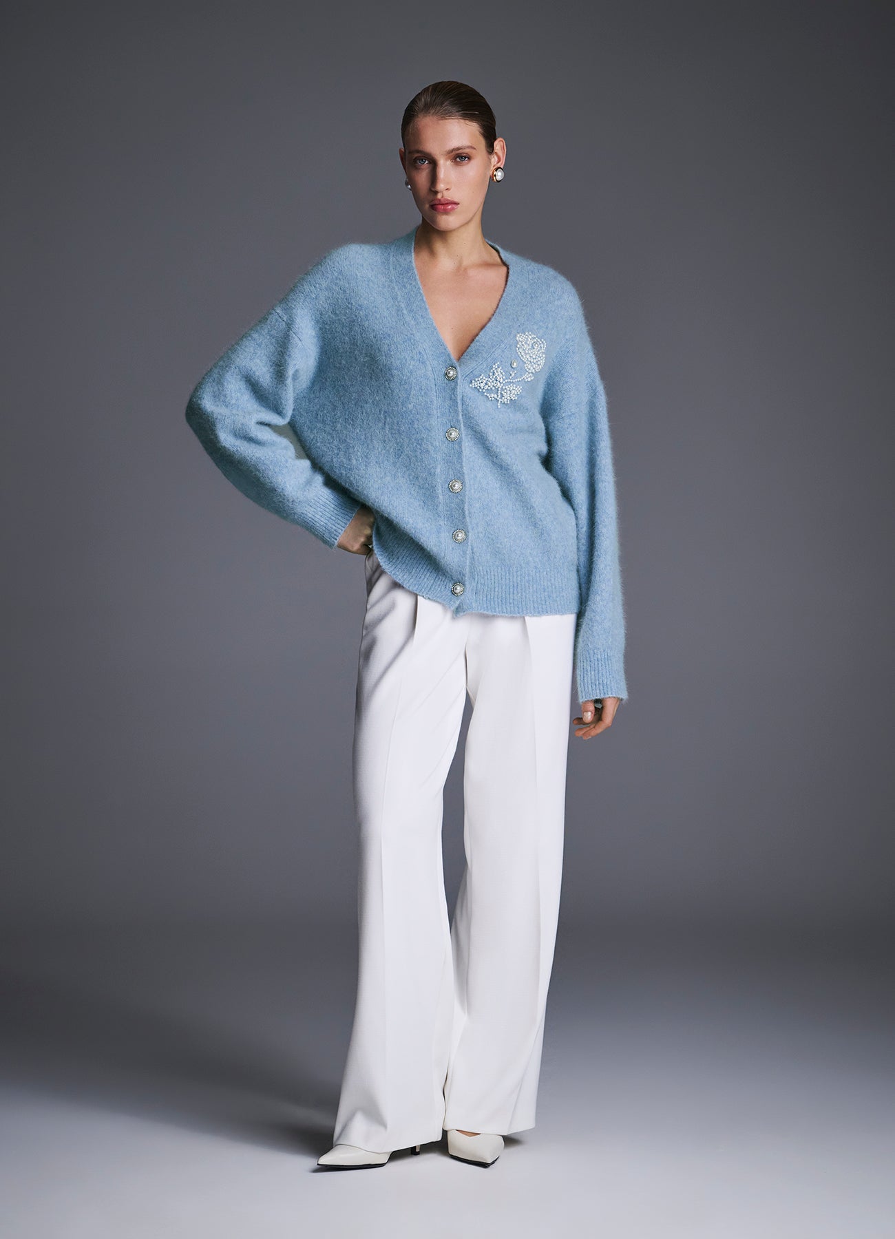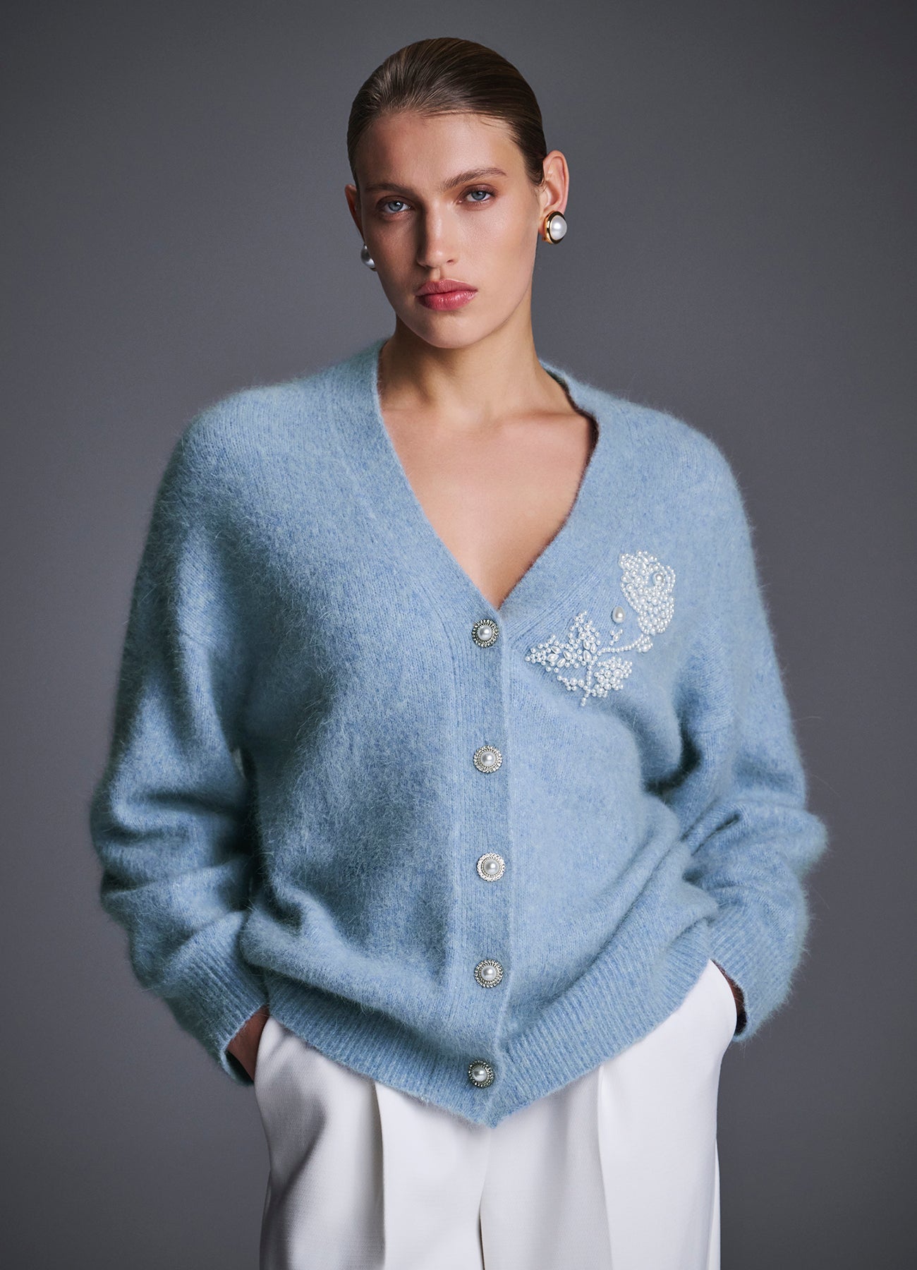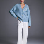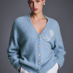 Кардиган из мягкой воздушной ангоры небесно-голубого оттенка. Объёмный силуэт с заниженной линией плеча создаёт ощущение уюта и лёгкости. Акцентная вышивка из жемчужных бусин в форме цветка и пуговицы гармонично завершают образ. Носите с юбками, платьями и брюками — кардиган легко адаптируется и к базовым, и к вечерним сочетаниям.