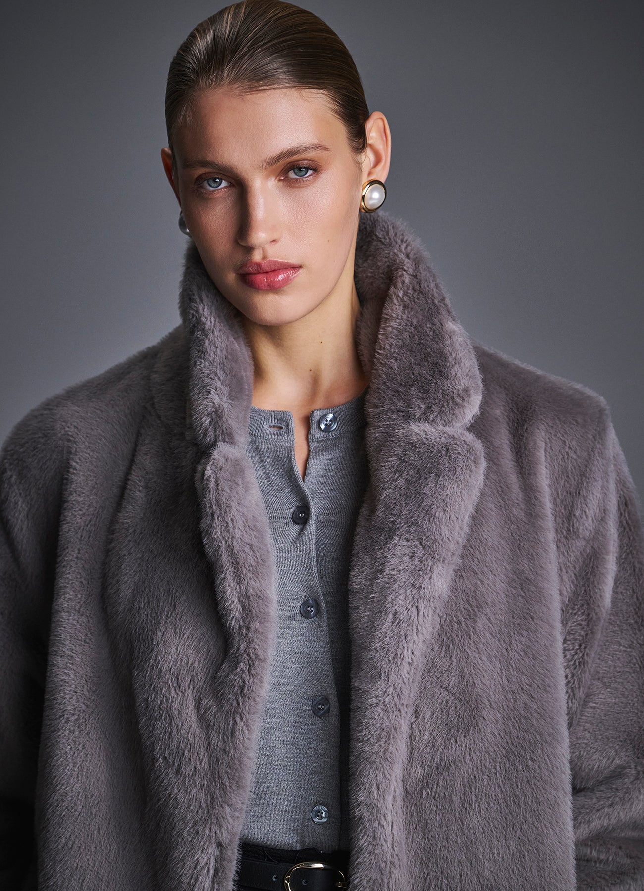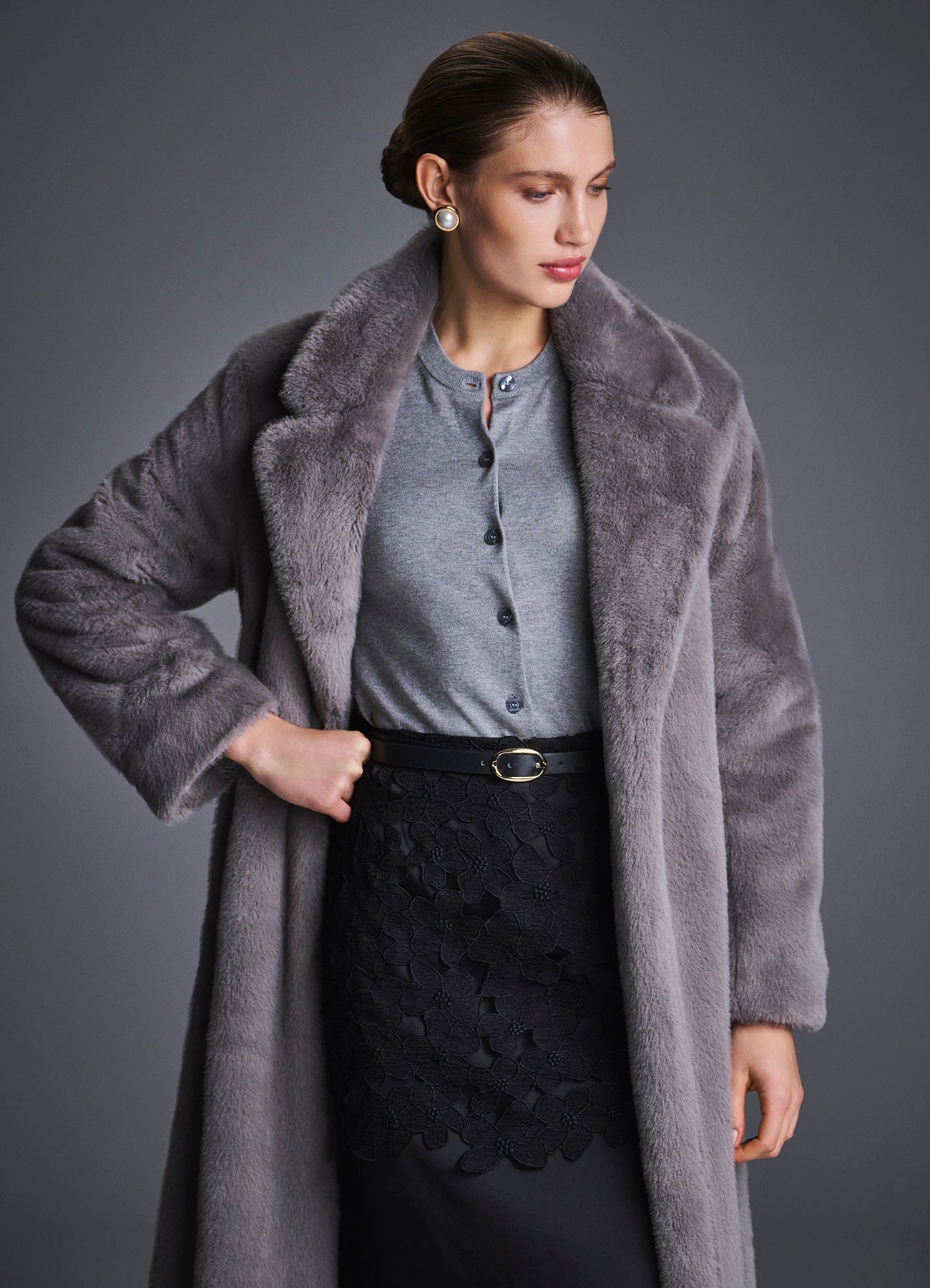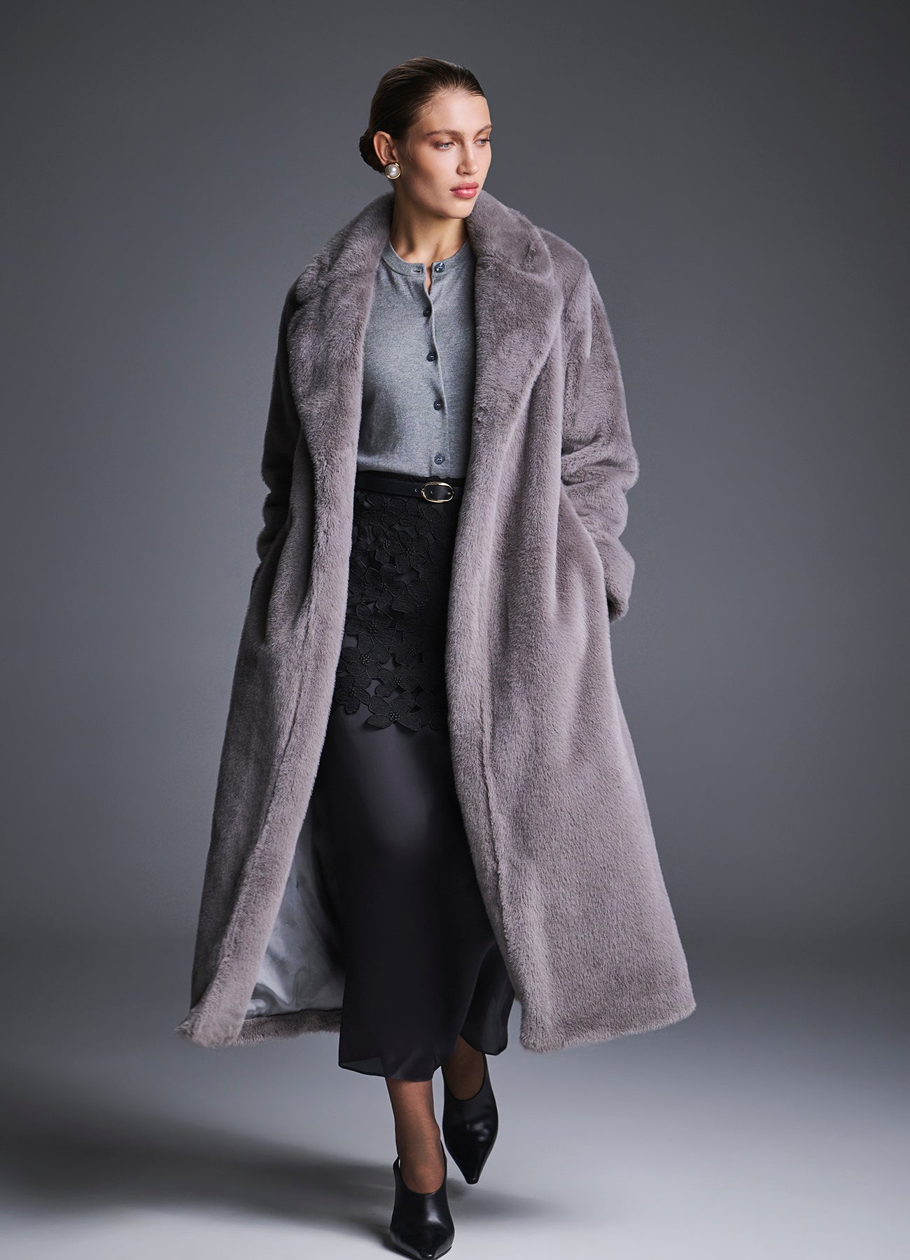 Шуба из мягкого искусственного меха в элегантном сером оттенке создана для максимального комфорта и тепла в холодный сезон. Объёмный воротник-шаль и расслабленный прямой силуэт подчёркивают роскошную фактуру изделия, а пояс на талии позволяет варьировать посадку — от свободной до более приталенной. Универсальная длина и лаконичный дизайн для повседневных и вечерних образов.