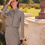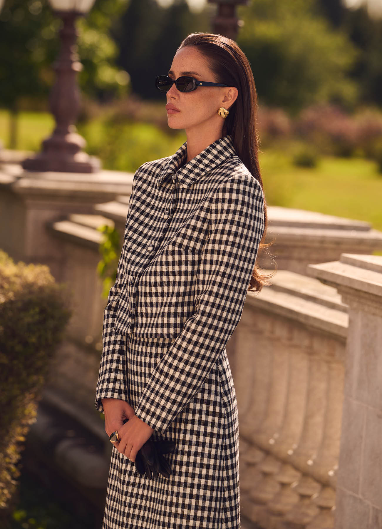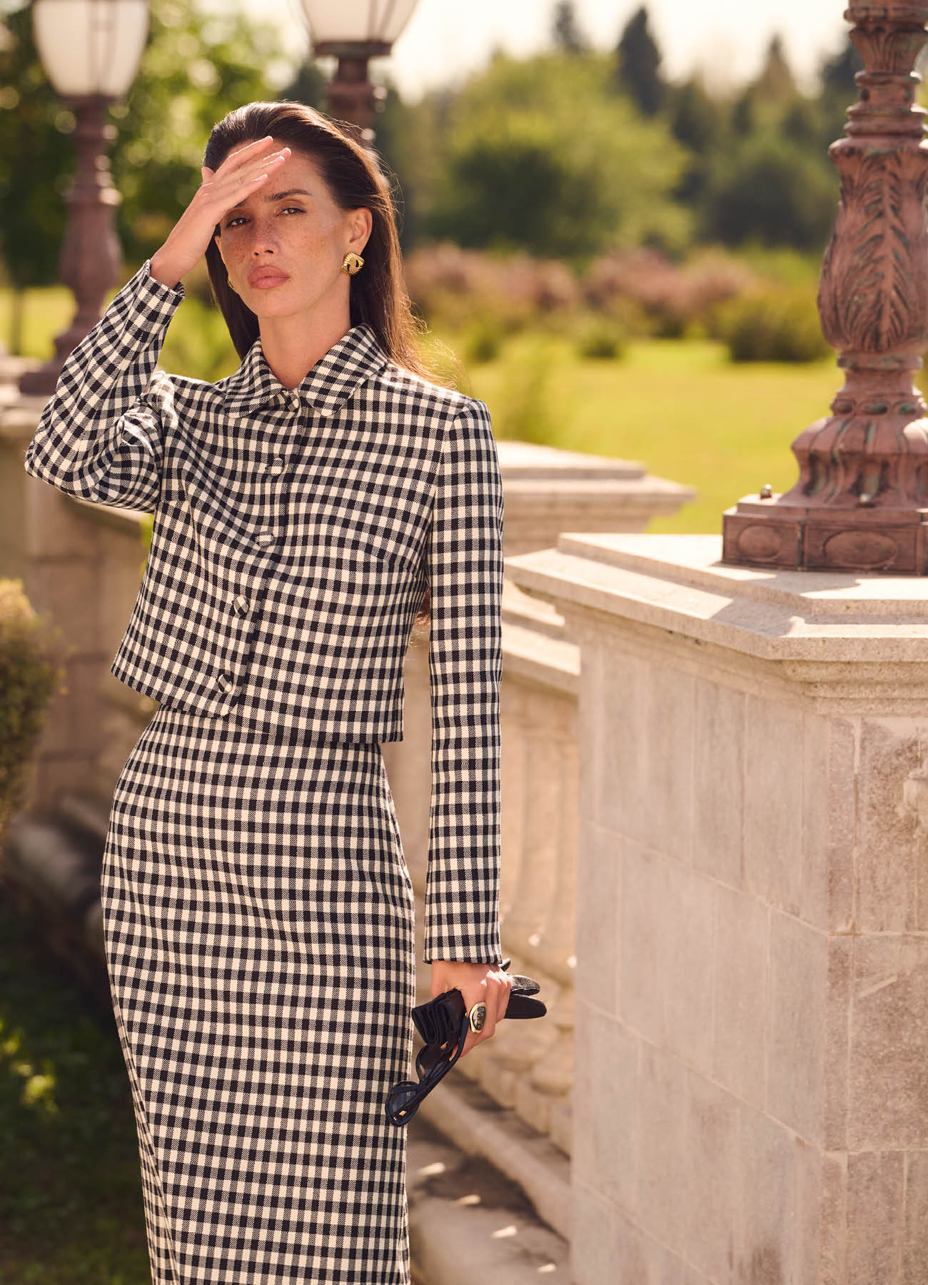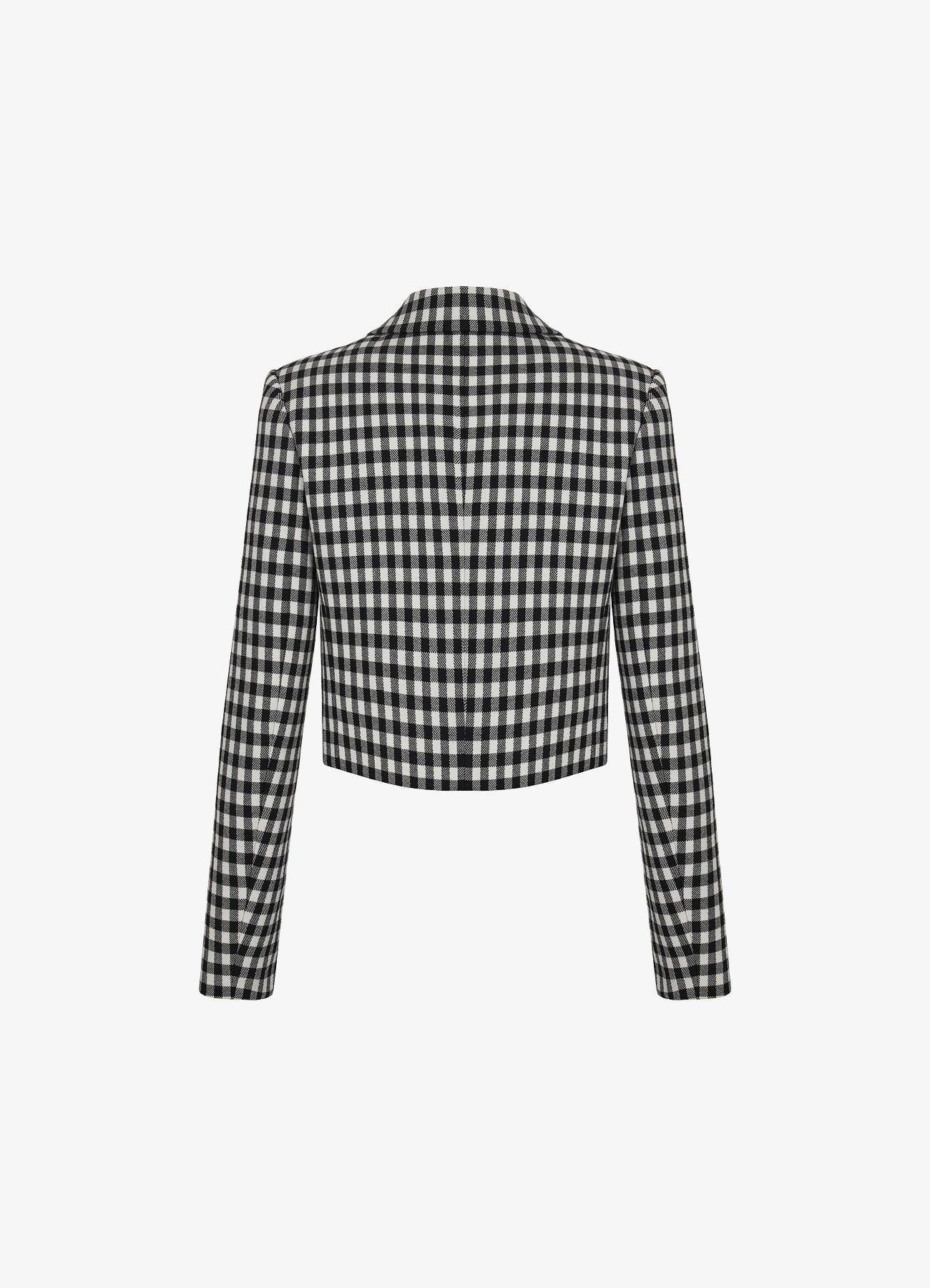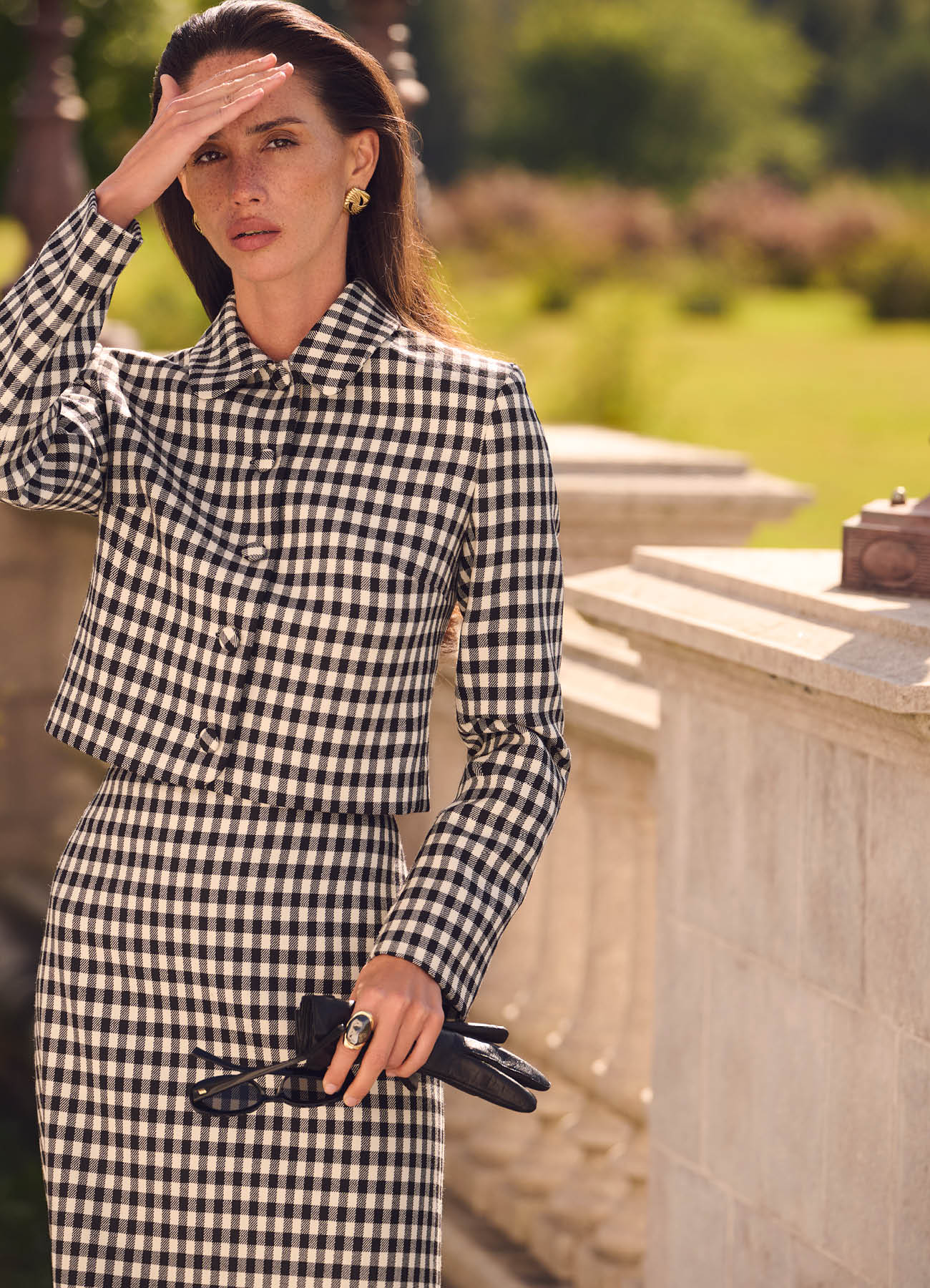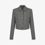 Укороченный жакет из премиальной шерсти в чёрно-белую клетку. Крой подчёркивает талию, лаконичный отложной воротник и обтяжные пуговицы в тон создают цельный и элегантный образ. Дополните комплектной юбкой-трапецией или лаконичными брюками. На подкладке.