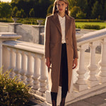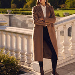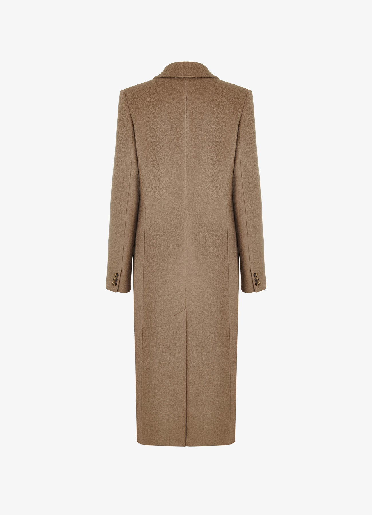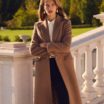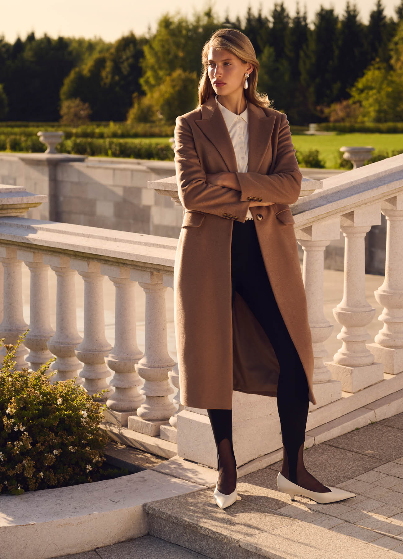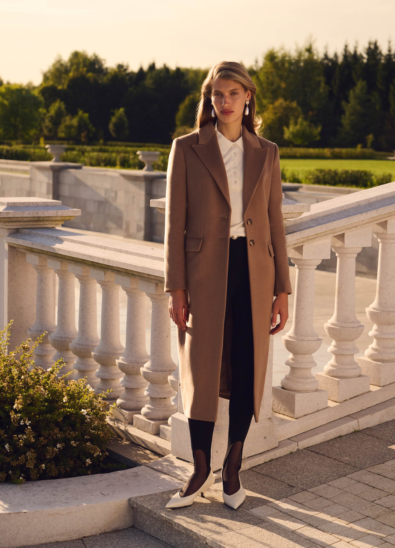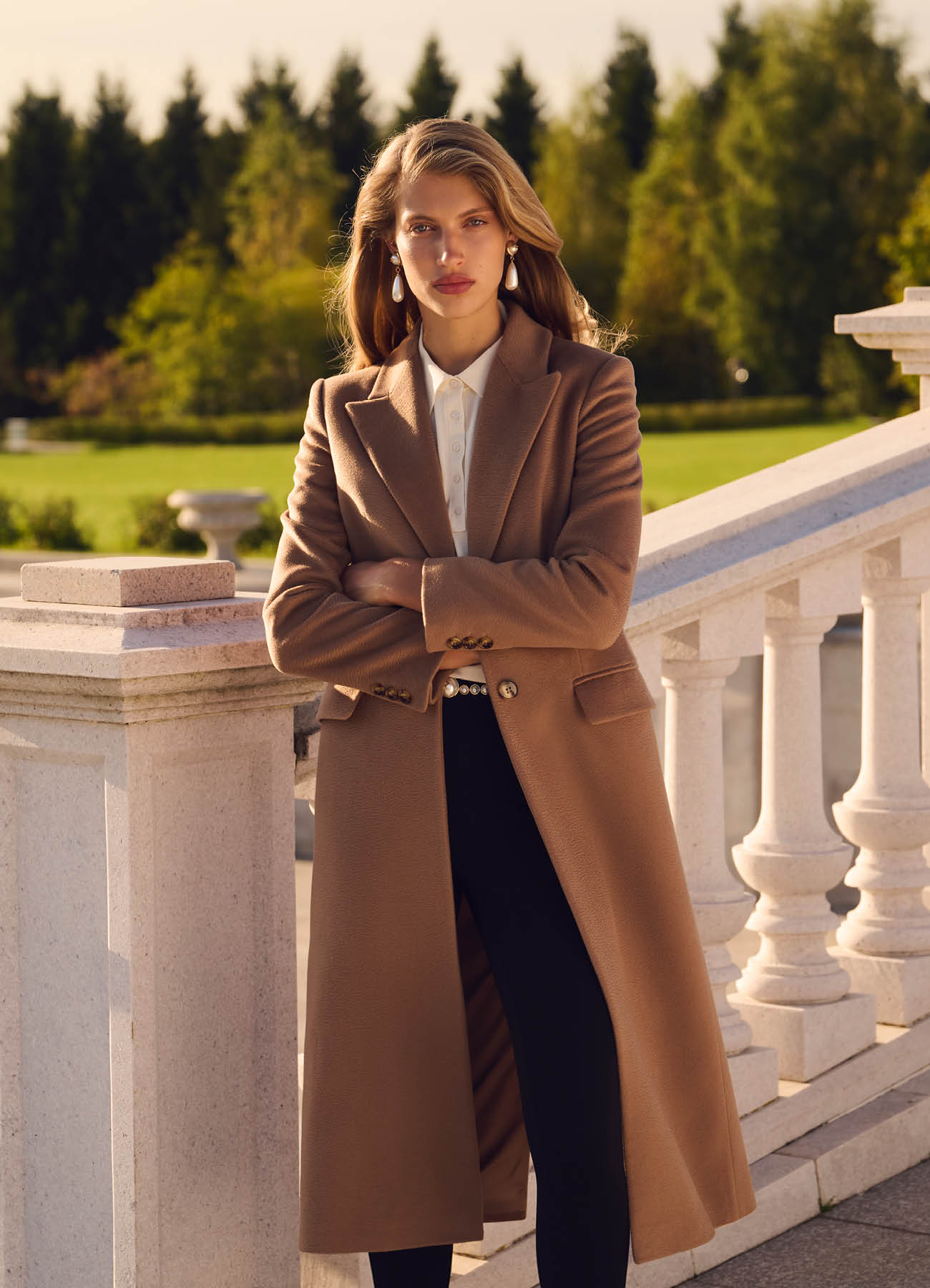 Пальто из премиального состава шерсти и кашемира бежевого цвета с волнистой фактурой. Приталенный крой, длина миди, широкие лацканы и застежка на пуговицы. Прорезные карманы с клапанами подчеркивают строгую линию силуэта. Мягкая ткань сочетает тепло шерсти и гладкость кашемира, подходит для повседневных и деловых выходов. На подкладке.