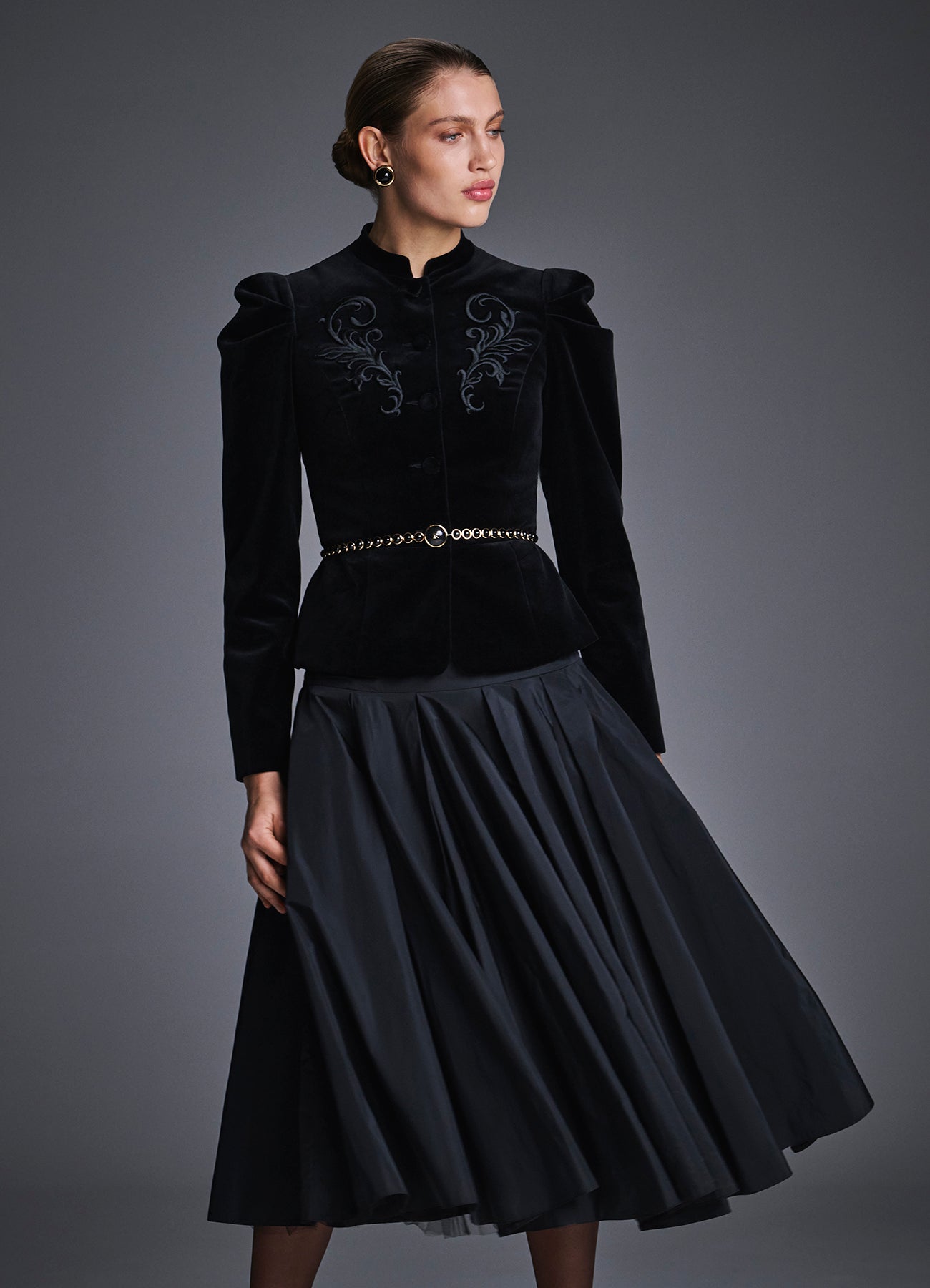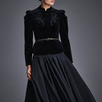 Юбка "Лада" из испанской тафты чёрного цвета. Кокетка, украшенная драпировкой-сборкой, подчёркивает талию. Пышный подол со складками создаёт выразительный объём и эффект лёгкости, а подъюбник из жёсткой сетки придаёт силуэту форму и торжественность. Застёжка на потайную молнию. Дополните боди контрастного цвета. На подкладке.