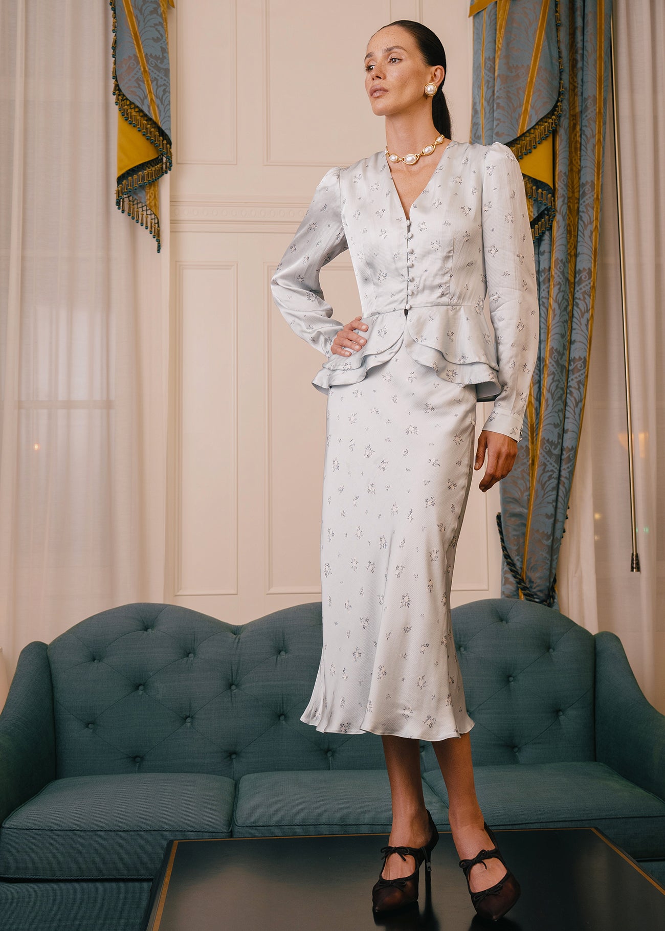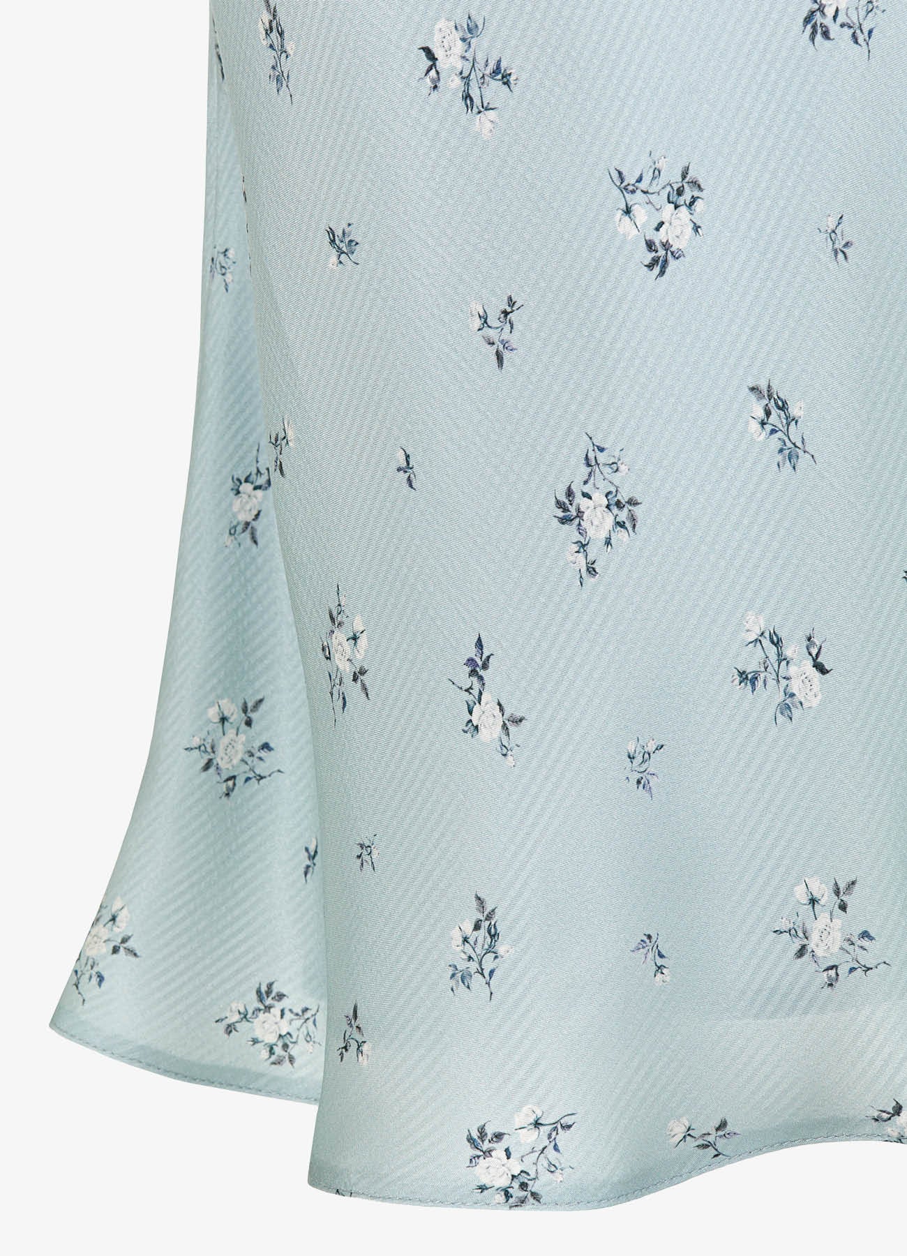 Юбка-годе из вискозы голубого цвета в цветочный принт. Прямой силуэт с лёгким расширением к низу визуально вытягивает фигуру. Идеально сочетается с комплектной блузой, а также с однотонными топами, рубашками и жакетами.