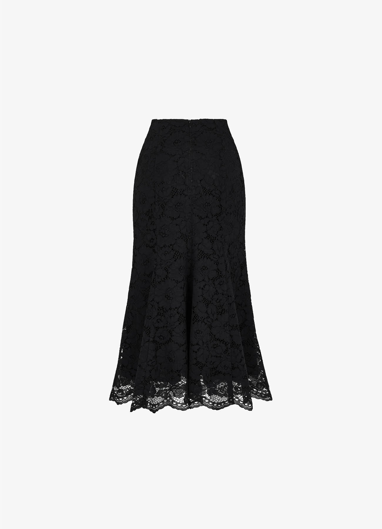 Юбка-годе "Душенька" из кружева черного цвета. Благодаря крою изделие мягко облегает бедра и раскрывается к низу, формируя изящный силуэт. Дополните жакетами из коллекции "Морозко" для праздничного образа. На подкладке.