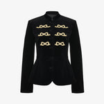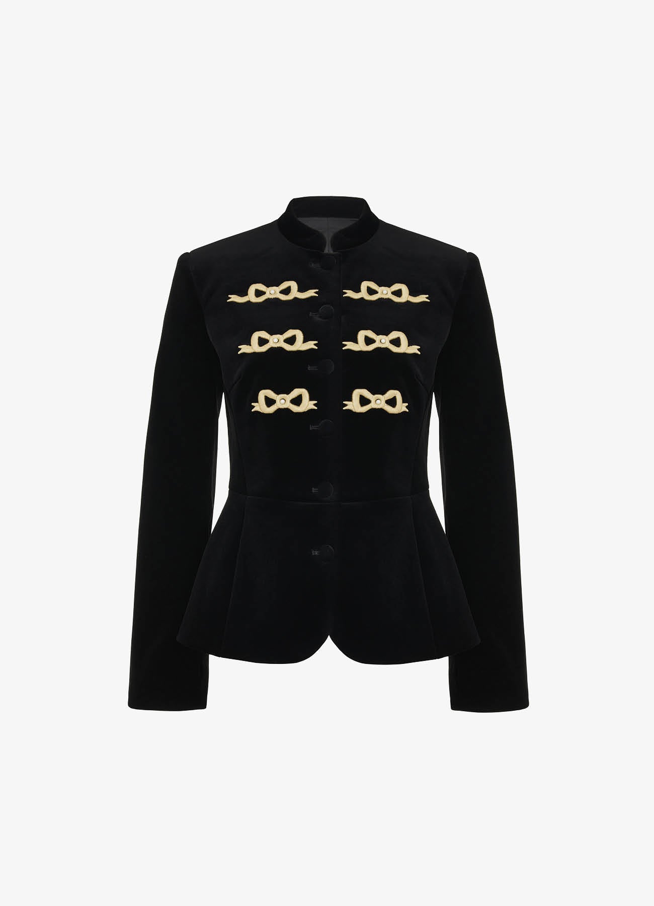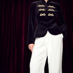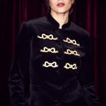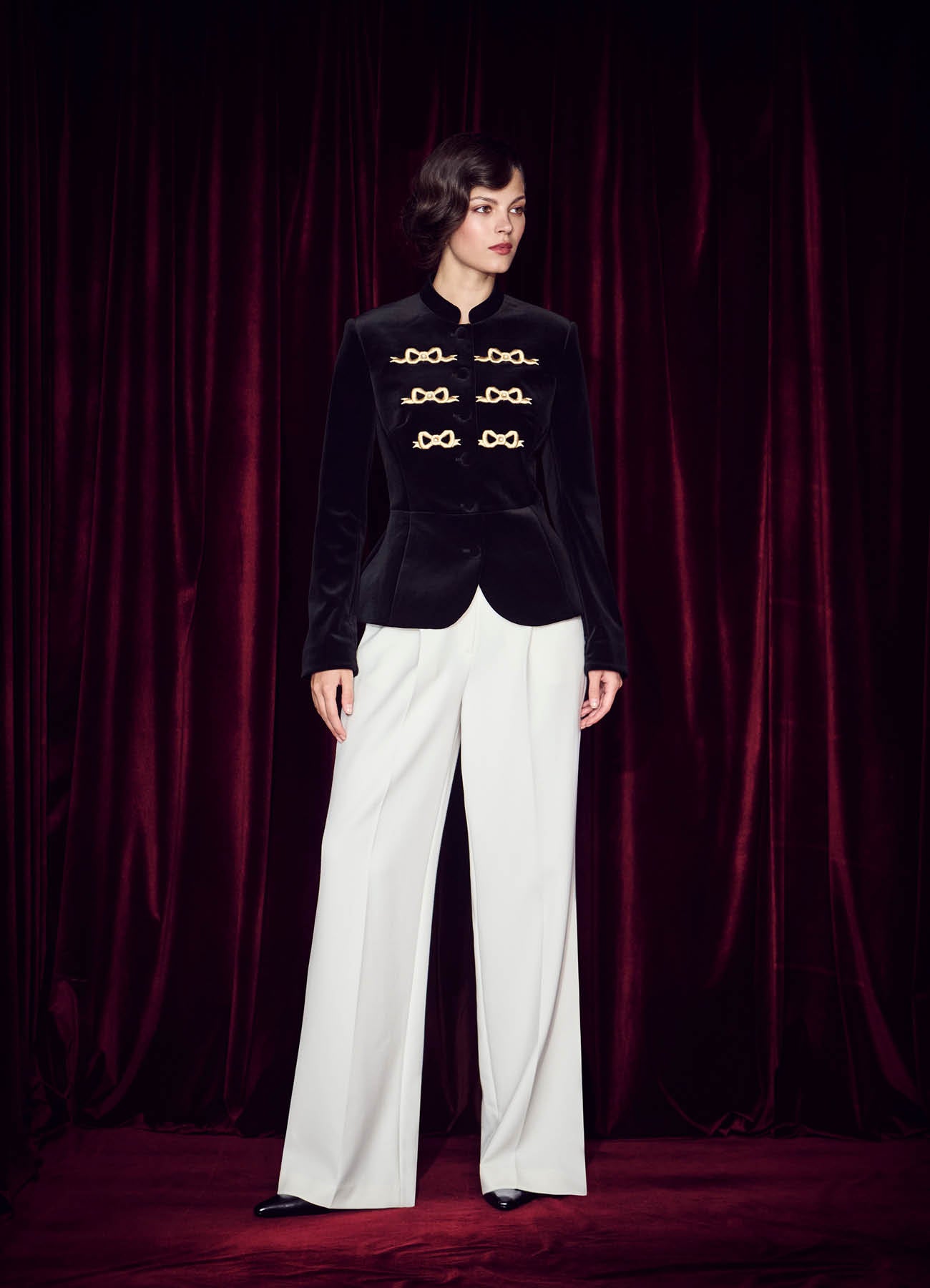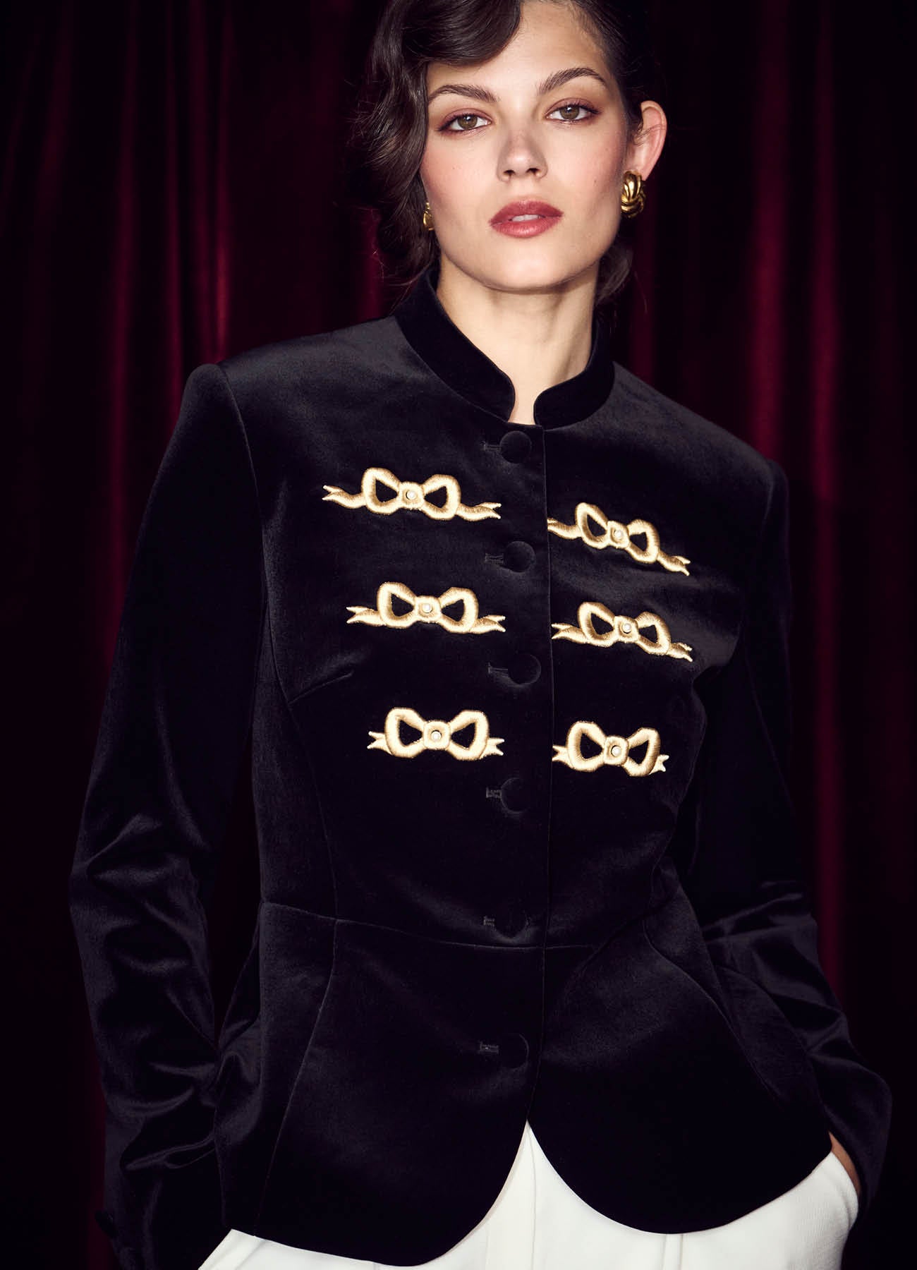Элегантный жакет TSARINETTE из черного бархата с воротником-стойкой и объемной вышивкой, украшенной жемчугом. Силуэт модели вдохновлен гусарской формой XIX века и парадной униформой европейских императорских дворов. Изделия Roseville с вышивкой сочетают машинный и ручной труд и являются настоящим объектом коллекционирования. Жакет идеально сочетается с комплектной юбкой из бархата Crown jewel, а также с брюками или джинсами.