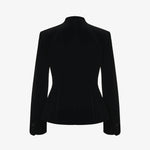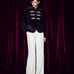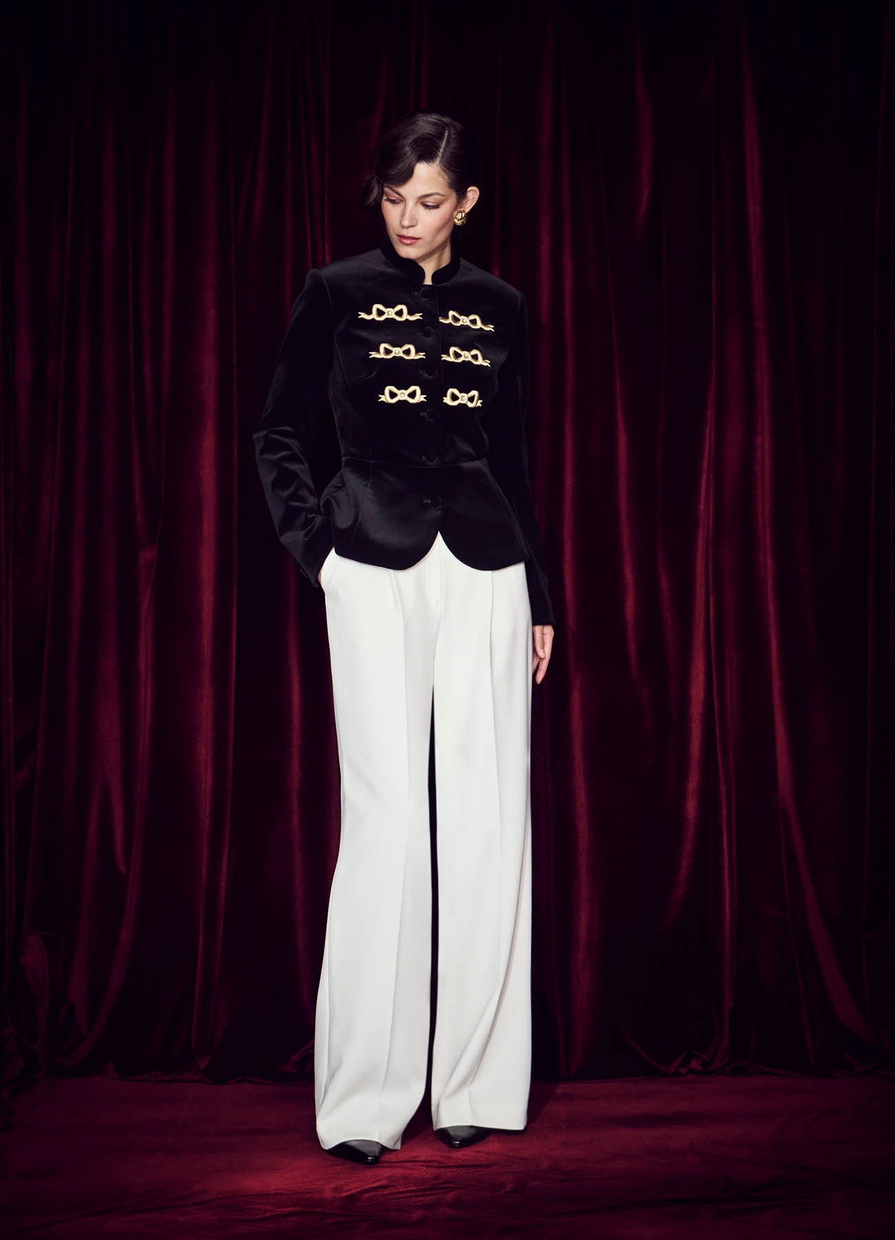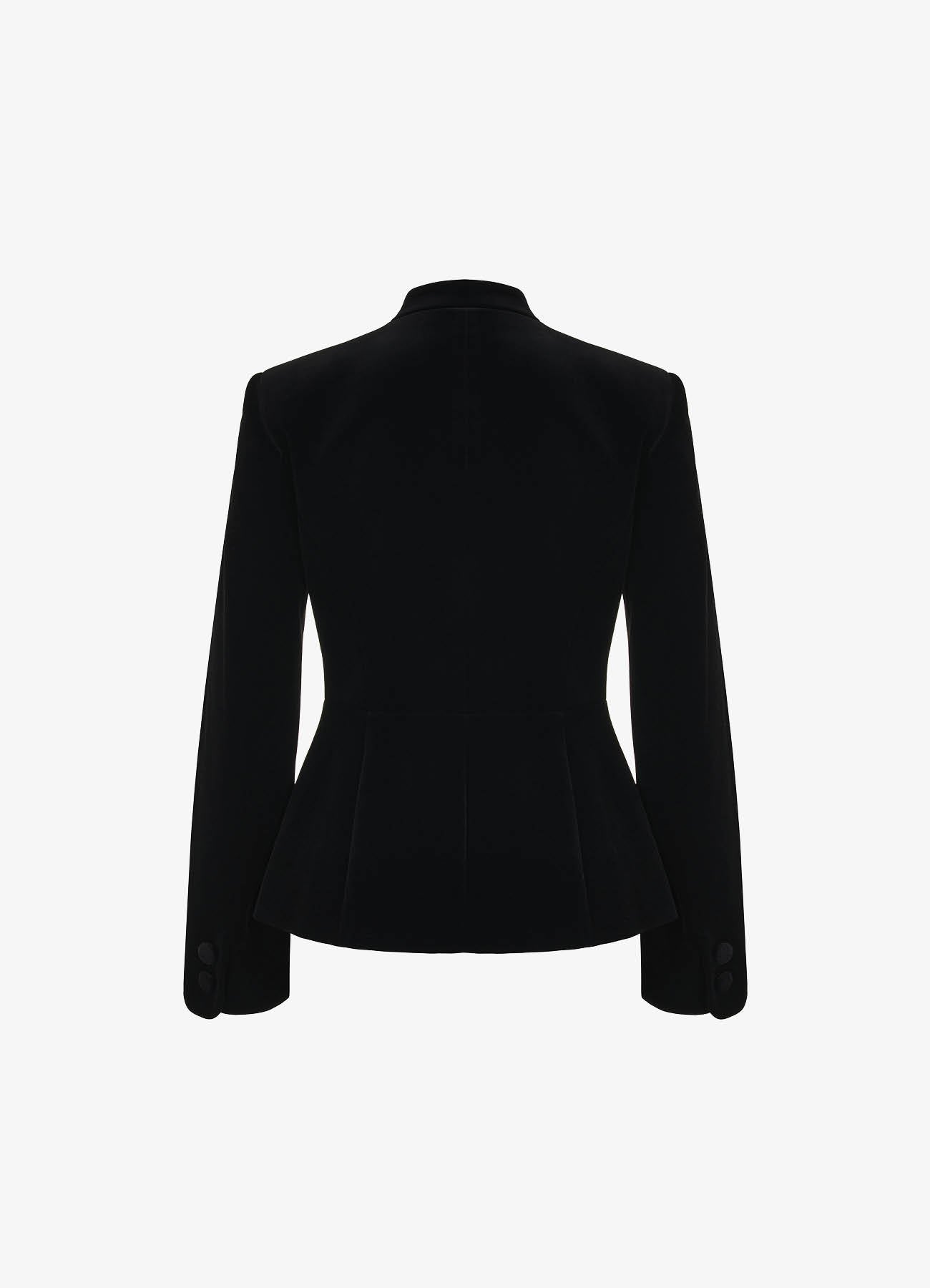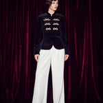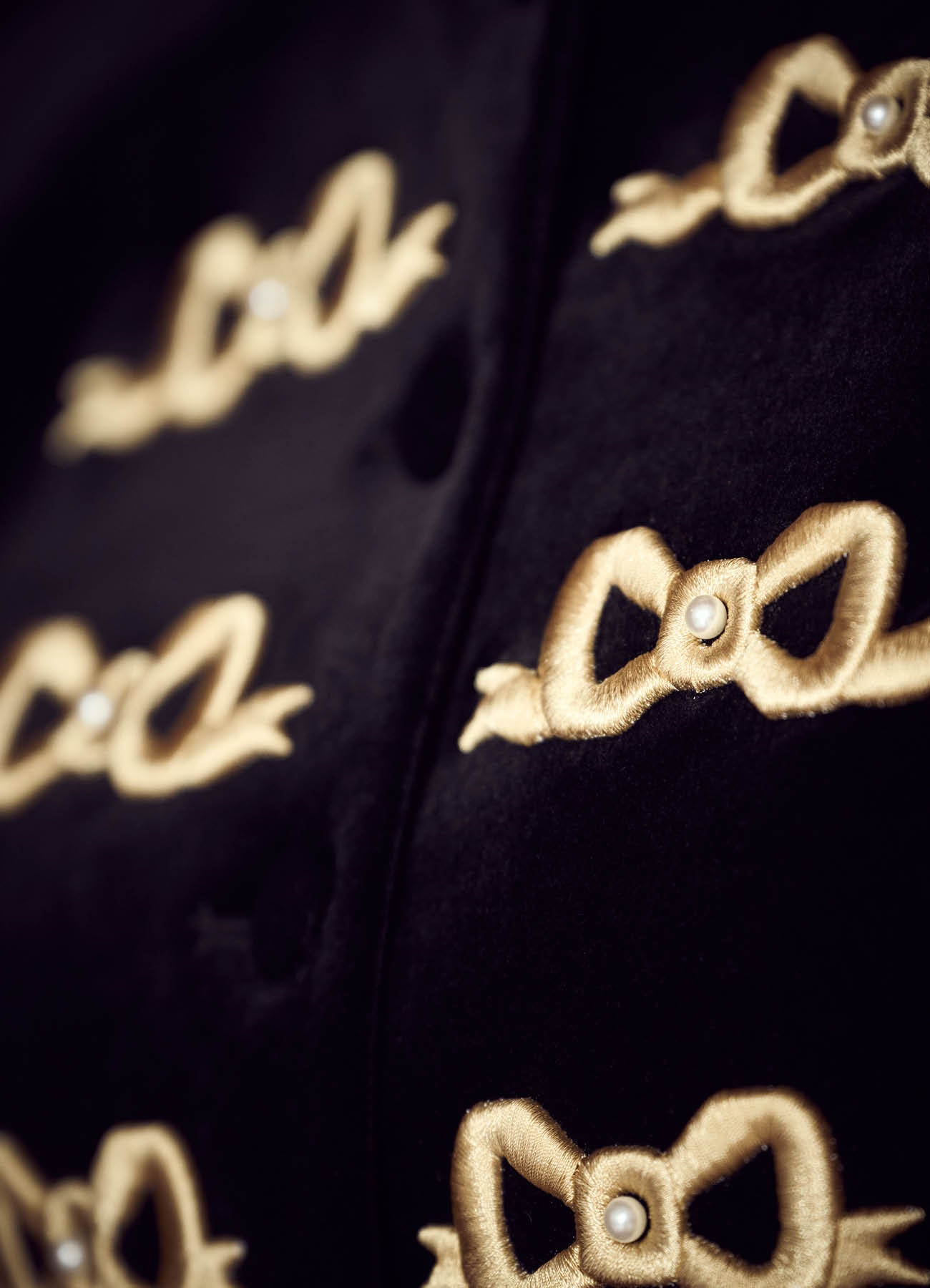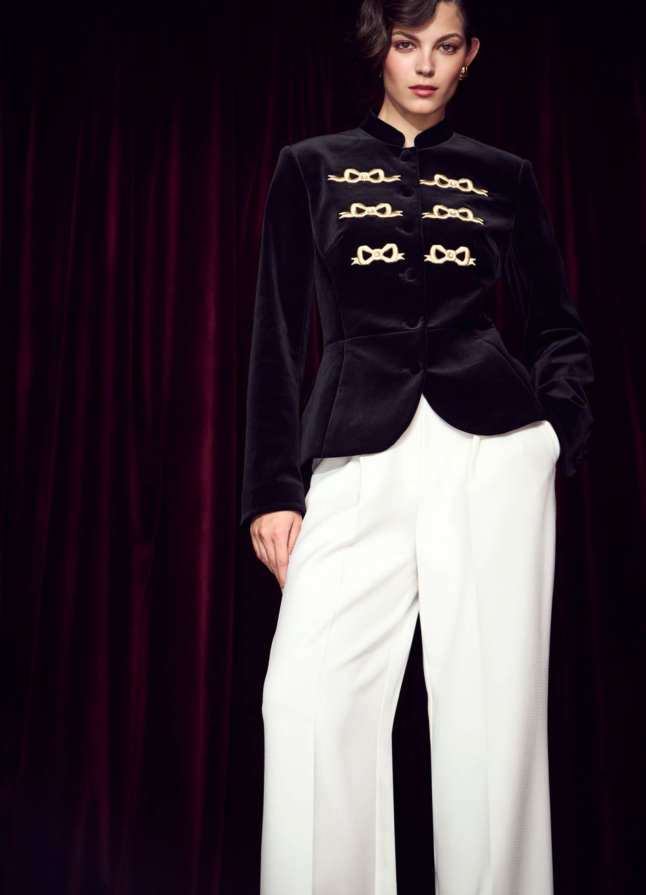 Элегантный жакет TSARINETTE из черного бархата с воротником-стойкой и объемной вышивкой, украшенной жемчугом. Силуэт модели вдохновлен гусарской формой XIX века и парадной униформой европейских императорских дворов. Изделия Roseville с вышивкой сочетают машинный и ручной труд и являются настоящим объектом коллекционирования. Жакет идеально сочетается с комплектной юбкой из бархата Crown jewel, а также с брюками или джинсами.