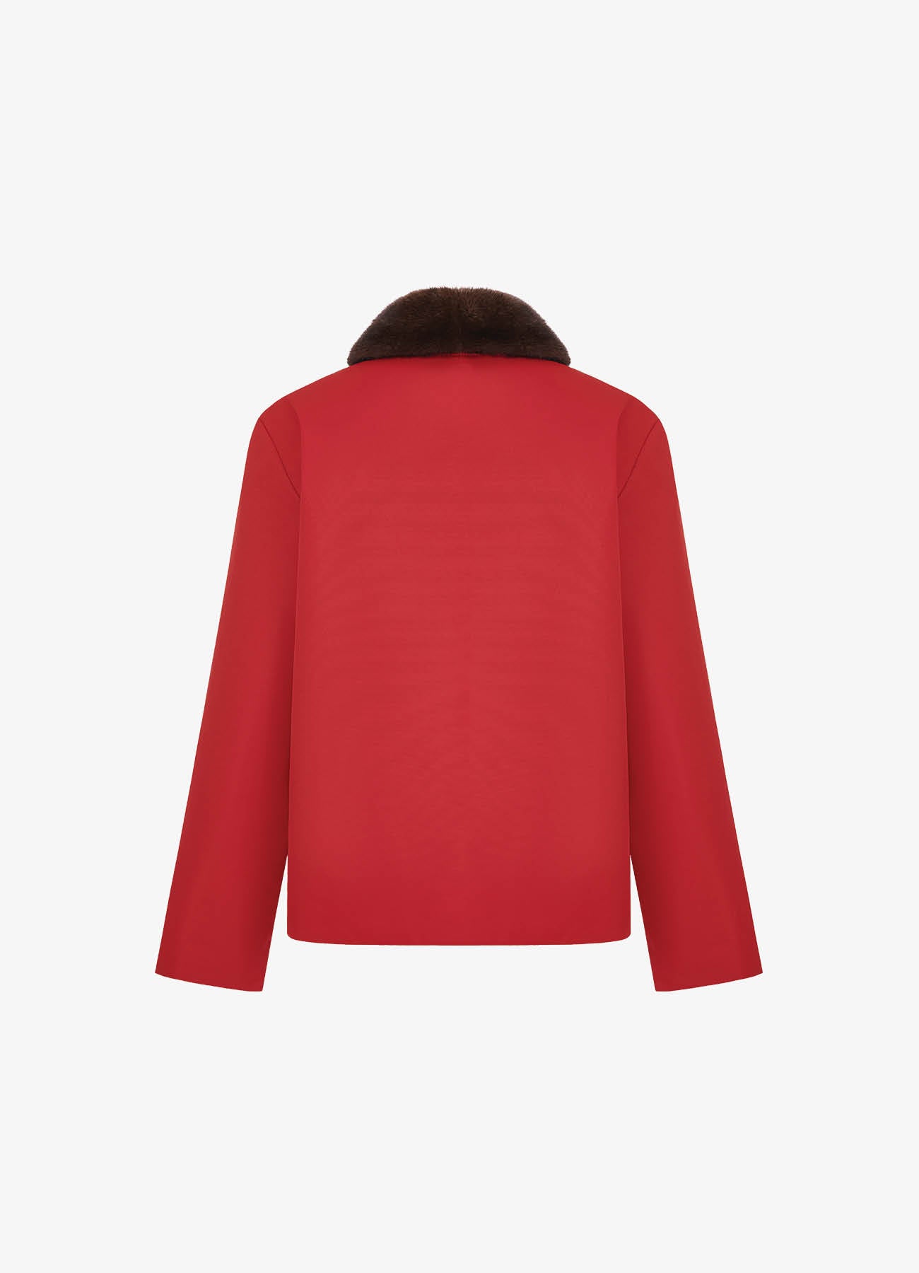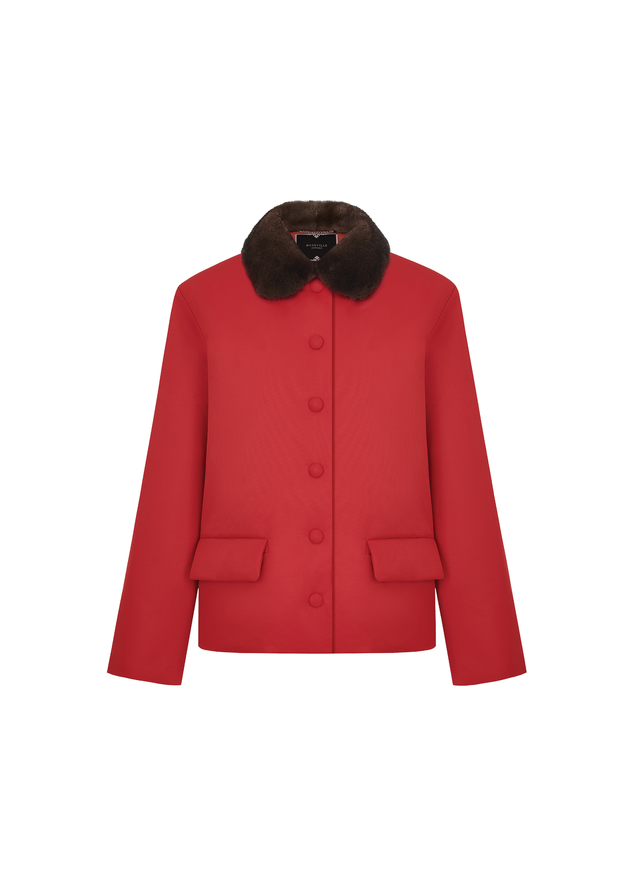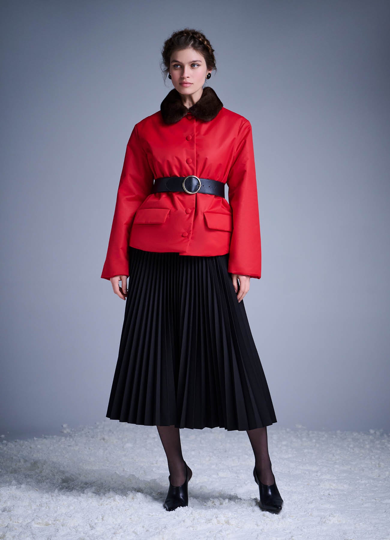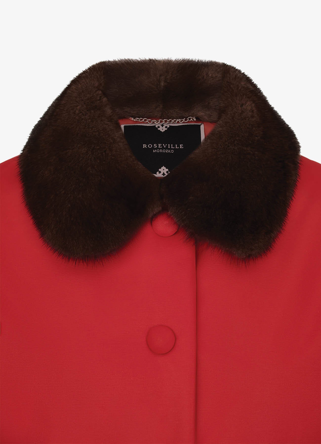 Куртка "Жар-птица" прямого силуэта из водонепроницаемой ткани красного цвета. Отложной воротник дополнен съёмным воротником из натуральной норки темно-шоколадного цвета, обтяжные кнопки в тон основной ткани. Утеплитель из синтепона обеспечивает комфорт и защиту от холода. Куртка сочетает функциональность верхней одежды с изящными декоративными элементами.