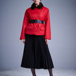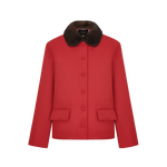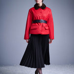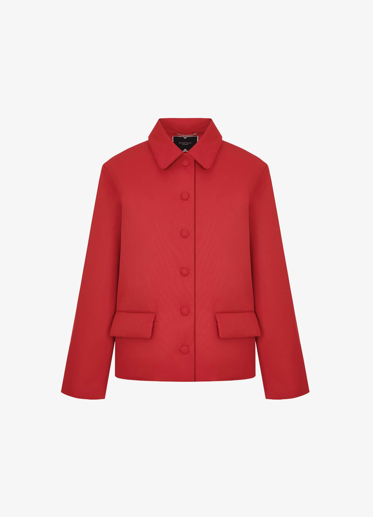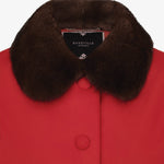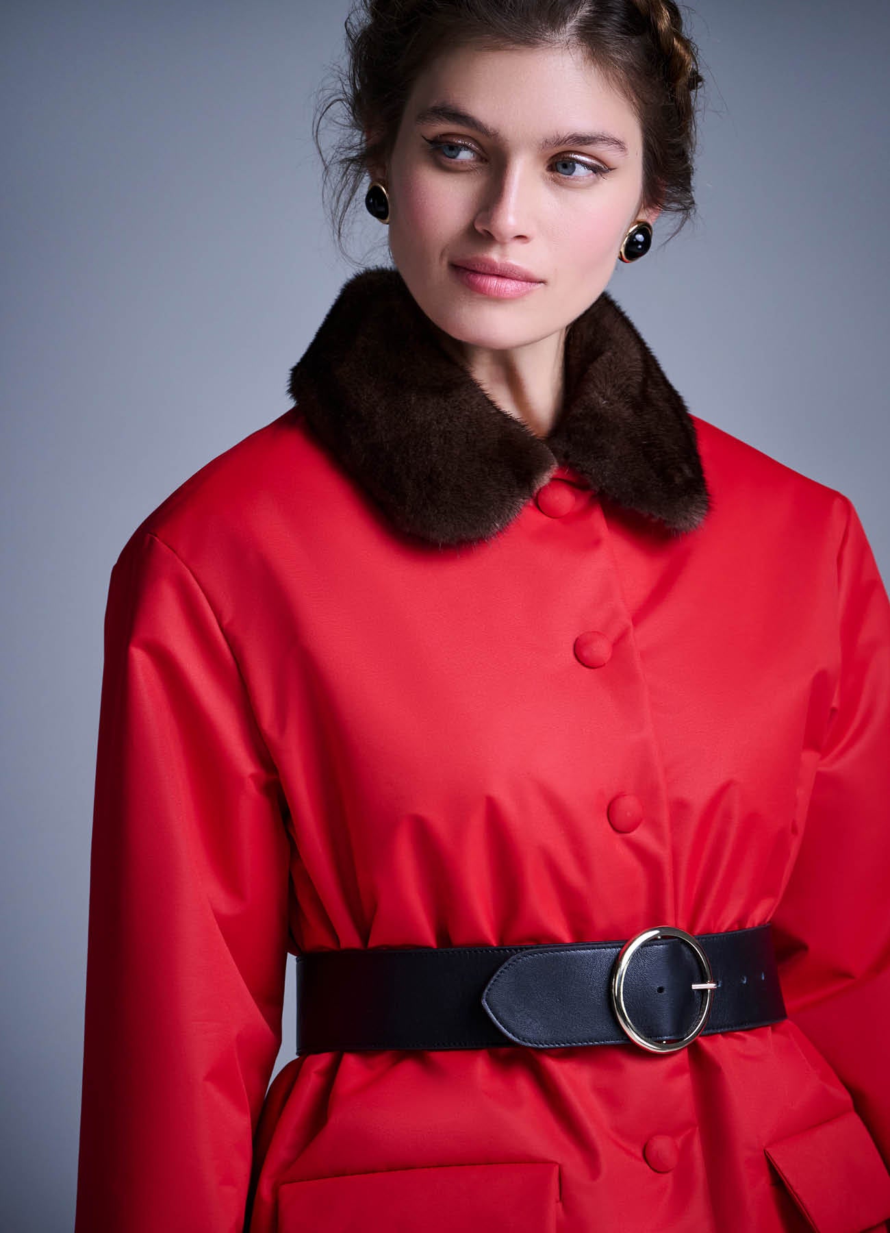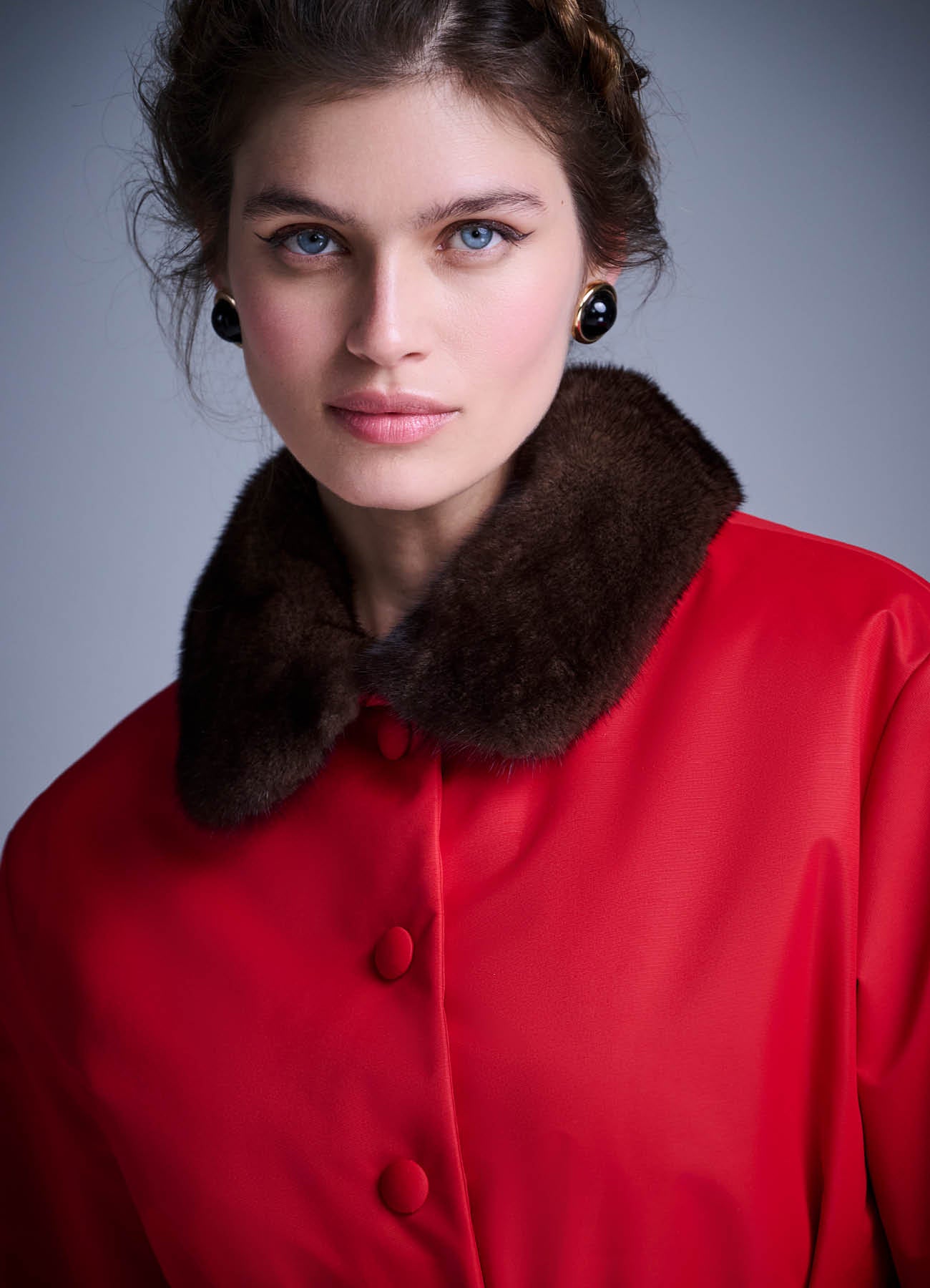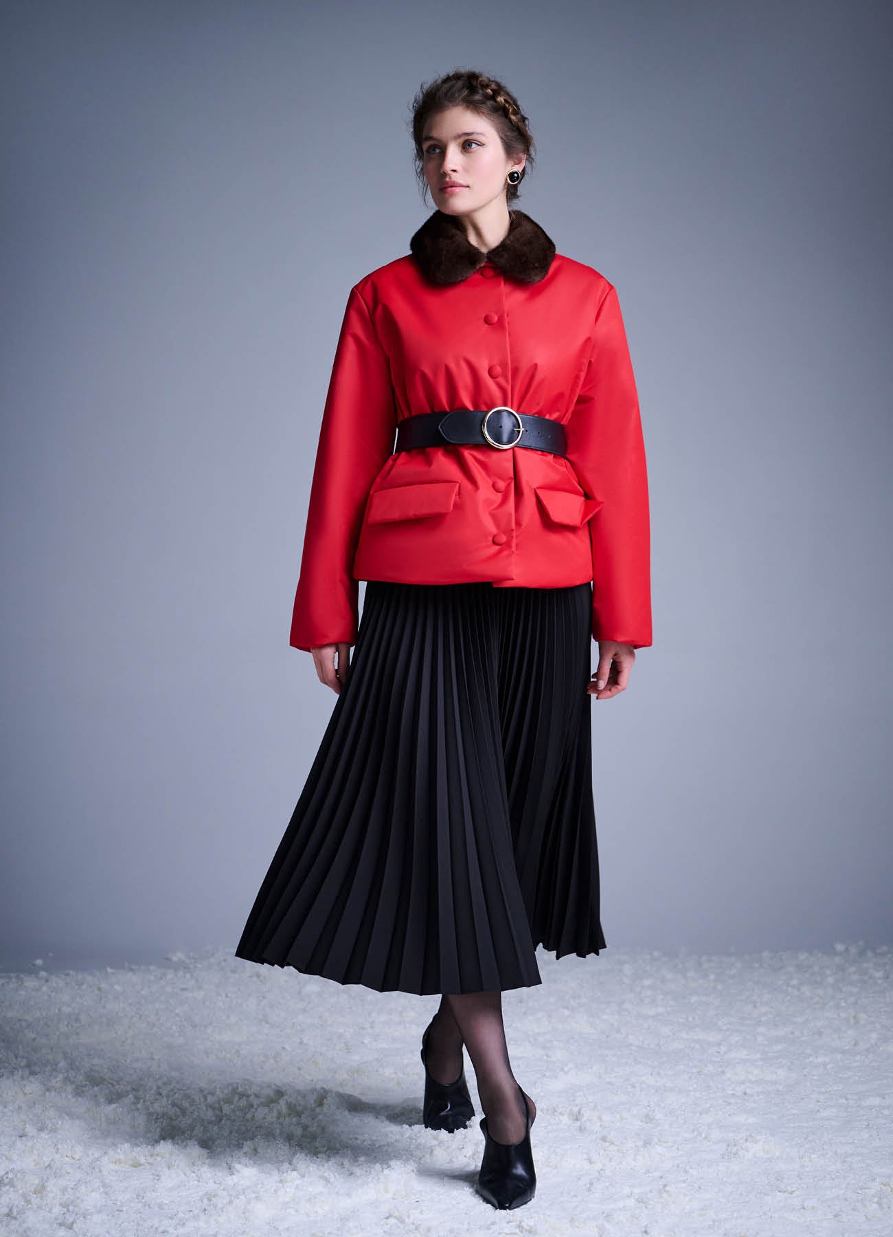 Куртка "Жар-птица" прямого силуэта из водонепроницаемой ткани красного цвета. Отложной воротник дополнен съёмным воротником из натуральной норки темно-шоколадного цвета, обтяжные кнопки в тон основной ткани. Утеплитель из синтепона обеспечивает комфорт и защиту от холода. Куртка сочетает функциональность верхней одежды с изящными декоративными элементами.