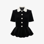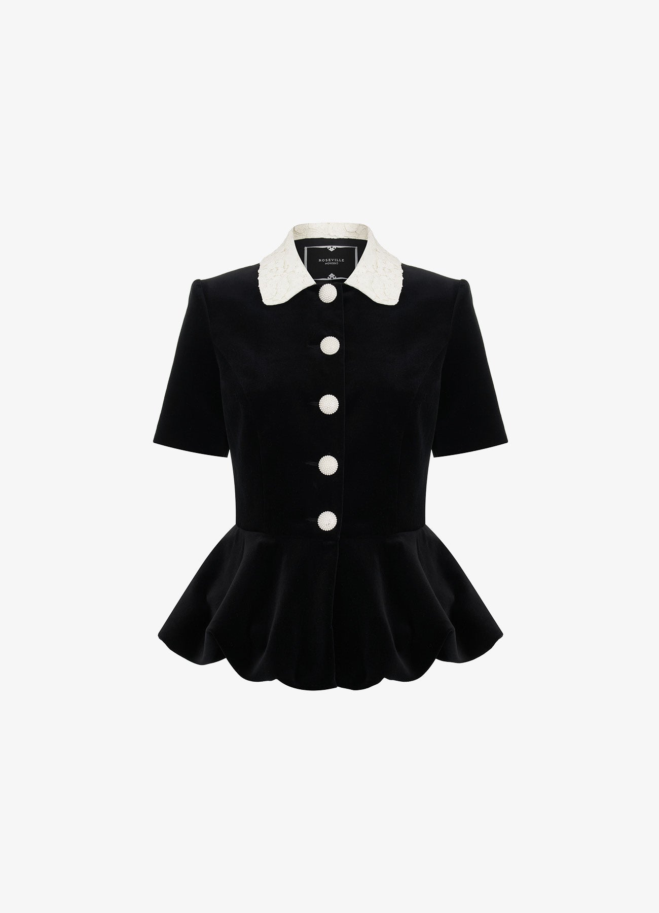 Жакет "Голубка" из бархата. Модель длиной до бедер с акцентом на талии в виде пышной баски. Горловина украшена акцентным отложным воротником из молочного кружева на подкладке в тон. Жакет застегивается на металлические пуговицы, украшенные россыпью мелких жемчужных бусин. Дополните комплектной юбкой из бархата "Голубка" для завершения праздничного  образа. На подкладке.