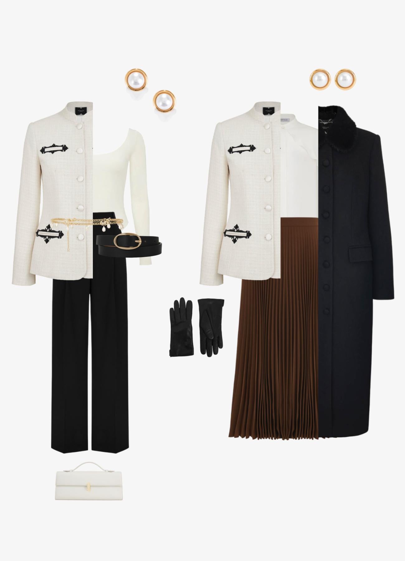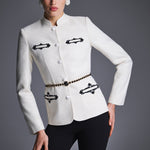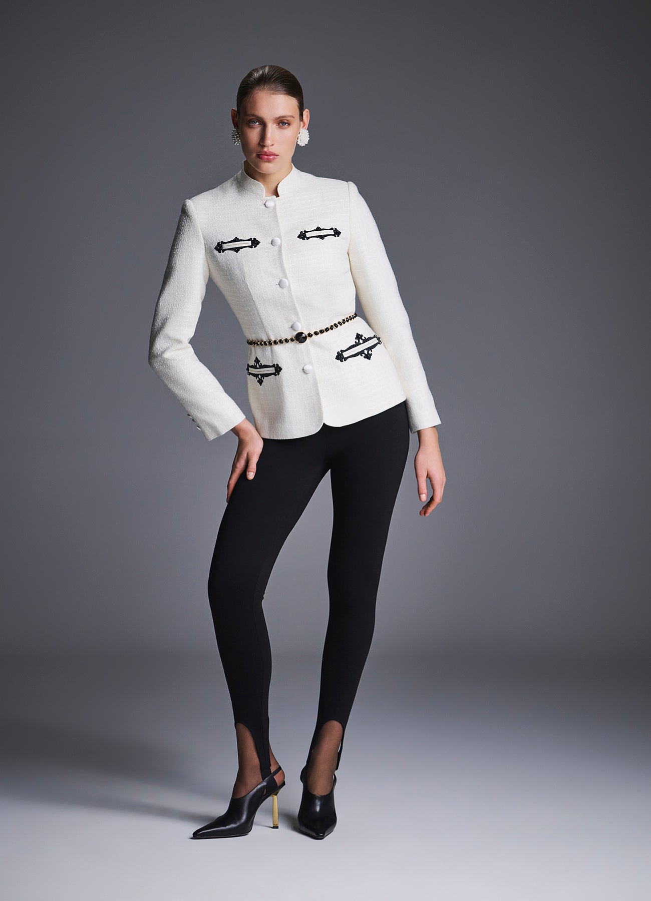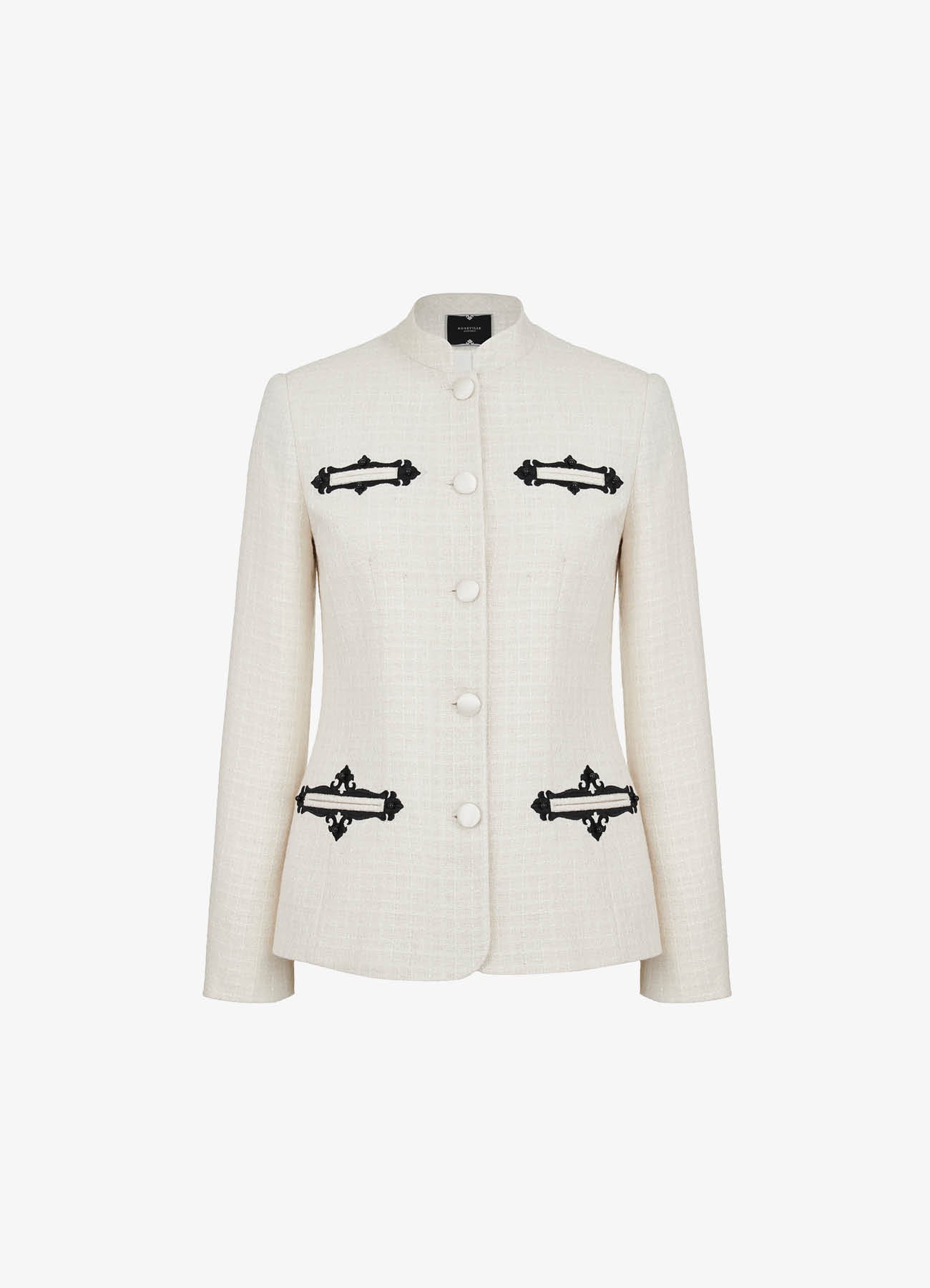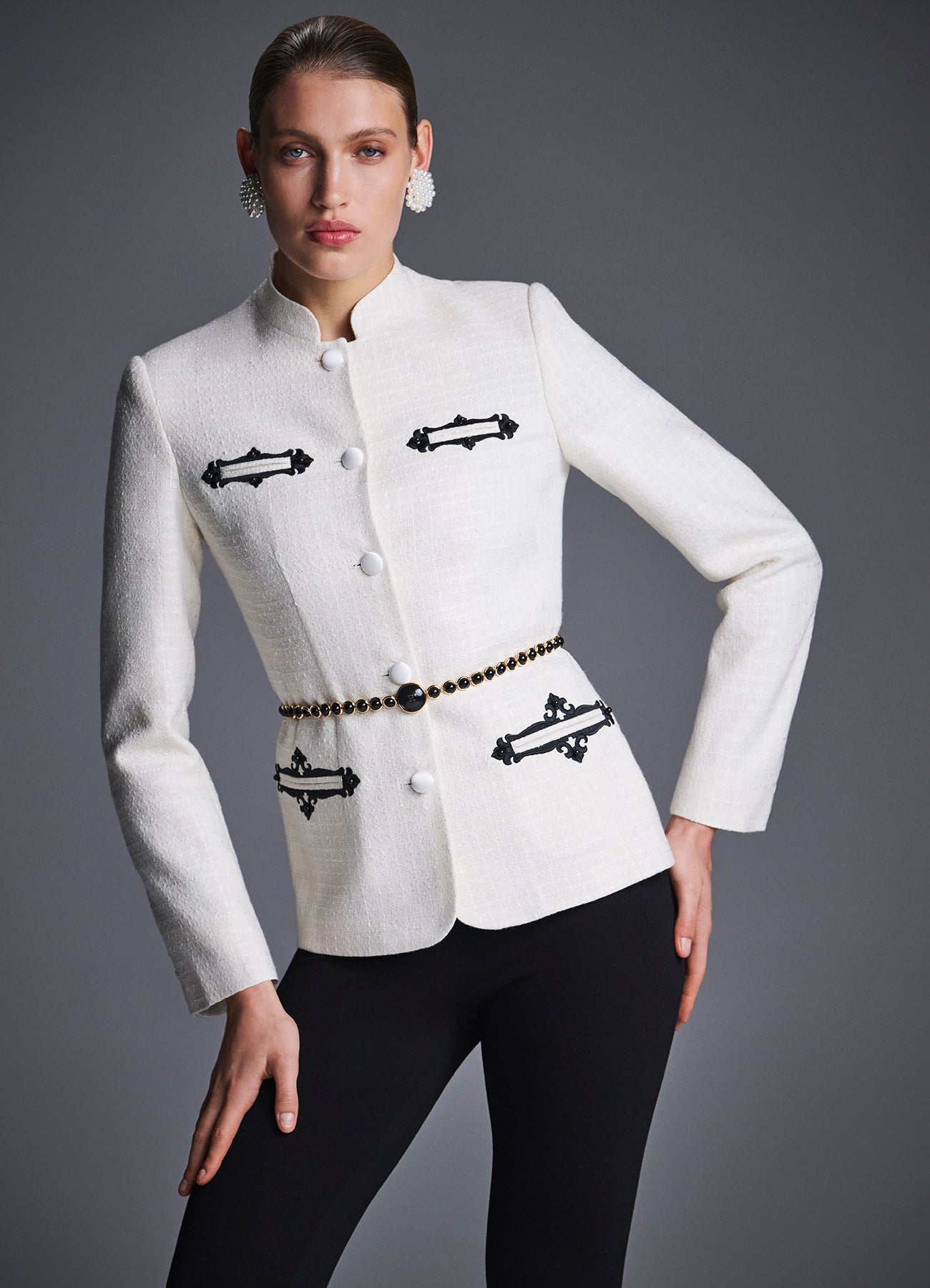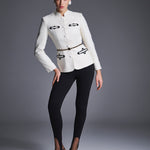 Жакет "Ясна" из молочного букле с вышивкой, имитирующей старинный узор оконных наличников. Приталенный крой, воротник-стойка и аккуратные подплечники создают утончённый, архитектурный силуэт. Изделие дополнено контрастной вышивкой в виде декоративных рамок с вензелями и вставками из чёрных жемчужин. Застегивается на атласные обтяжные пуговицы в тон ткани. Сочетайте с юбкой из комплекта "Ясна" или с брюками контрастного цвета. На подкладке.
