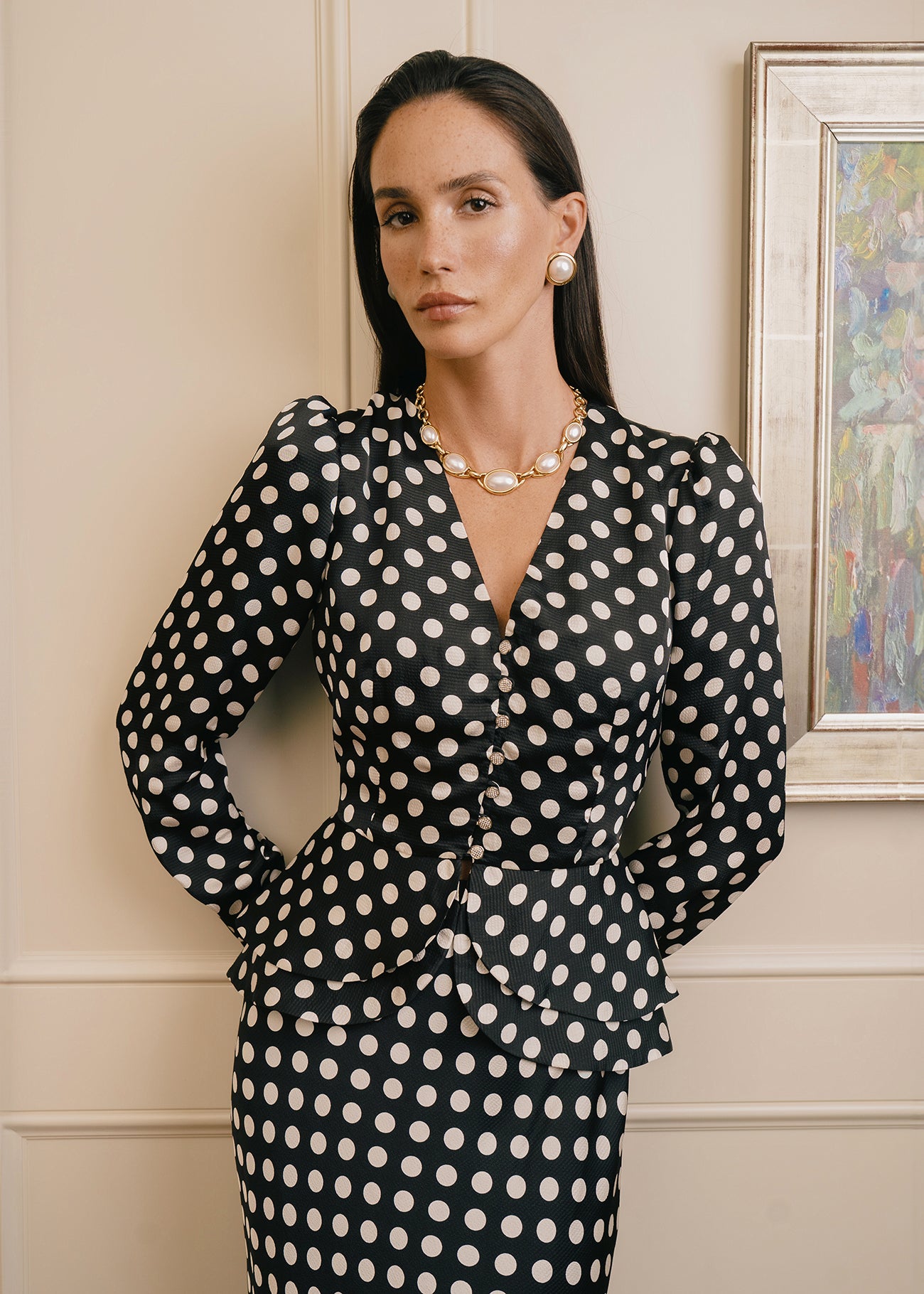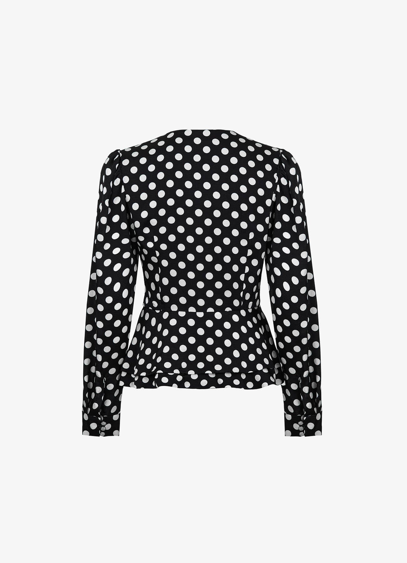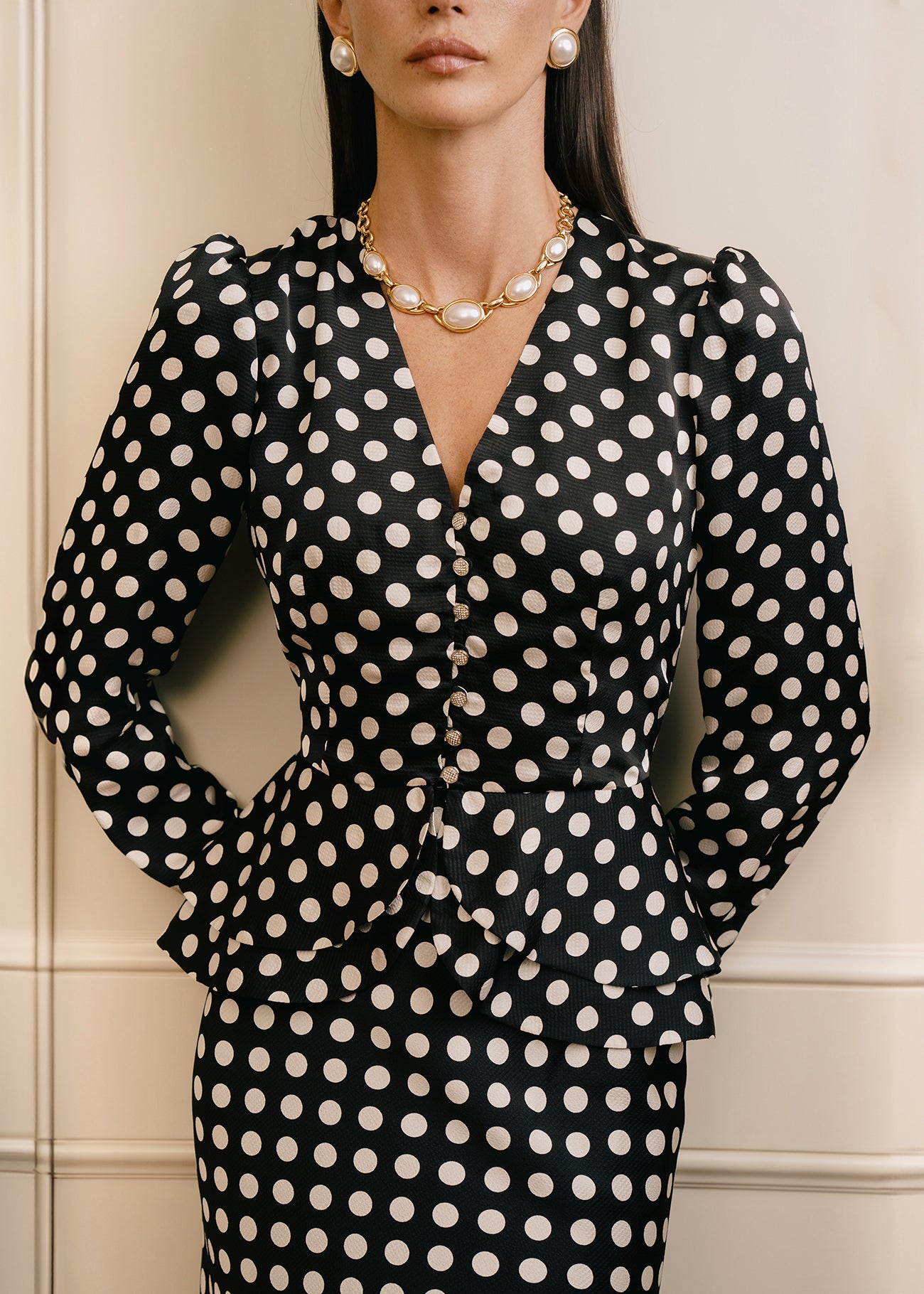Блуза из вискозы черного цвета в горох. Выполнена из легкой ткани, которая хорошо держит форму и приятна к телу. Приталенный силуэт с аккуратной баской подчёркивает фигуру, V-образный вырез и обтяжные пуговицы завершают образ. Дополните комплектной юбкой или сочетайте с однотонными брюками, юбками и джинсами.