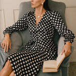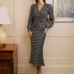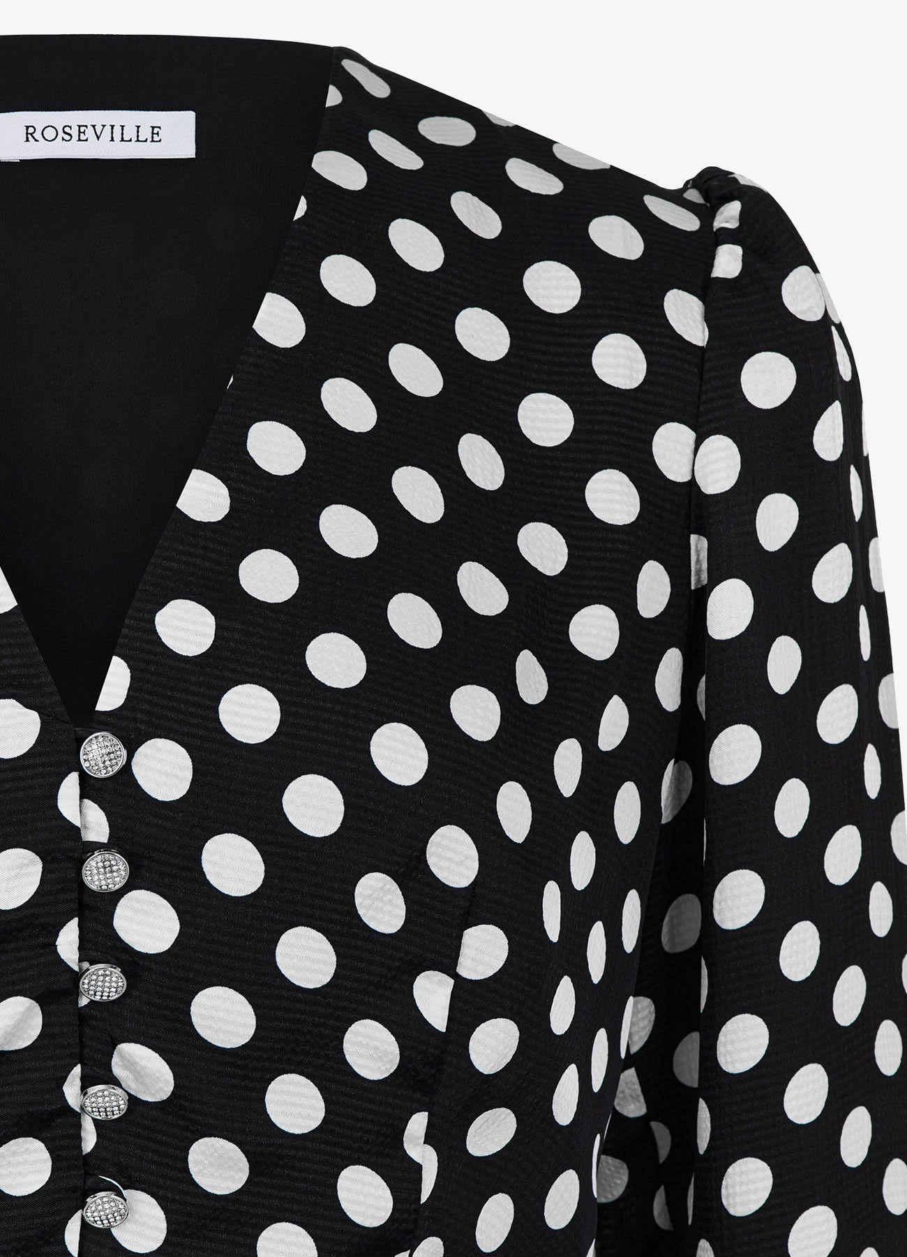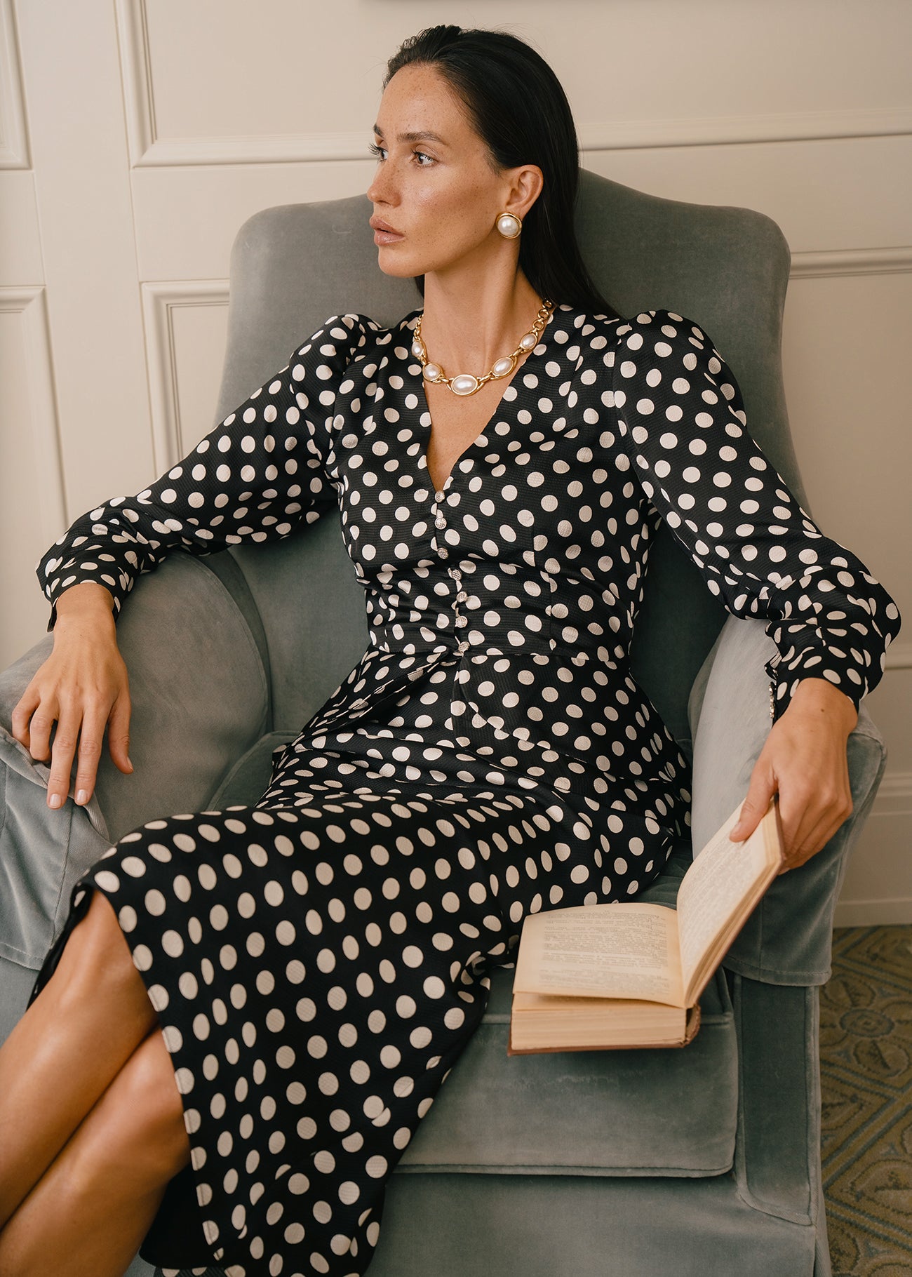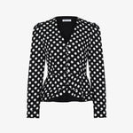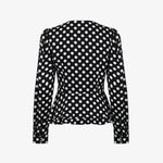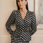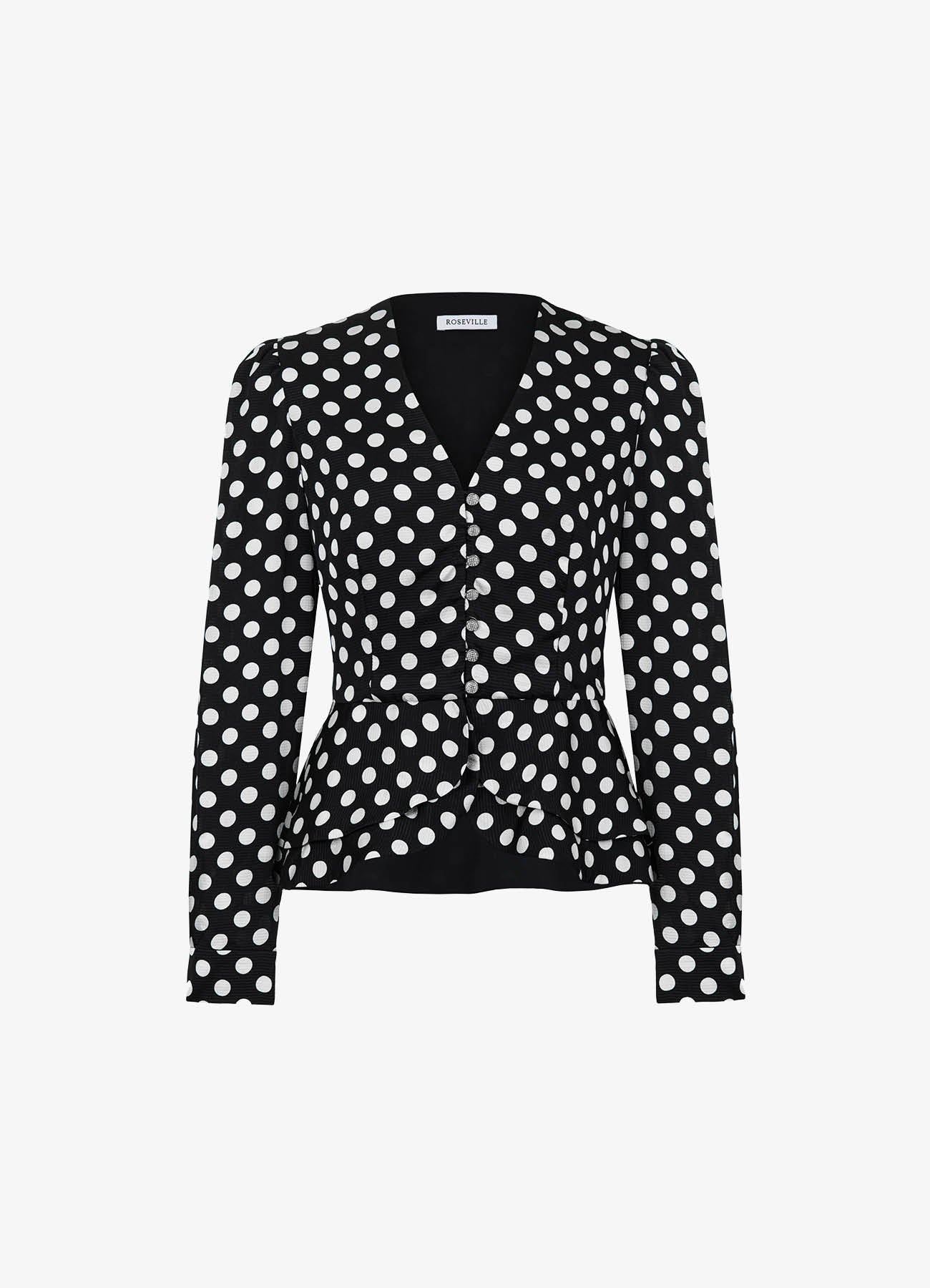Блуза из вискозы черного цвета в горох. Выполнена из легкой ткани, которая хорошо держит форму и приятна к телу. Приталенный силуэт с аккуратной баской подчёркивает фигуру, V-образный вырез и обтяжные пуговицы завершают образ. Дополните комплектной юбкой или сочетайте с однотонными брюками, юбками и джинсами.