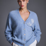 Кардиган из мягкой воздушной ангоры небесно-голубого оттенка. Объёмный силуэт с заниженной линией плеча создаёт ощущение уюта и лёгкости. Акцентная вышивка из жемчужных бусин в форме цветка и пуговицы гармонично завершают образ. Носите с юбками, платьями и брюками — кардиган легко адаптируется и к базовым, и к вечерним сочетаниям.