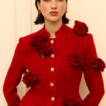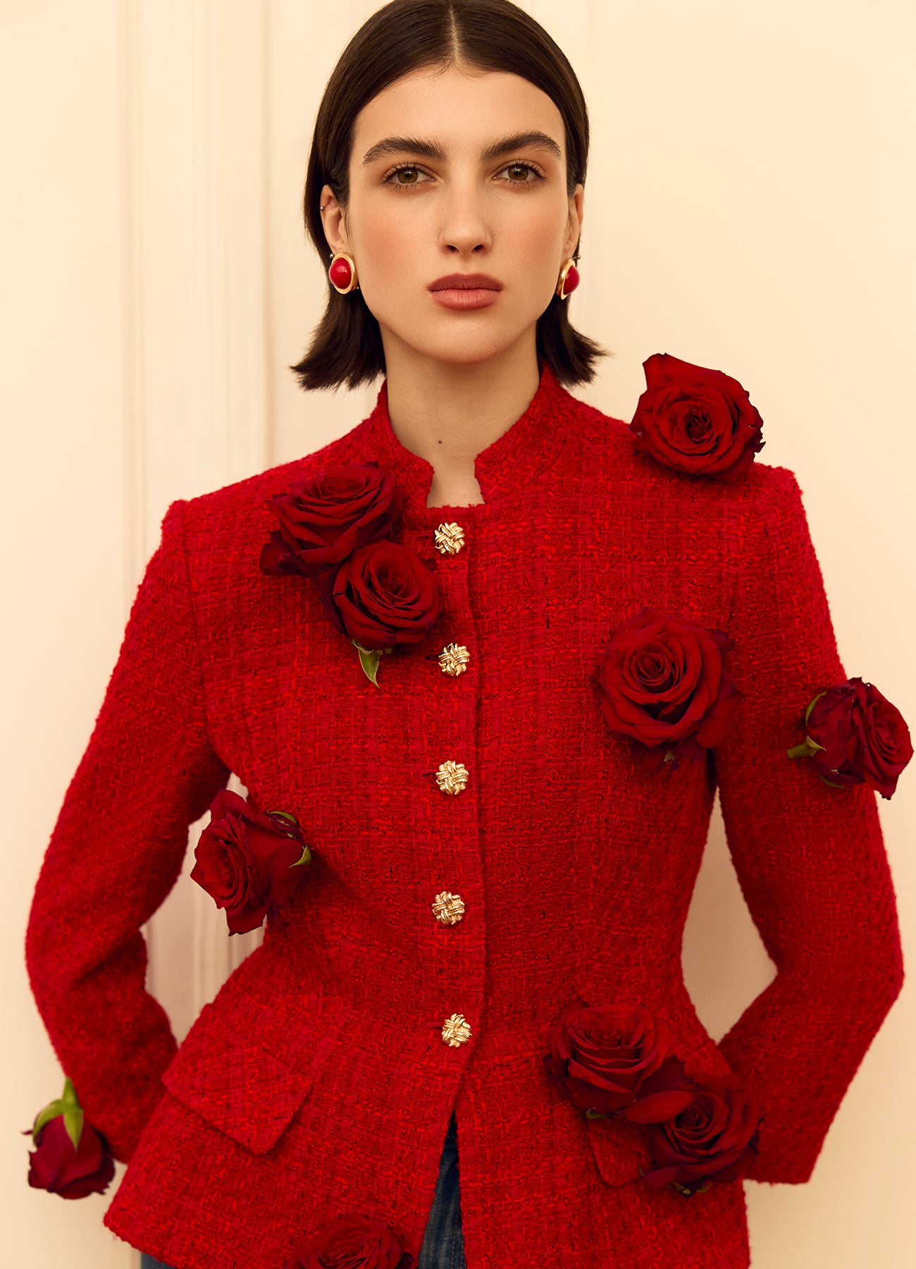 Жакет из букле с приталенным силуэтом подчёркивает фигуру и создаёт элегантный, собранный образ. Аккуратный воротник-стойка, рукава 3/4 и декоративные металлические пуговицы с рельефным узором добавляют выразительные акценты. Для яркого выхода сочетайте жакет с комплектной юбкой в тон, для повседневного образа — с джинсами, а для делового гардероба — с классическими брюками или юбкой.