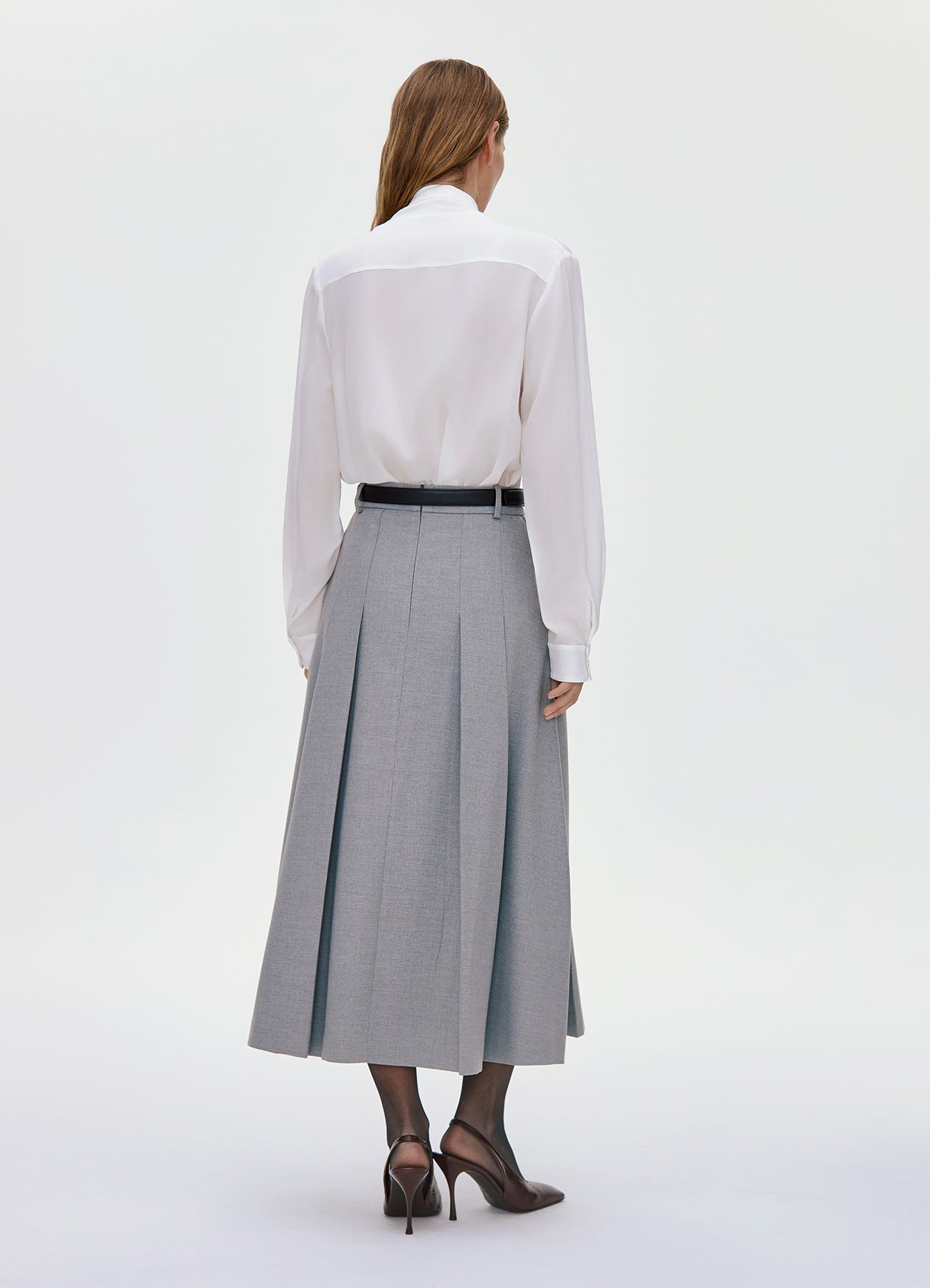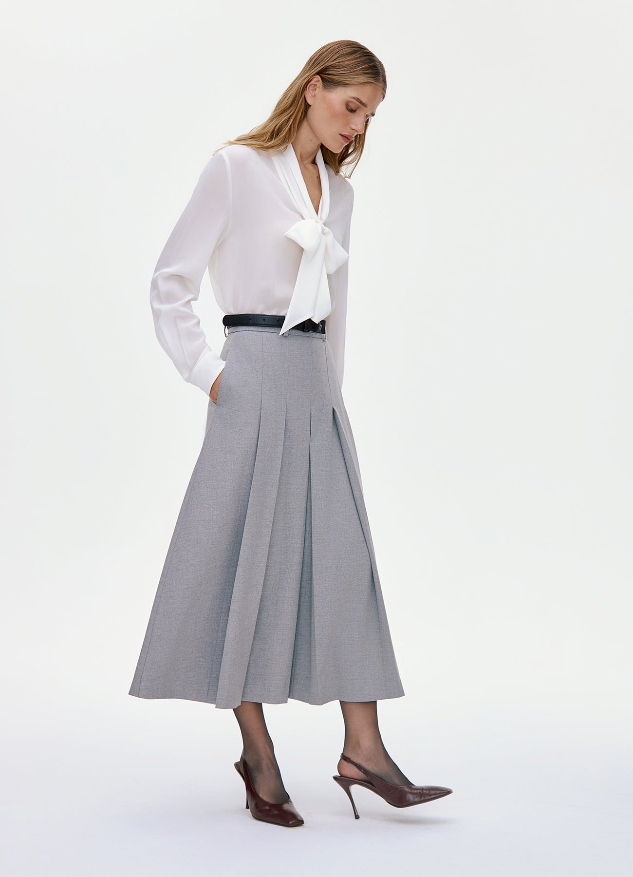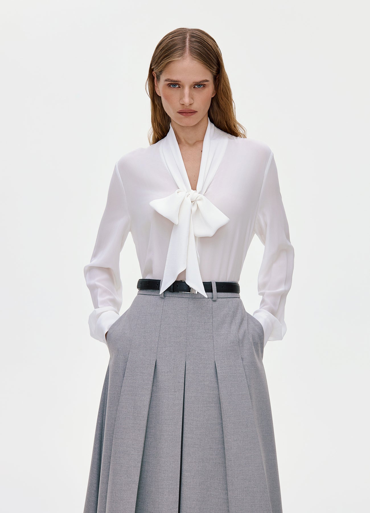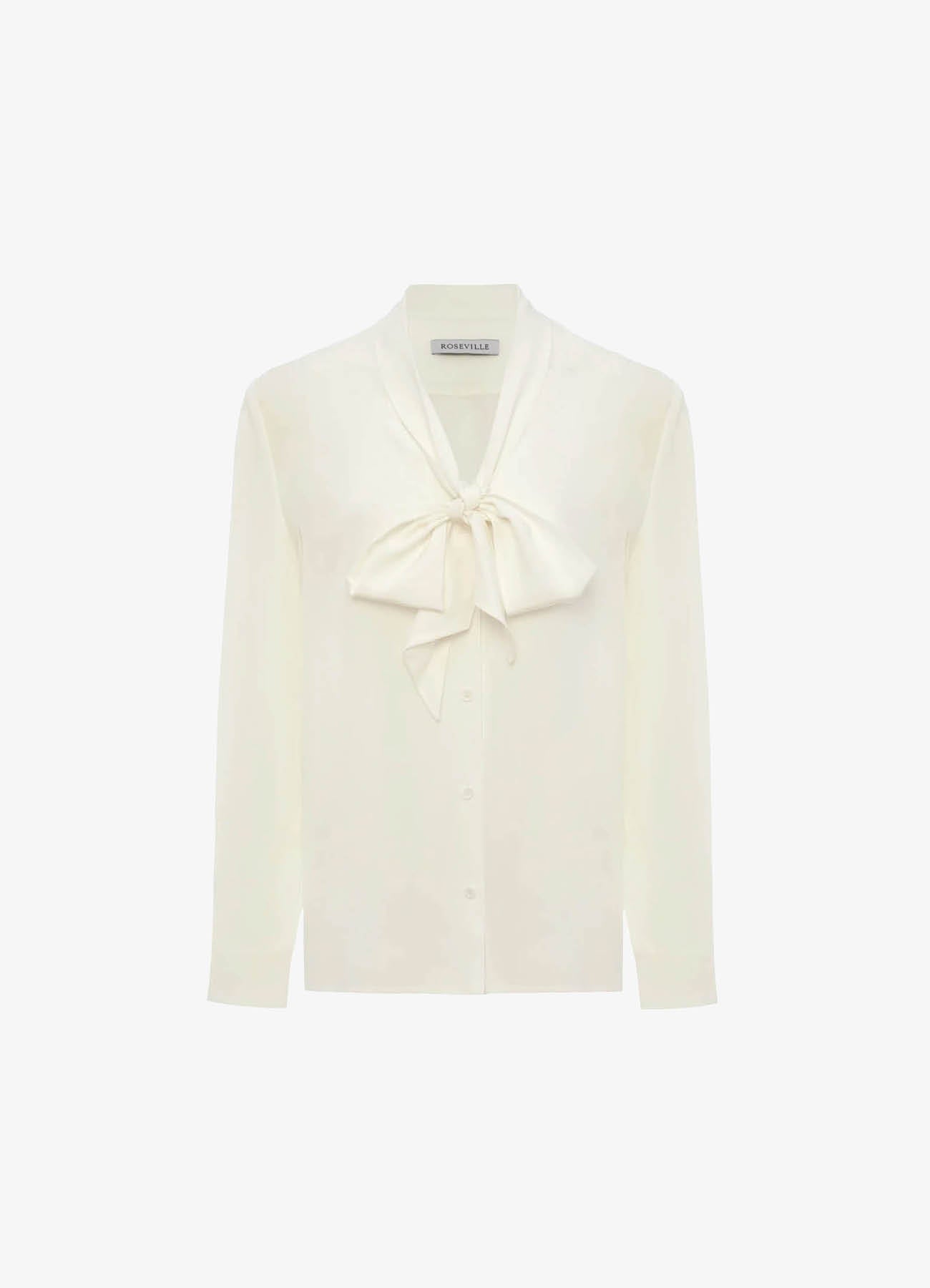 Молочная блуза с лентами на горловине, которые можно завязать в воздушный бант. Модель расслабленного кроя, выполненная из нежного и практически невесомого шелка, сделает романтичным даже самый строгий образ.