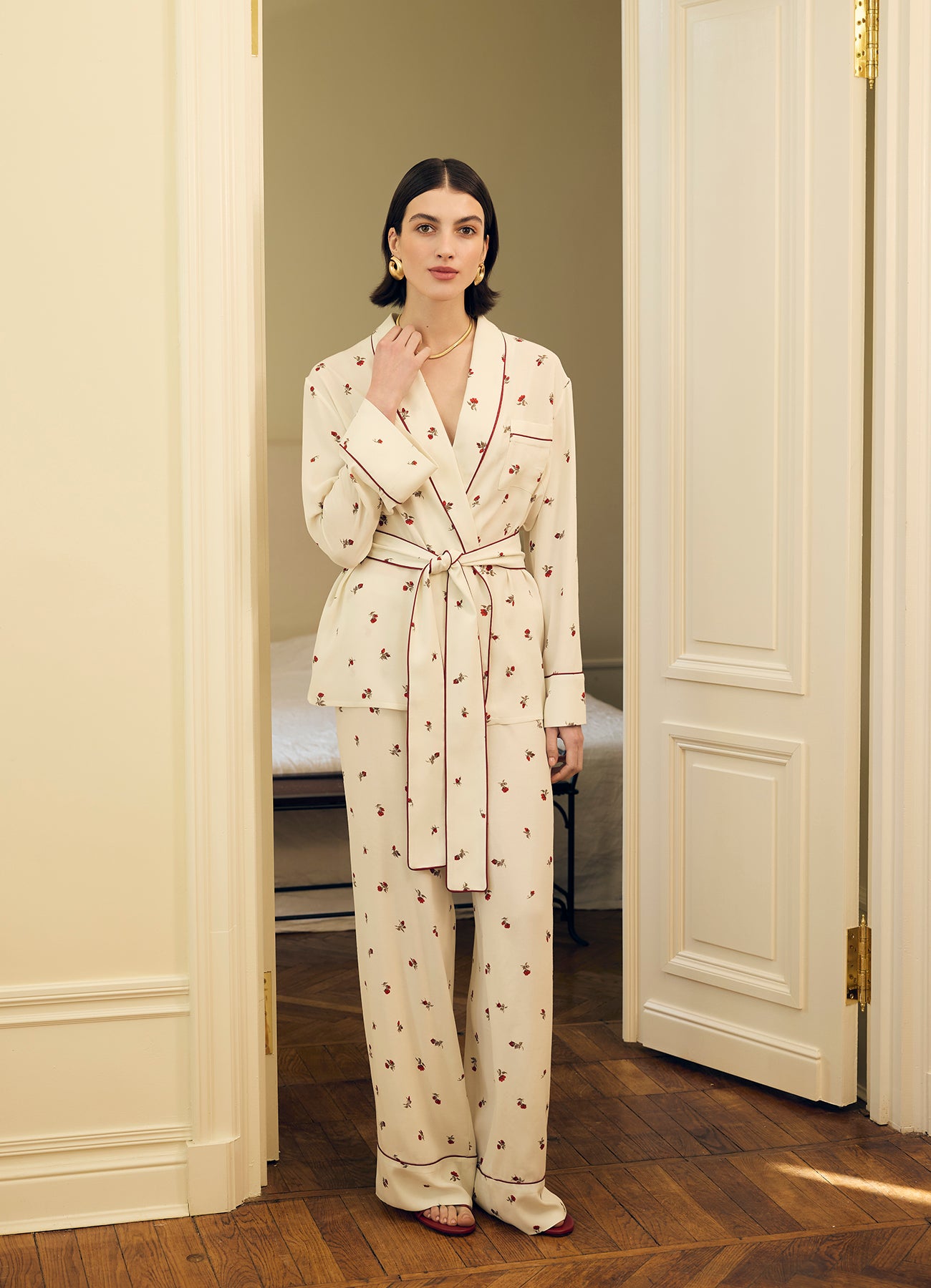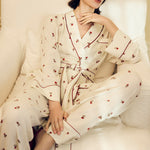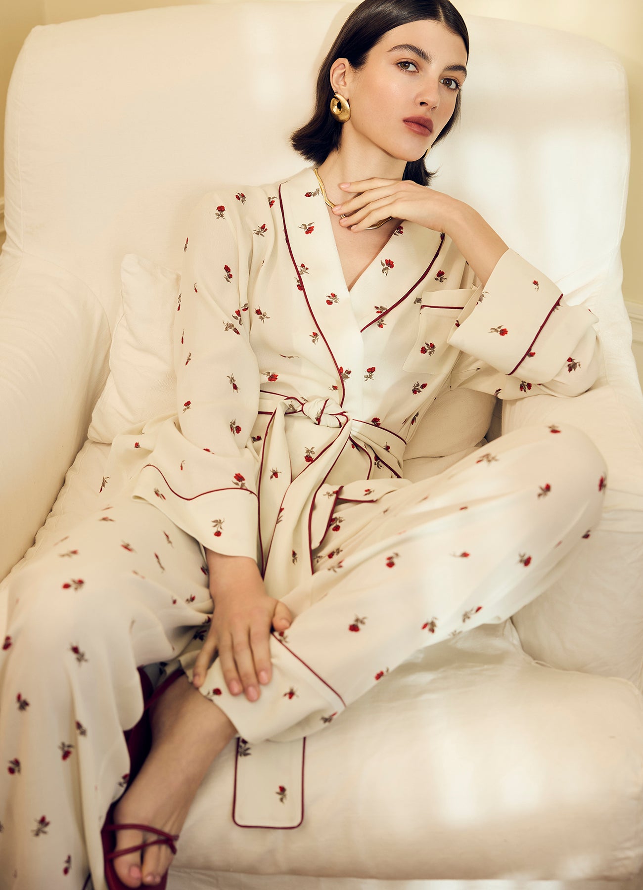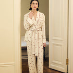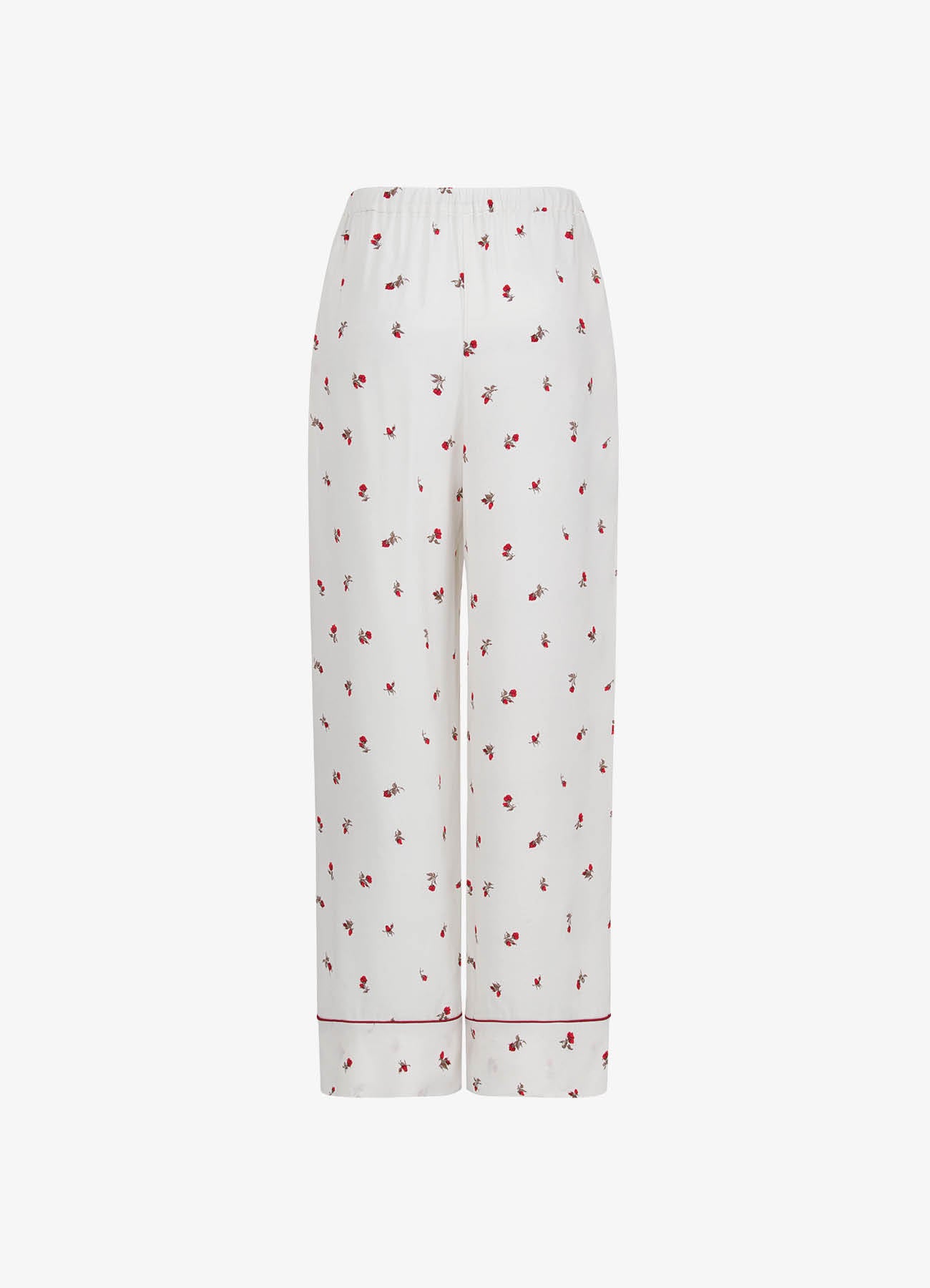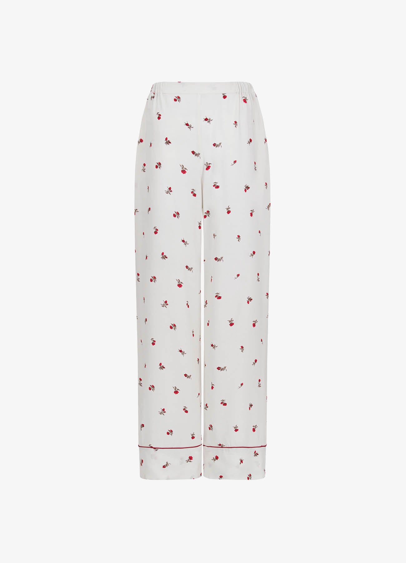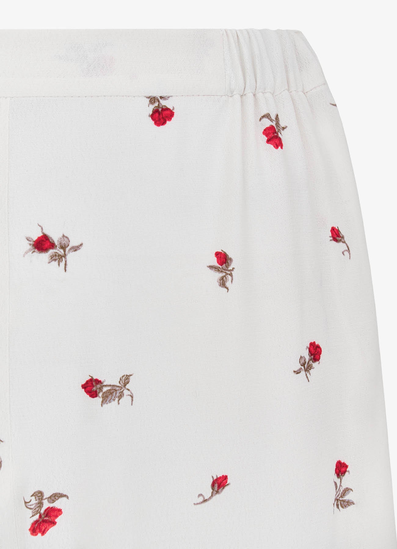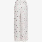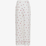 Брюки молочного цвета c принтом в виде роз. Модель в пижамном стиле из мягкой вискозы красиво струится при движении. Комфортная посадка делает модель идеальной как для домашнего отдыха, так и для стильных повседневных выходов. Брюки легко комбинируются с комплектной блузой, а также с топами и жакетами.