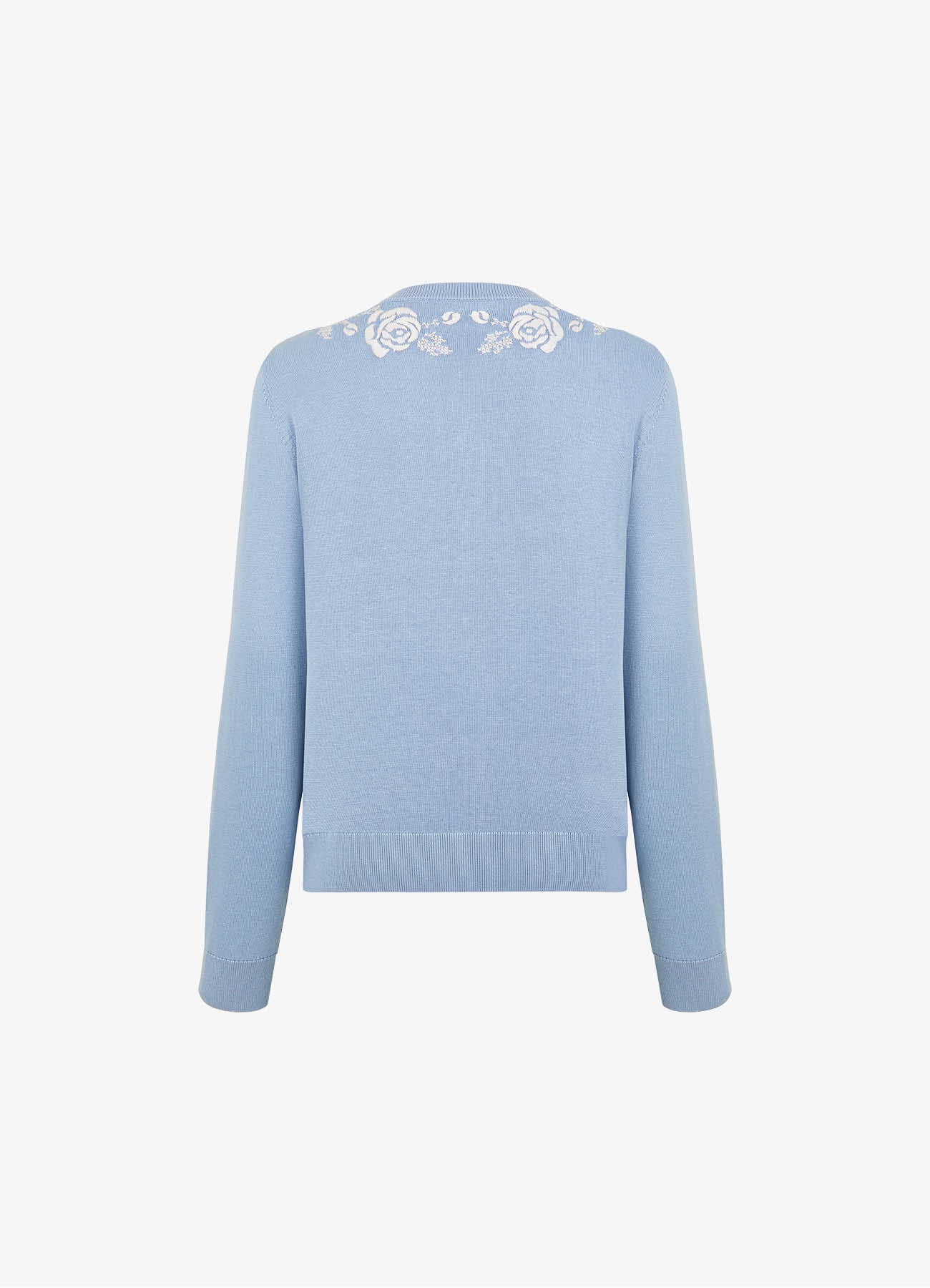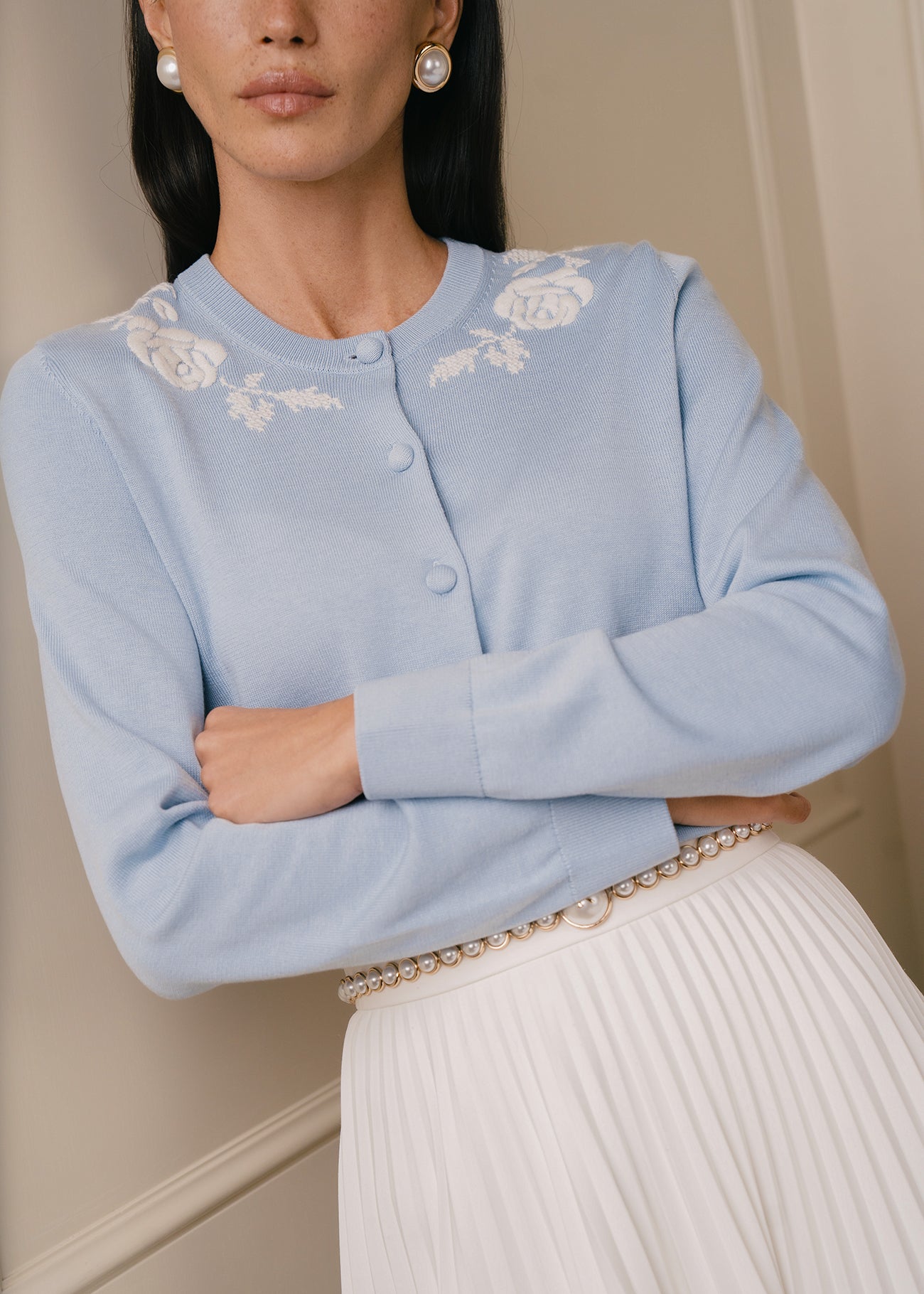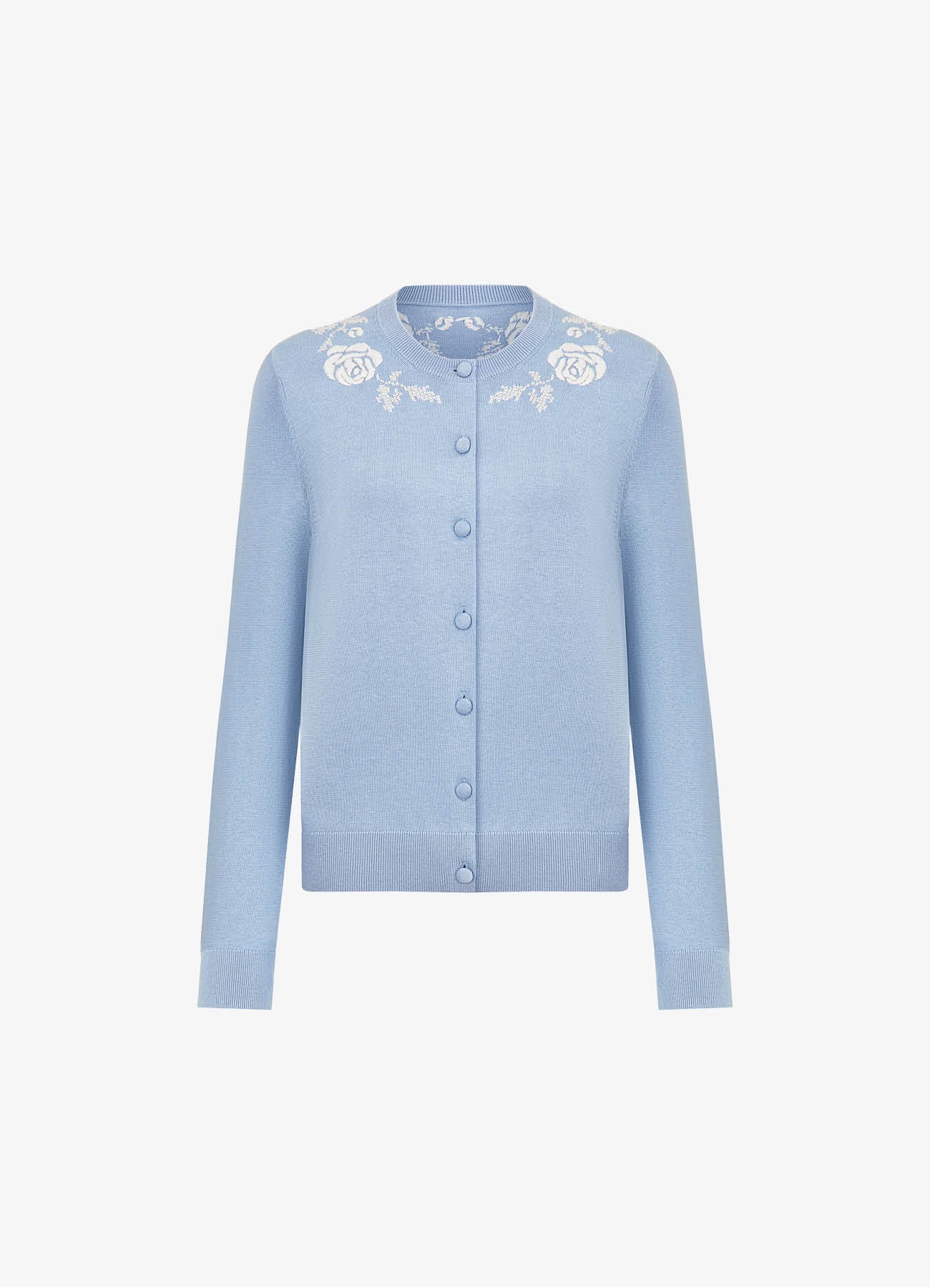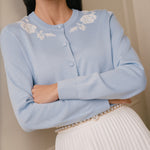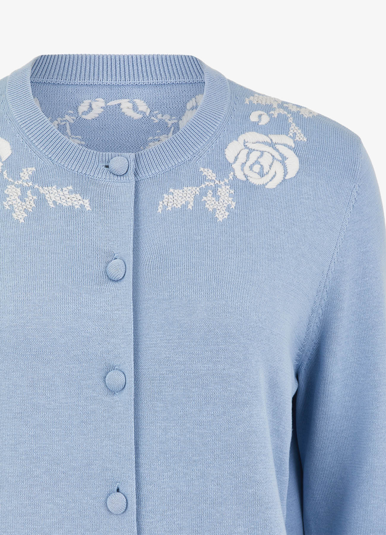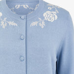 Вышивка в виде объемных фактурных роз выполнена в традиционной русской технике крестика. Контрастная вышитая композиция, расположенная по всей окружности горловины кардигана создаёт выразительный декоративный эффект у лица. Изделие сочетается с юбками и классическими брюками, подходит как для повседневных, так и для более нарядных комплектов.